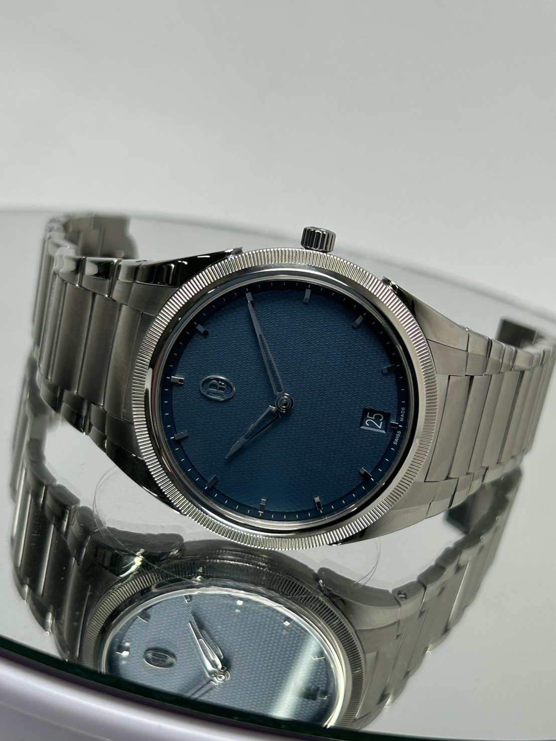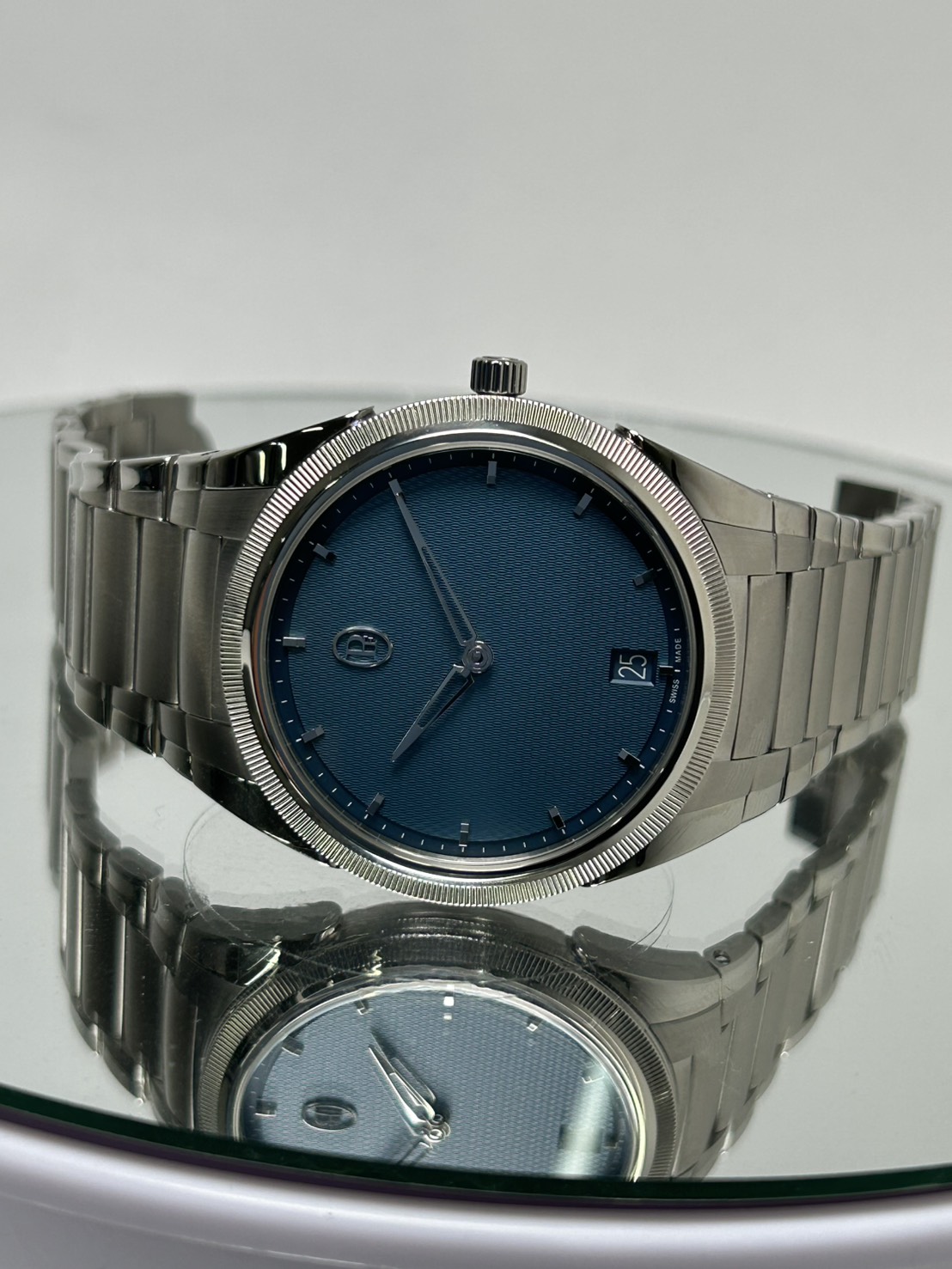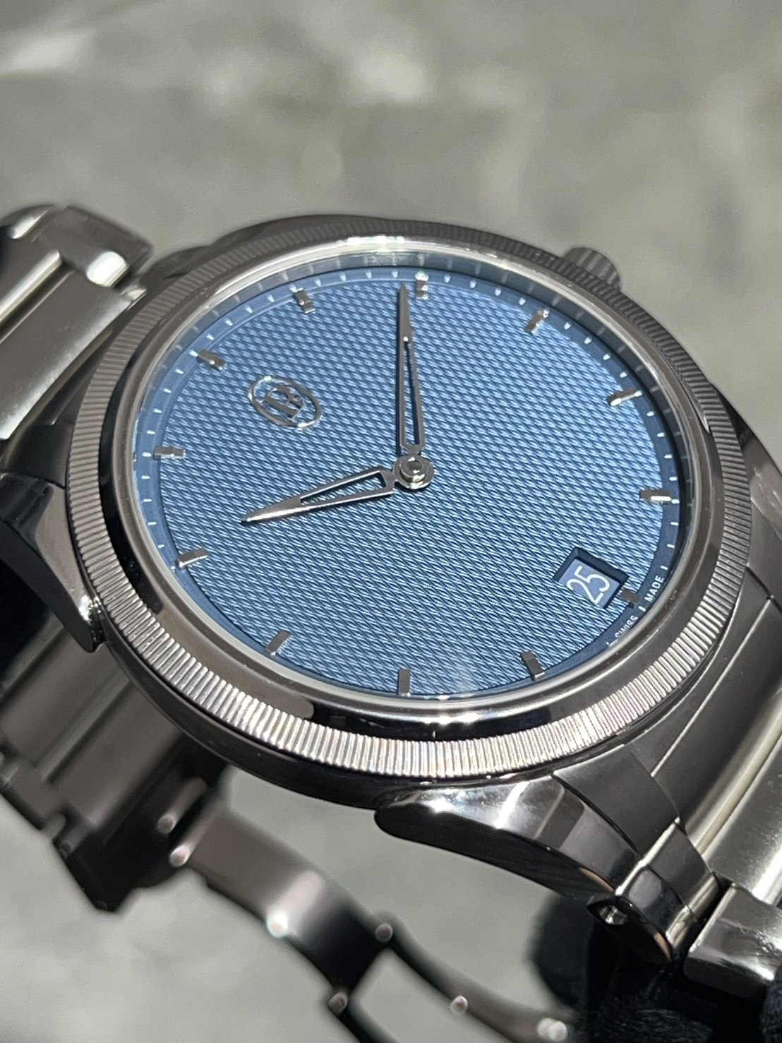 文字盤は淡いブルーで優しい色合いのバーリーコーン(麦の穂)のギョーシェが施されておりインデックスは文字盤を堪能するべく大変短くなっており文字盤内側に向かい傾斜しており独特な柔らかい光の反射をみせてくれます。