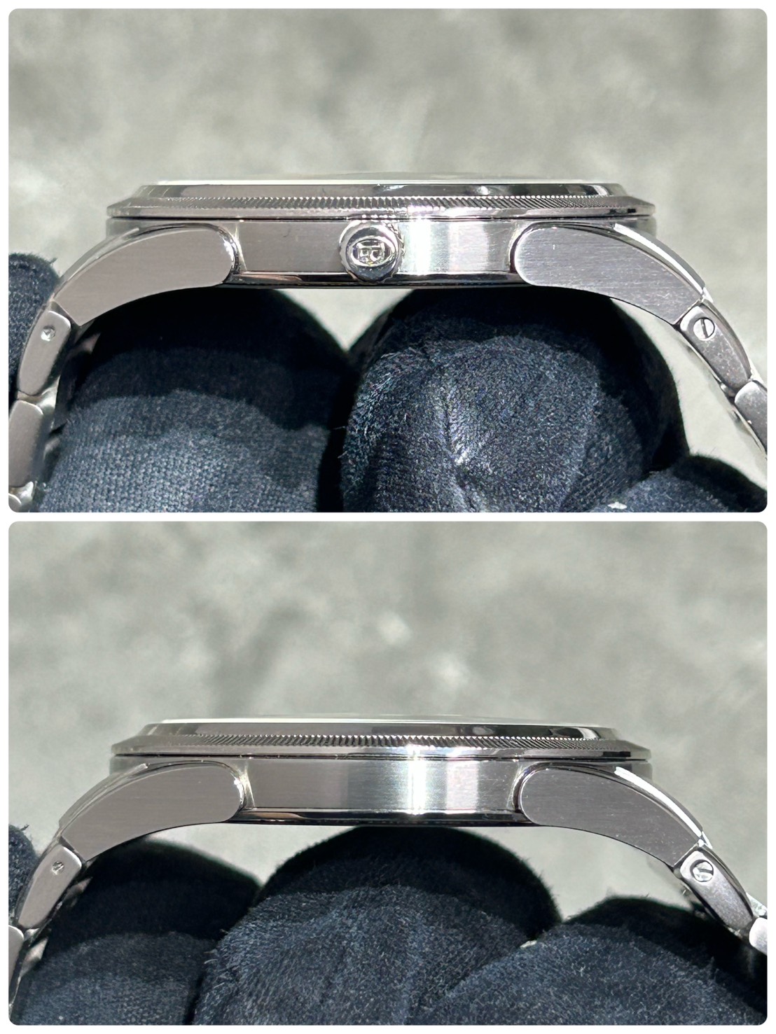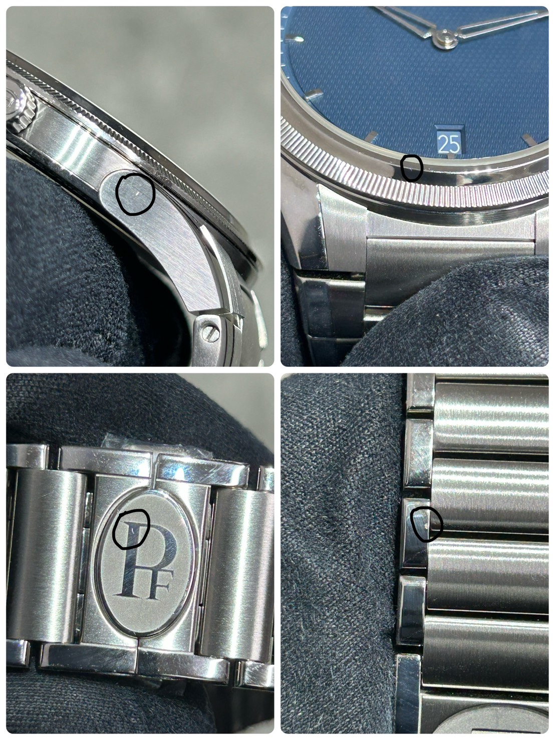 1時側ベゼルに小傷、6時側ブレスに打痕が光に当てるなどすると確認できますが、いずれも肉眼での確認は困難なレベルです。全体的にはコンディションの良い個体でしたので中古美品として出品させて頂きます。