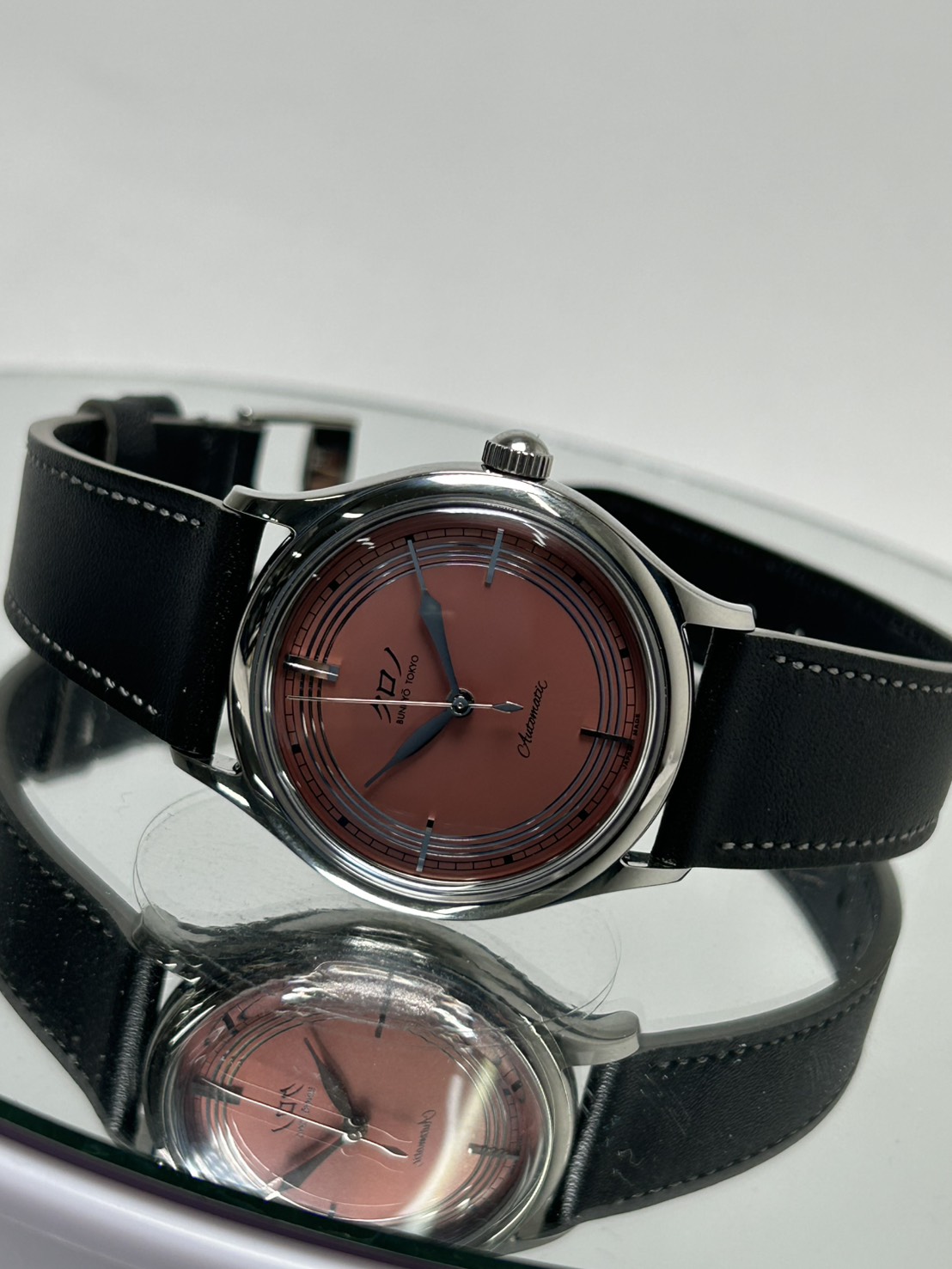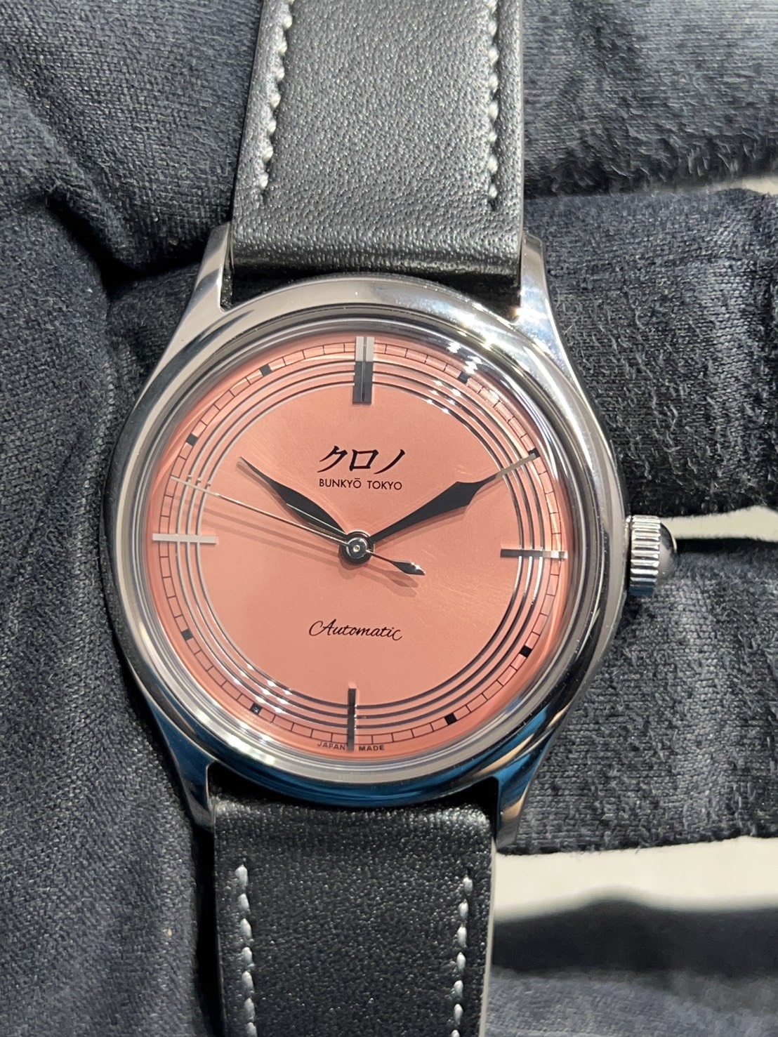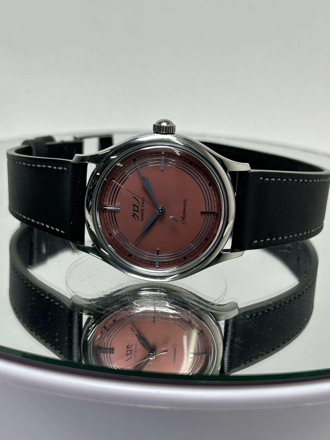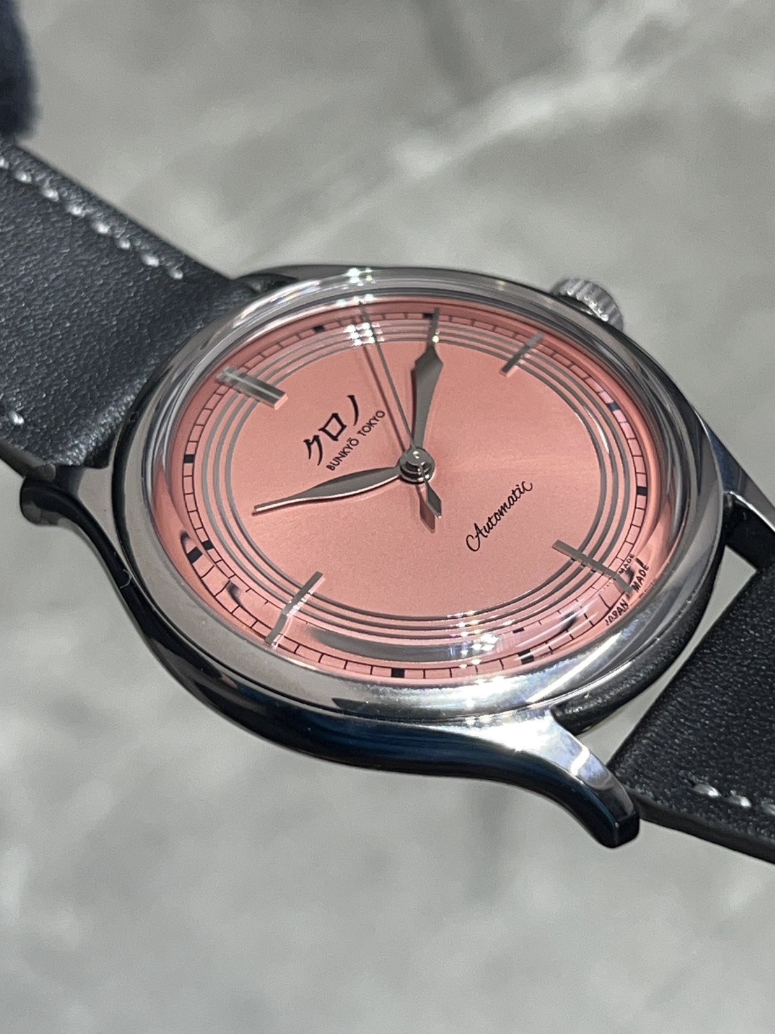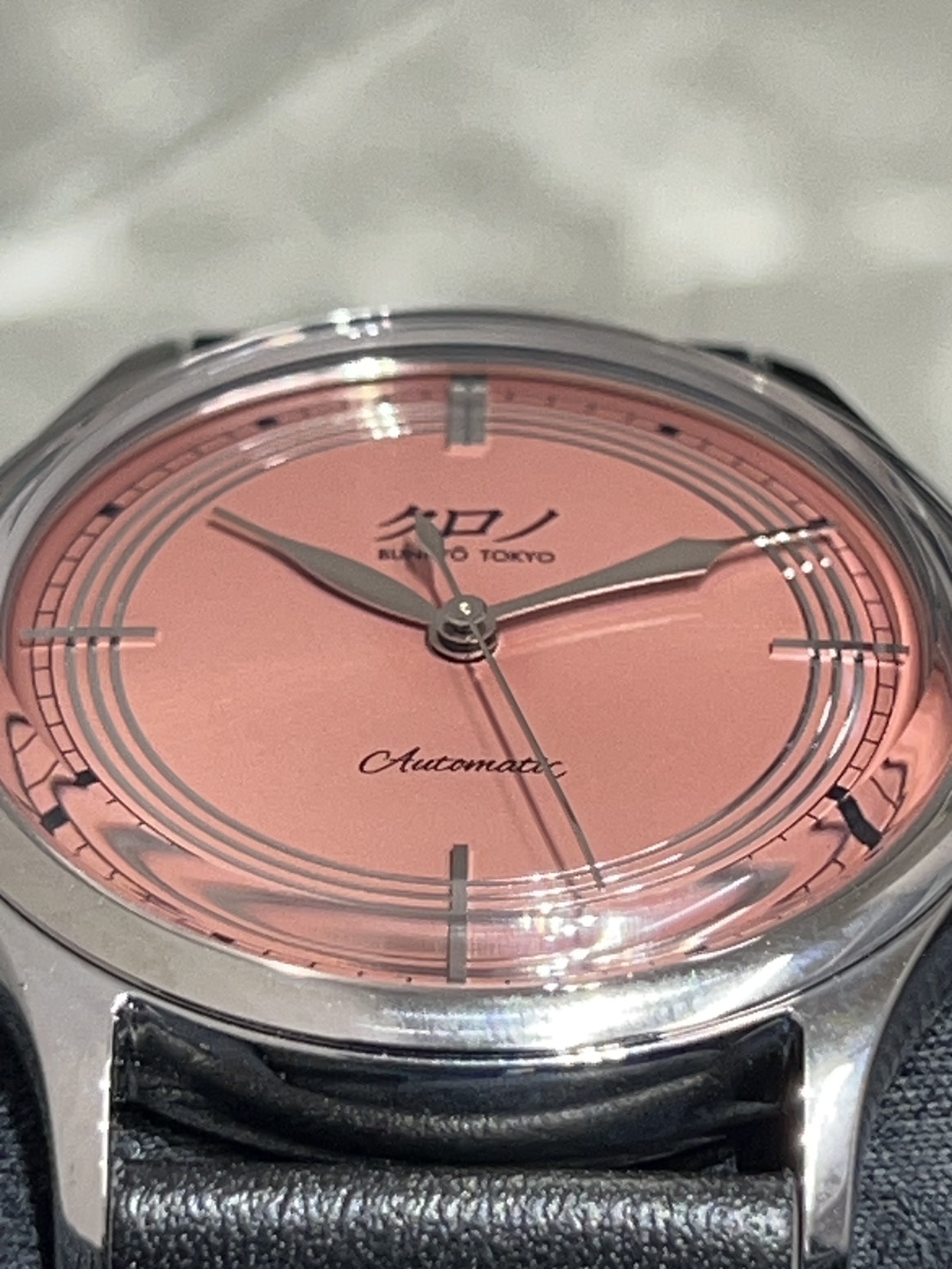 大空を飛ぶ朱鷺の羽をイメージしたダイヤル、日本特有の桃色をイメージし膨大な数の色見本から完成させたこだわりのダイヤルとの事。