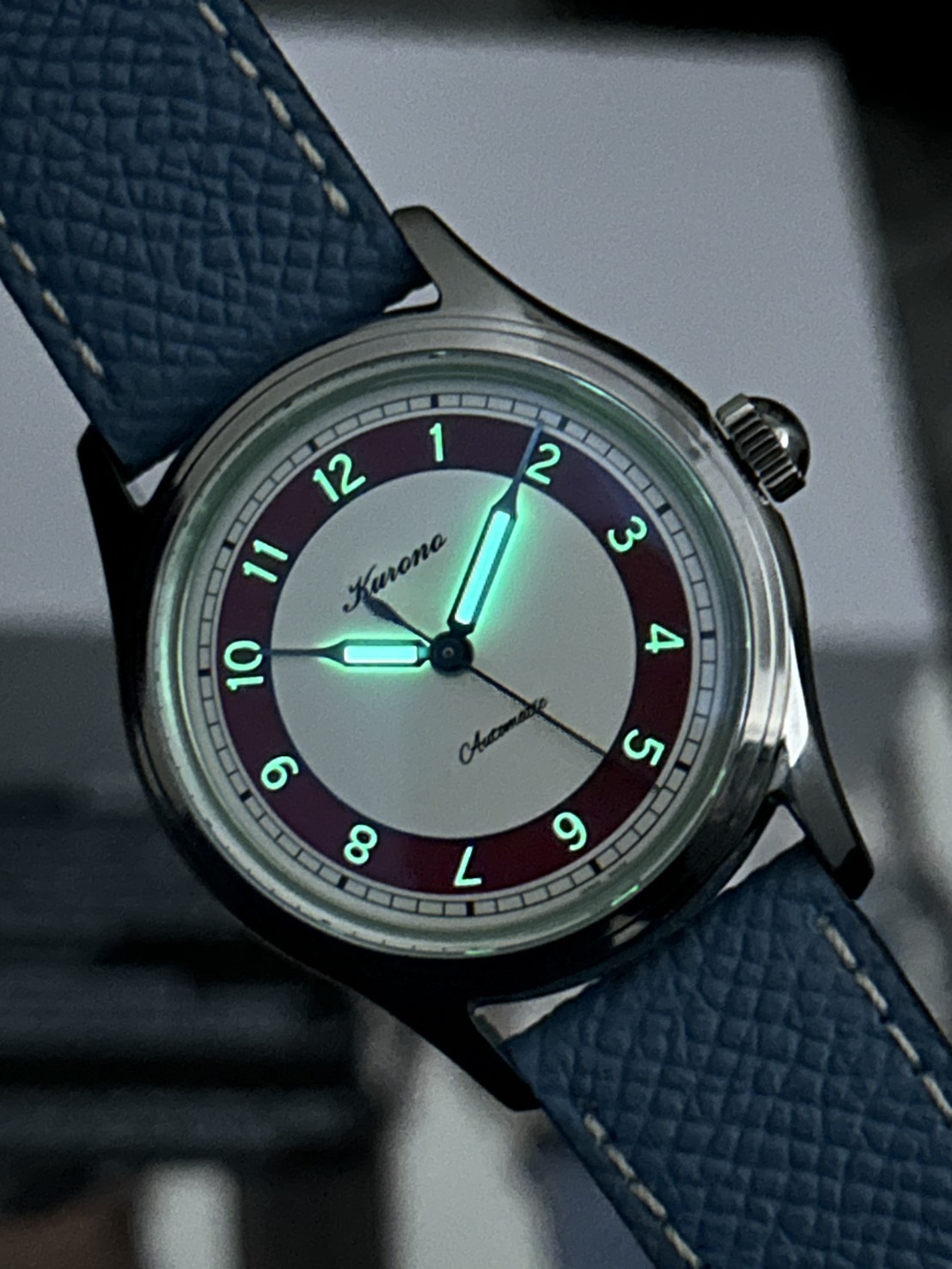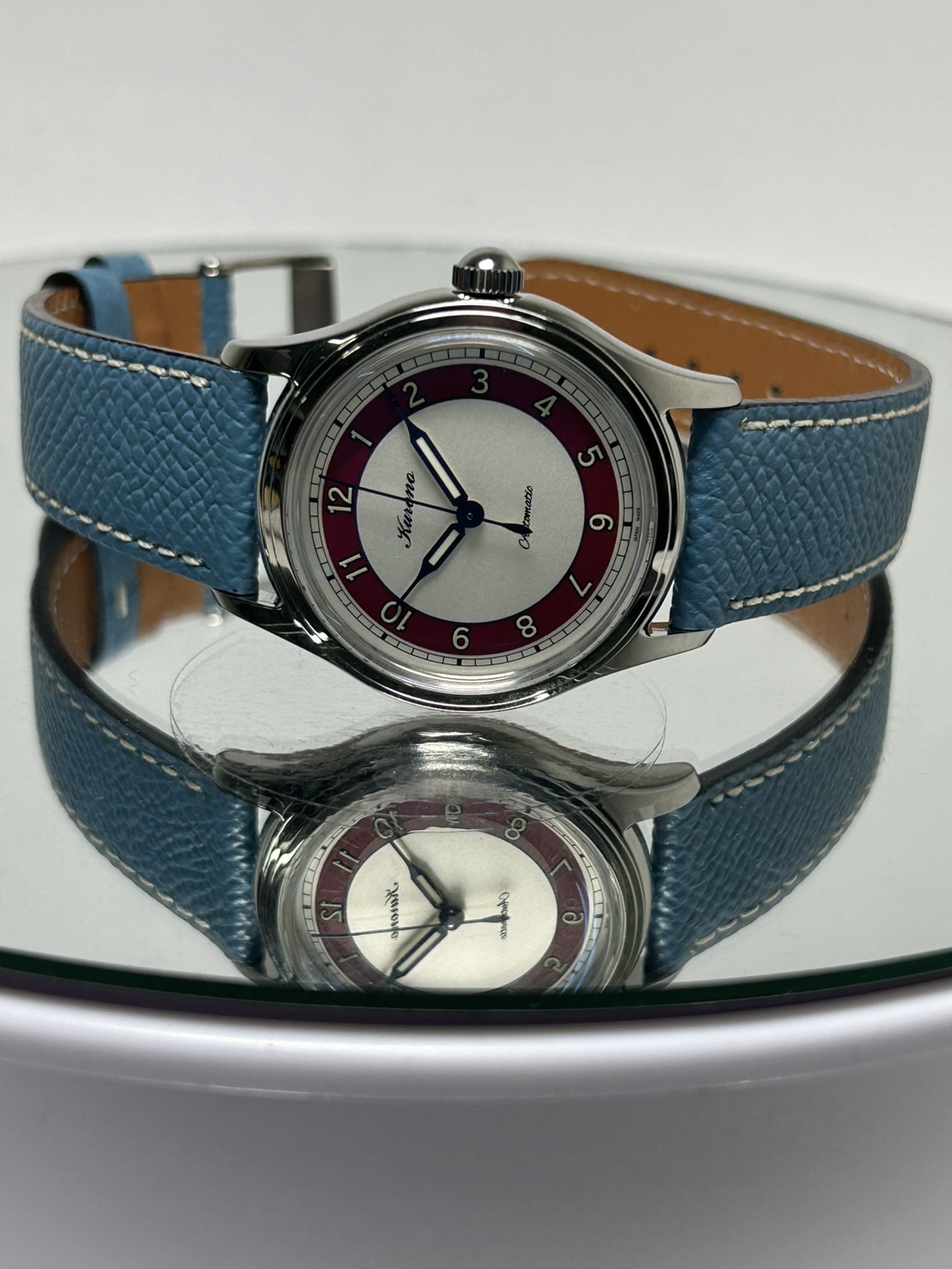 丸形のかわいらしい34.00㎜のケースにセクターダイヤル、時分針、アラビアインデックスには夜光がついている美しいモデルでございます。