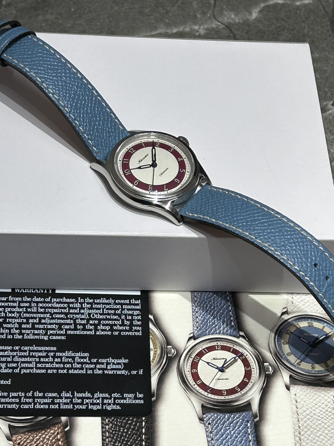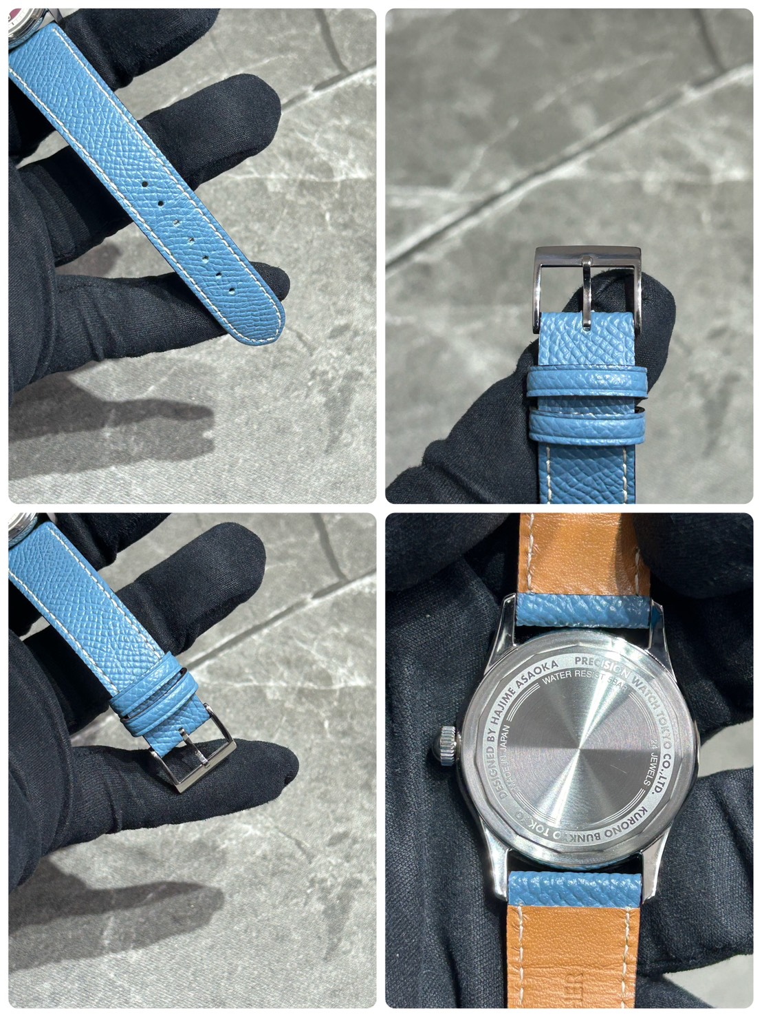 34.00㎜のかわいらしいケースにブルーのカーフレザー、大変上品で美しいモデルでございますので是非この機会にご検討宜しくお願い致します!