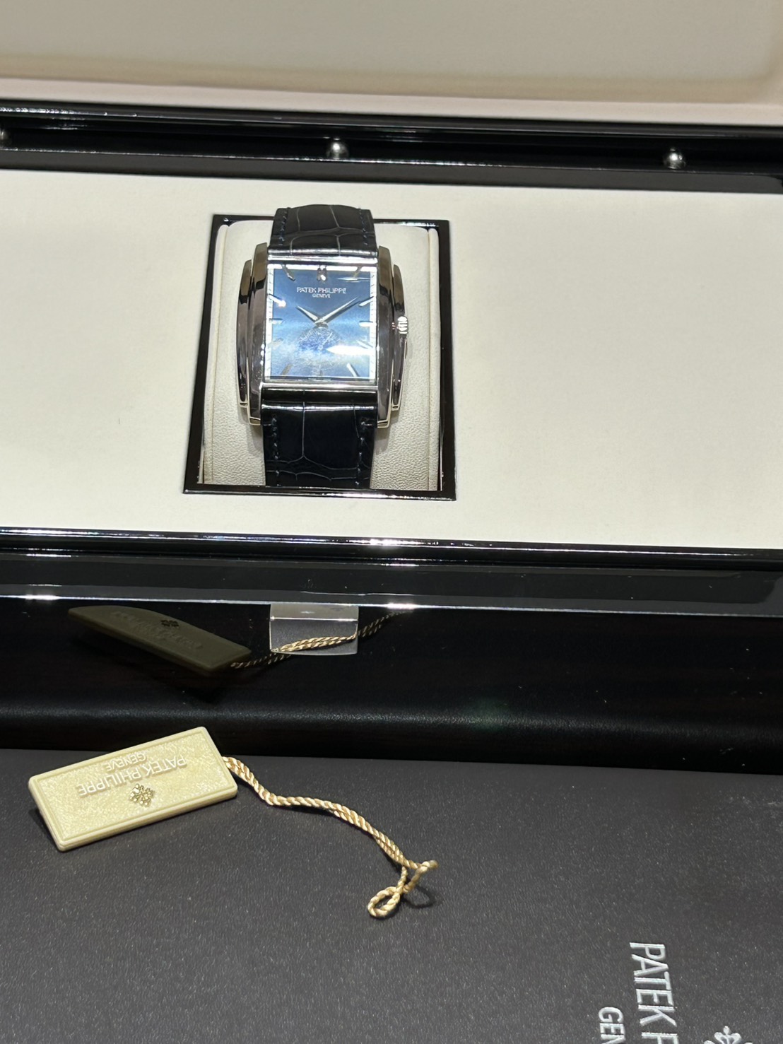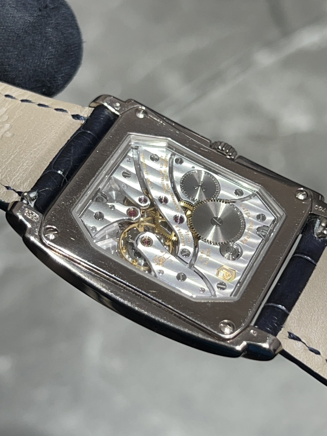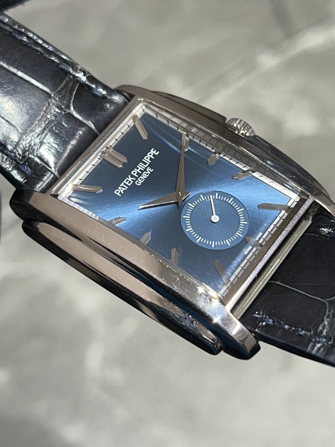 ホワイトゴールドのレクタンギュラーケースに、美しいブルーのサンレイダイヤル、光を反射するインデックスで高貴な雰囲気に溢れております。