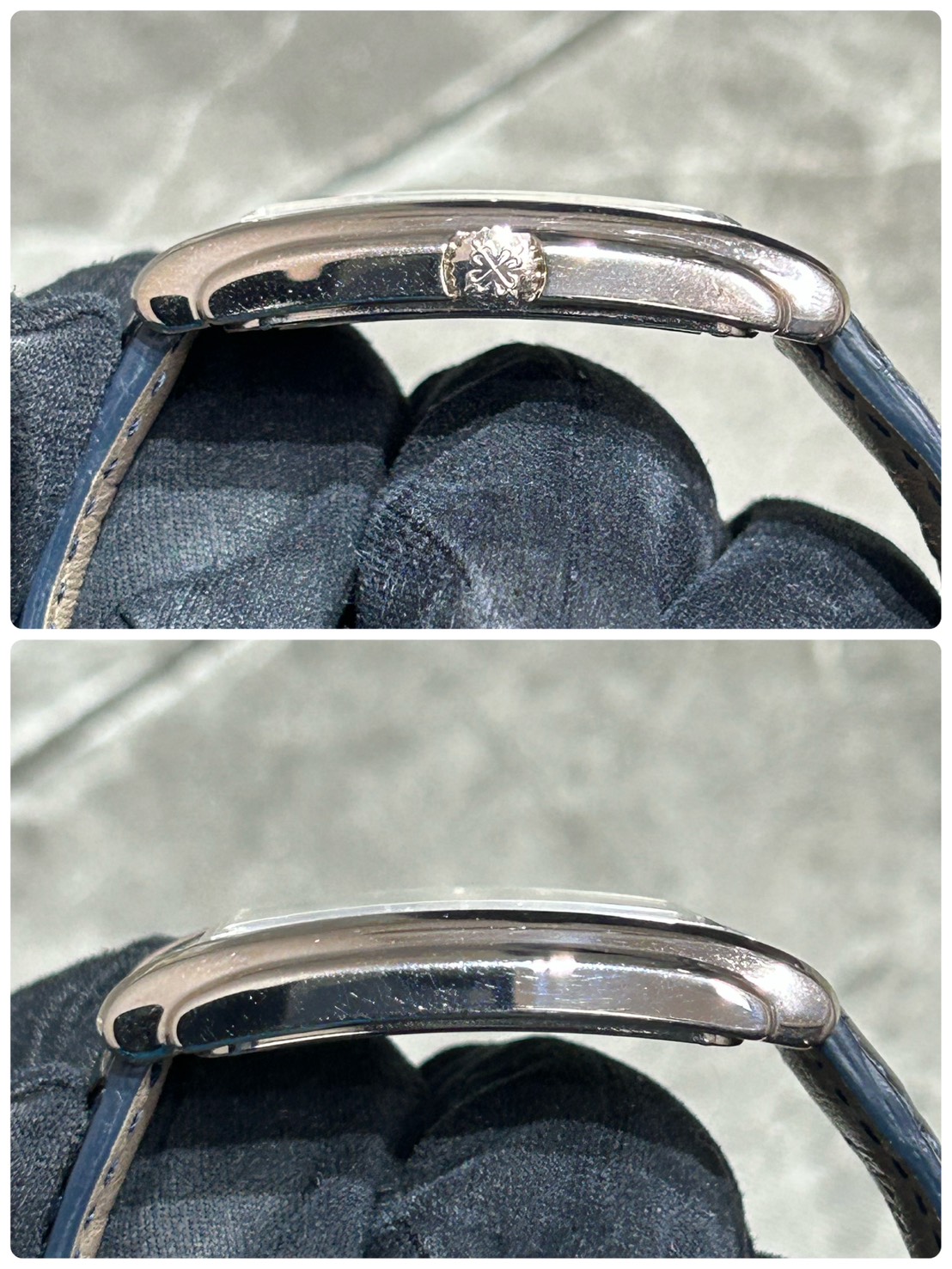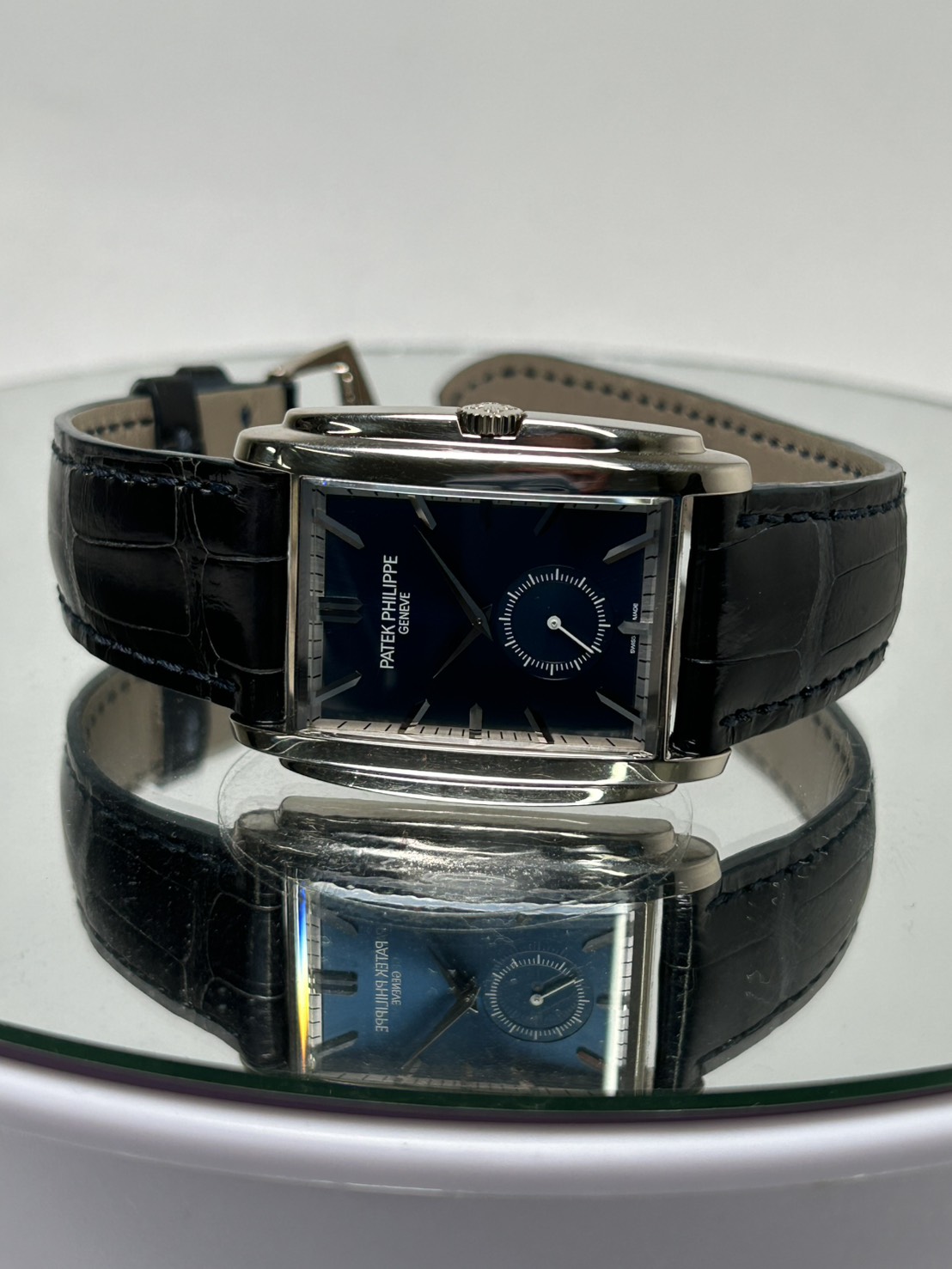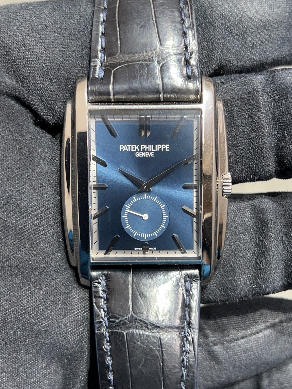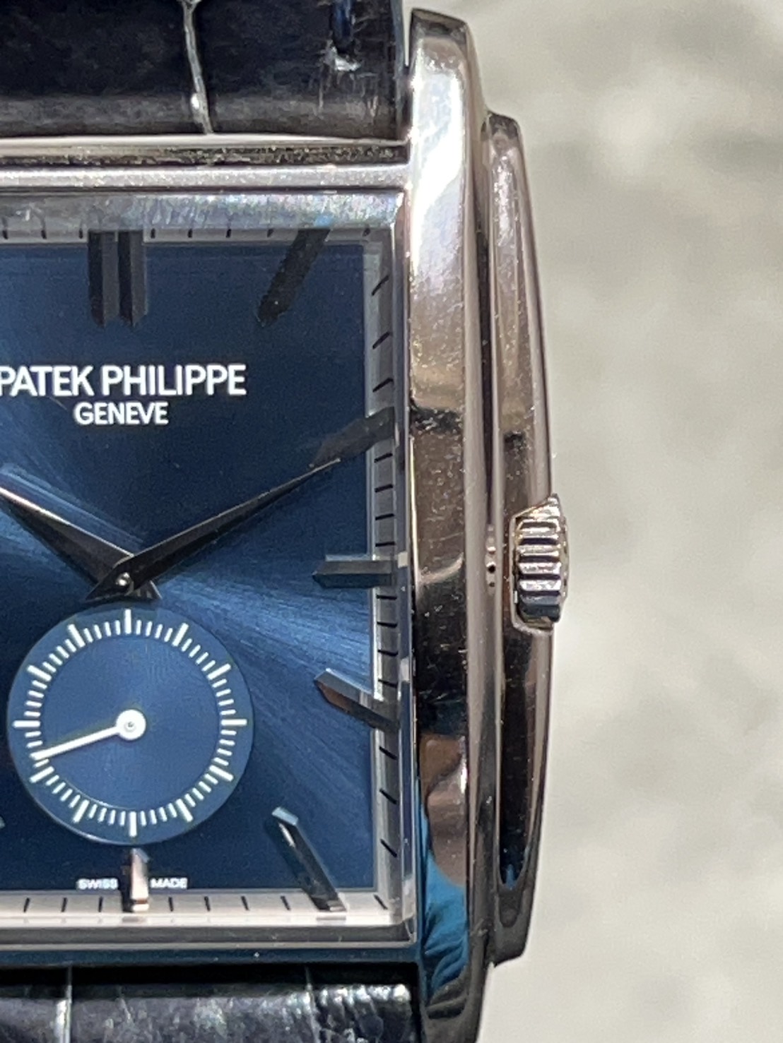 ホワイトゴールドのレクタンギュラーケースに、美しいブルーのサンレイダイヤル、光を反射するインデックスで高貴な雰囲気に溢れております。
