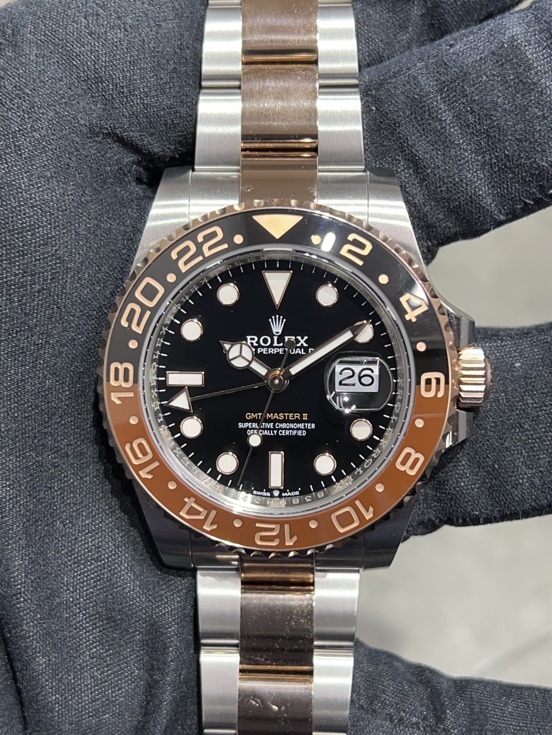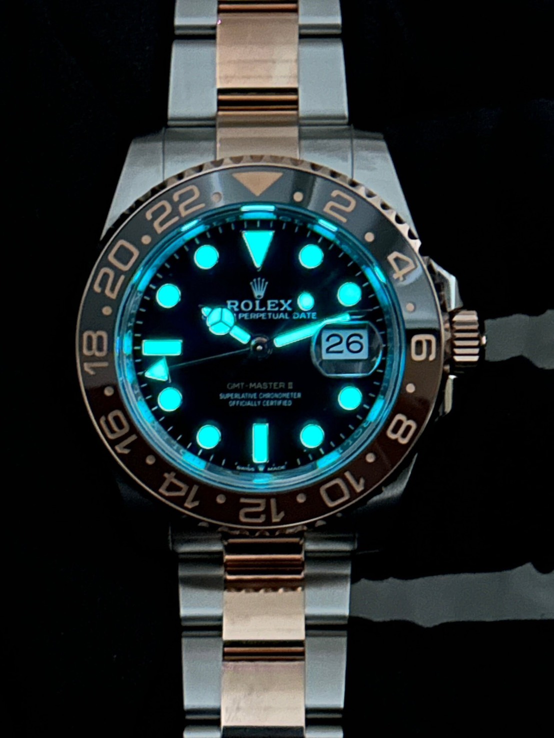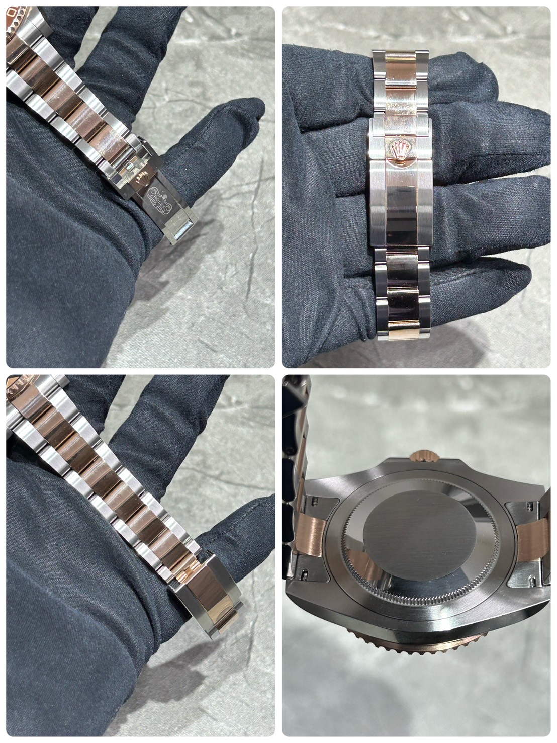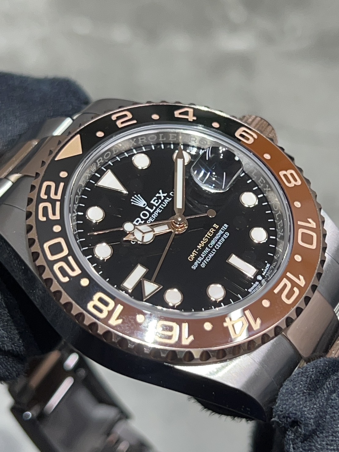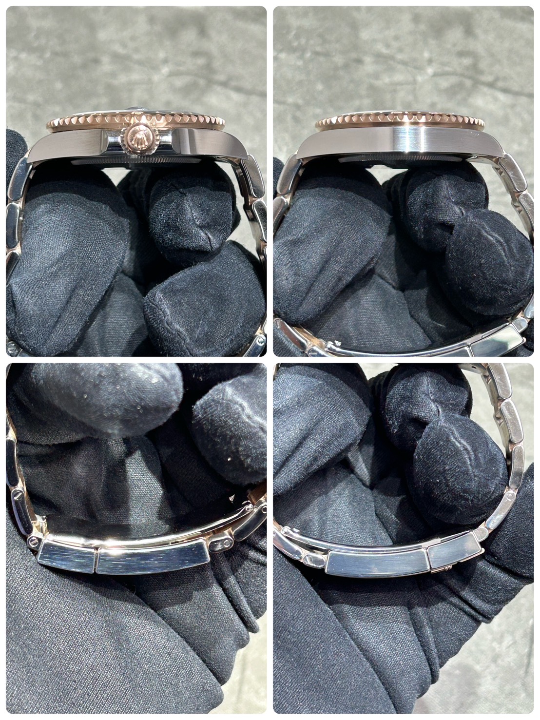 ツートーンベゼルの光沢に漆黒の文字盤の中に佇むインデックスや針の縁に装飾されたローズゴールド色の光の反射が鮮やかでスタイリッシュな個体でございます。