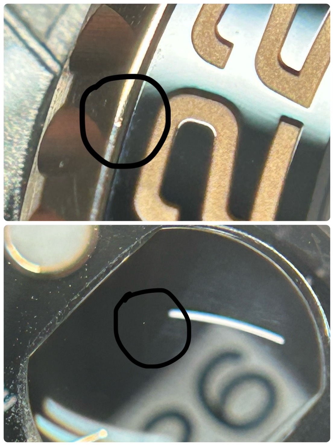 ご愛用に伴うスレが全体的にあり、2時側ベゼルに光に当てれば分かる小傷(極小打痕?)とサイキュロップレンズに肉眼での確認が難しいレベルの埃の混入ががございますが目立つものではなく全体的にコンディションの良い個体になりますので中古美品での販売とさせて頂きます。