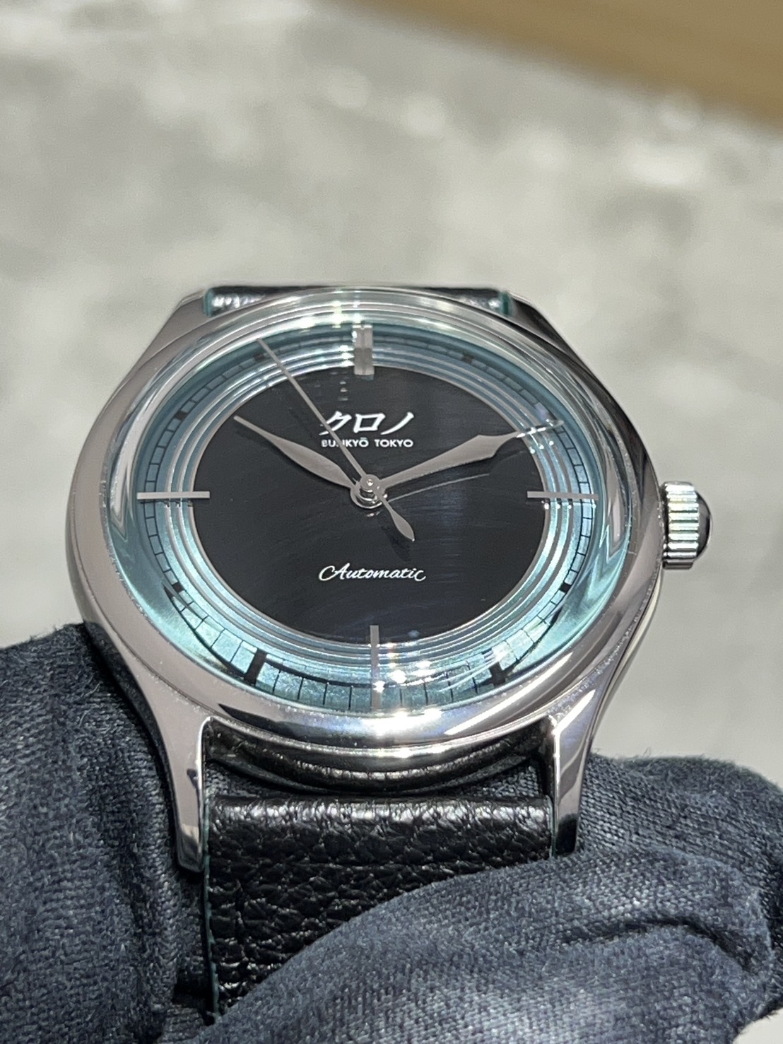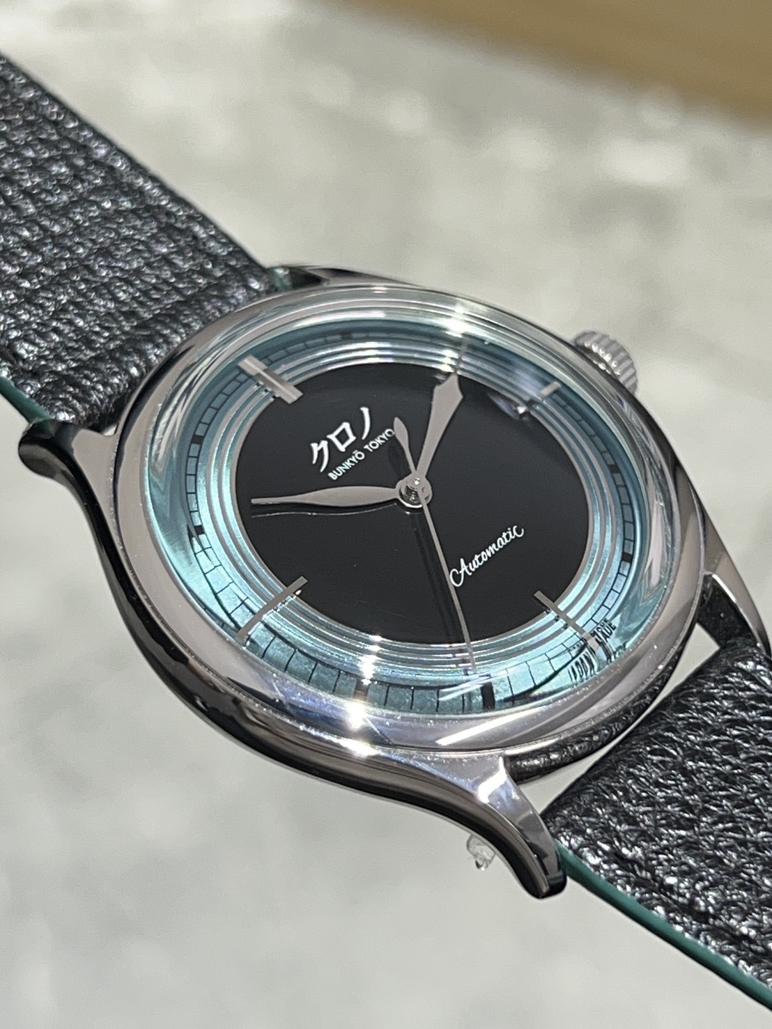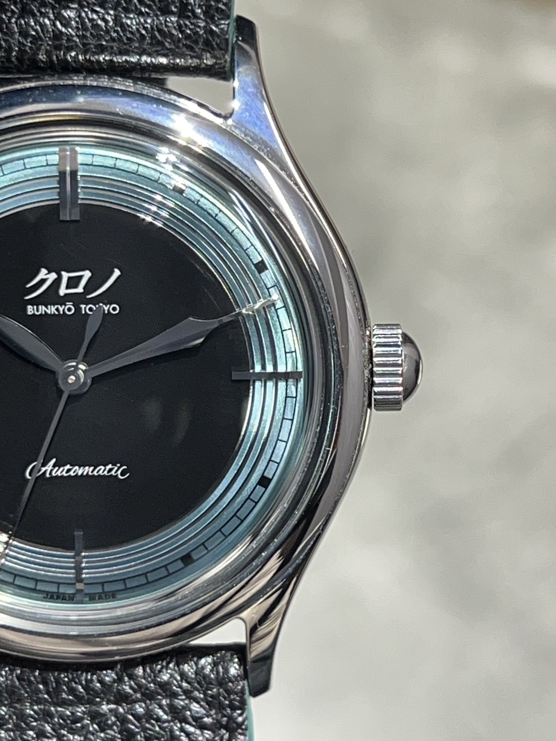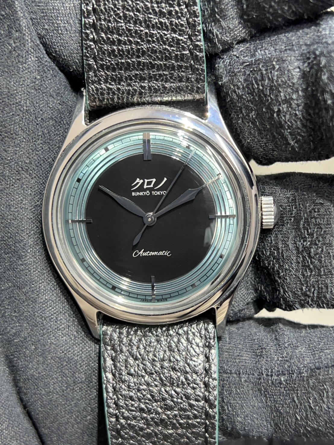 ステンレス製37㎜ケースにボックス型サファイアクリスタルなどクロノトウキョウお馴染みのクラシックフォルムとなっており、文字盤外周のメタリックグリーンは福島県の五色沼湖沼群の瑠璃沼に着想を得たもので、立体感のある非常に美しいダイヤルとなっております。