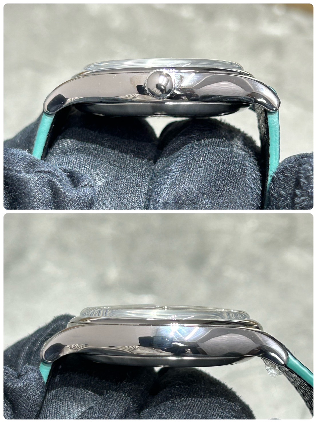全体的にご愛用に伴う微細なスレがうっすらと確認でき、ラグにストラップ交換の際についたと思われる微細なスレ傷が確認できますがストラップも目立つダメージがなく全体的に非常に綺麗だったため中古美品として出品させて頂きます。