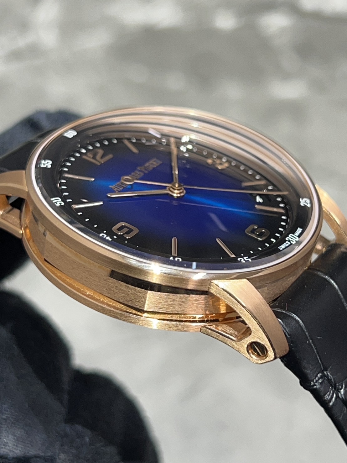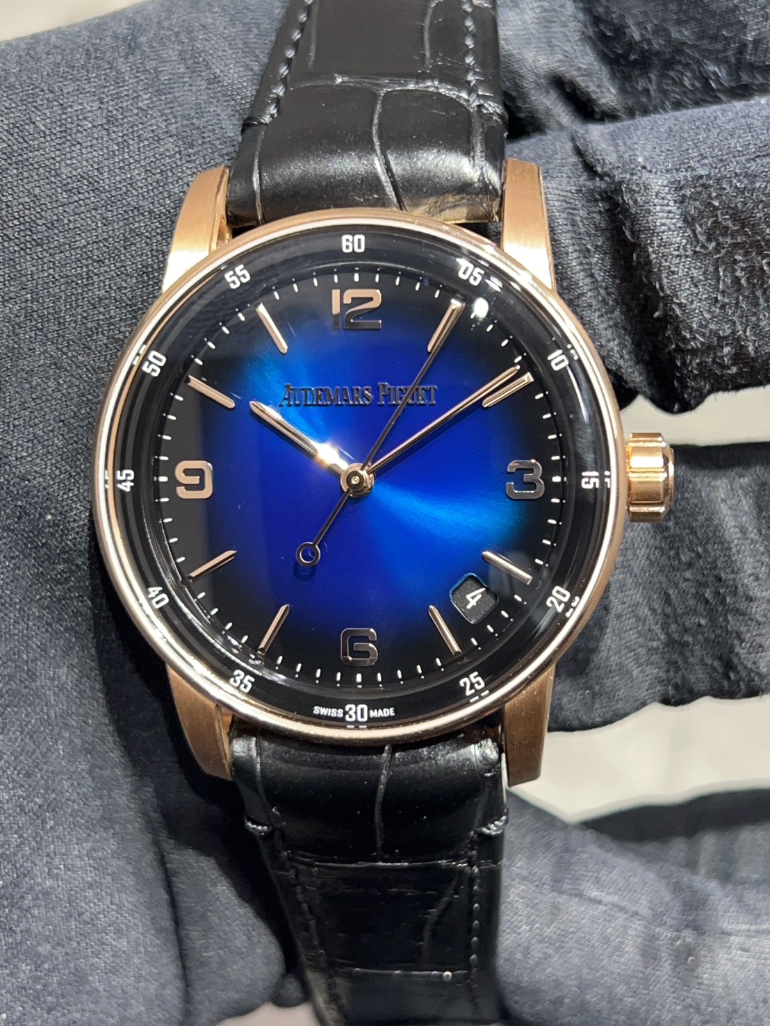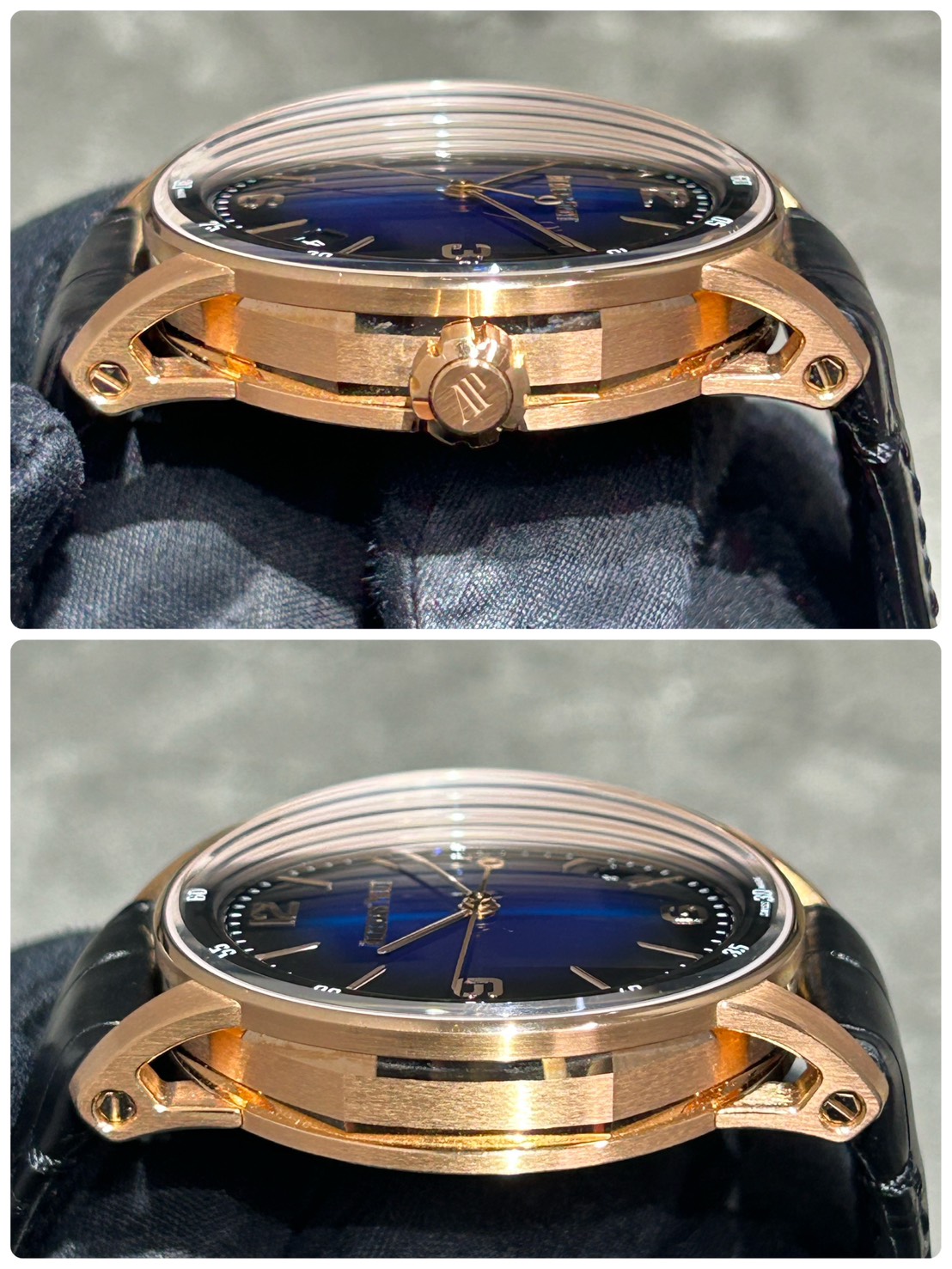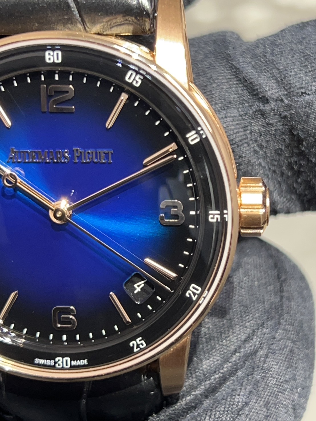 説明不要の大人気のブルー文字盤でございます!ピンクゴールドと鮮やかなブルー文字盤の組み合わせがとても妖艶です。