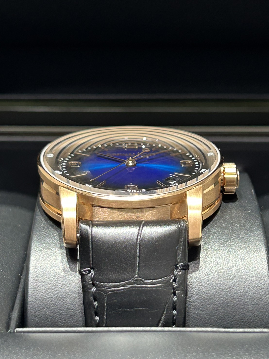 斜めの角度から文字盤を見ると湾曲したガラスが波状に見える姿は他の時計には見られない唯一無二の時計と言えるでしょう。
