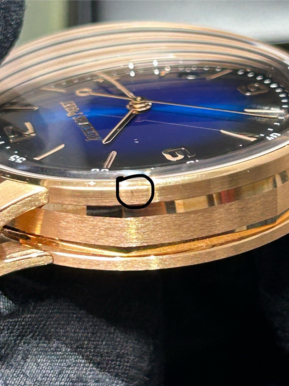 全体的にご愛用に伴う微細なスレが確認でき、ケースサイドにルーペで見れば確認できるレベルの極小の打痕がございます(肉眼では本当に目立たないです)がストラップも非常に綺麗で全体的に良好なコンディションだったため中古美品として出品させて頂きます。