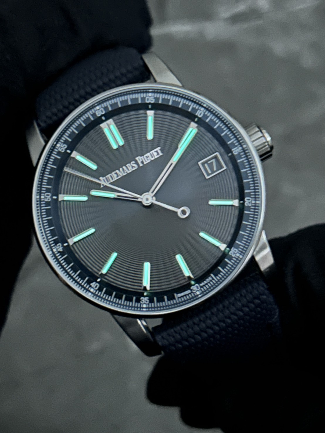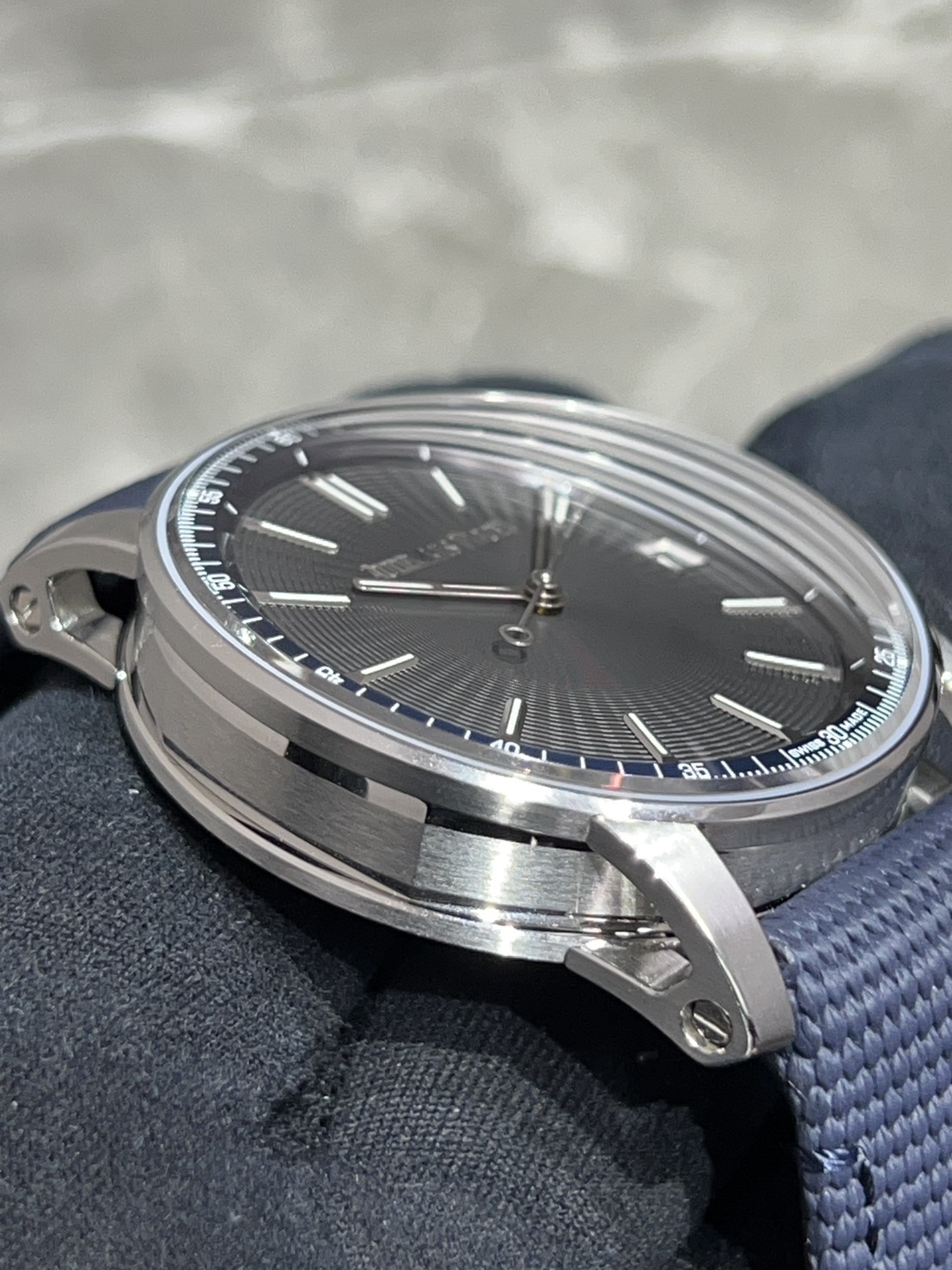 エンボス加工の施されたグレーダイヤルは落ち着きのあるシックな雰囲気となっており、蓄光処理を施したホワイトゴールドのアワーマーカーと針が高級感を醸します。