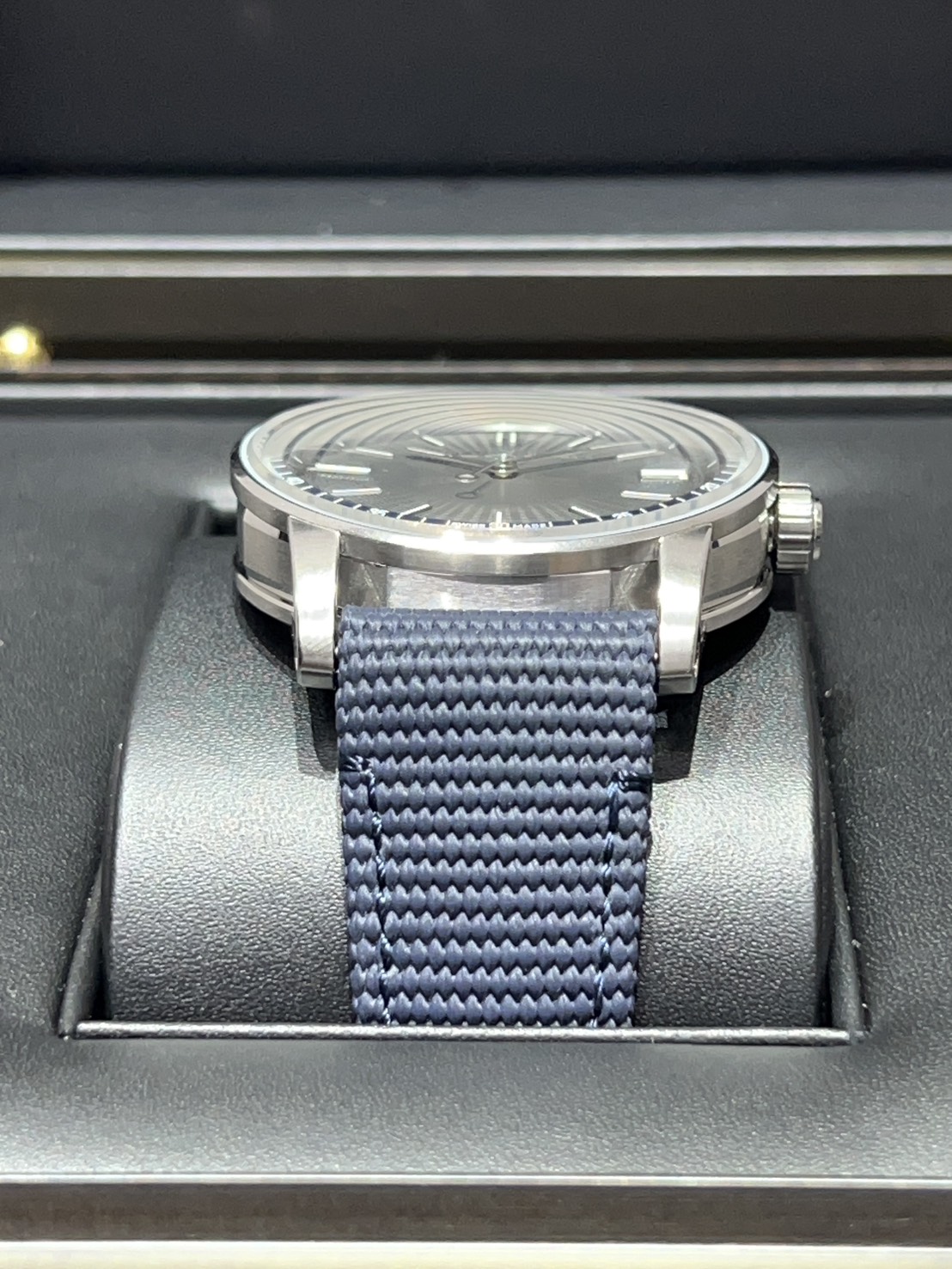 ガラス内部に見えるインナーベゼルはブルーとなっており大変スポーティな印象となっております。