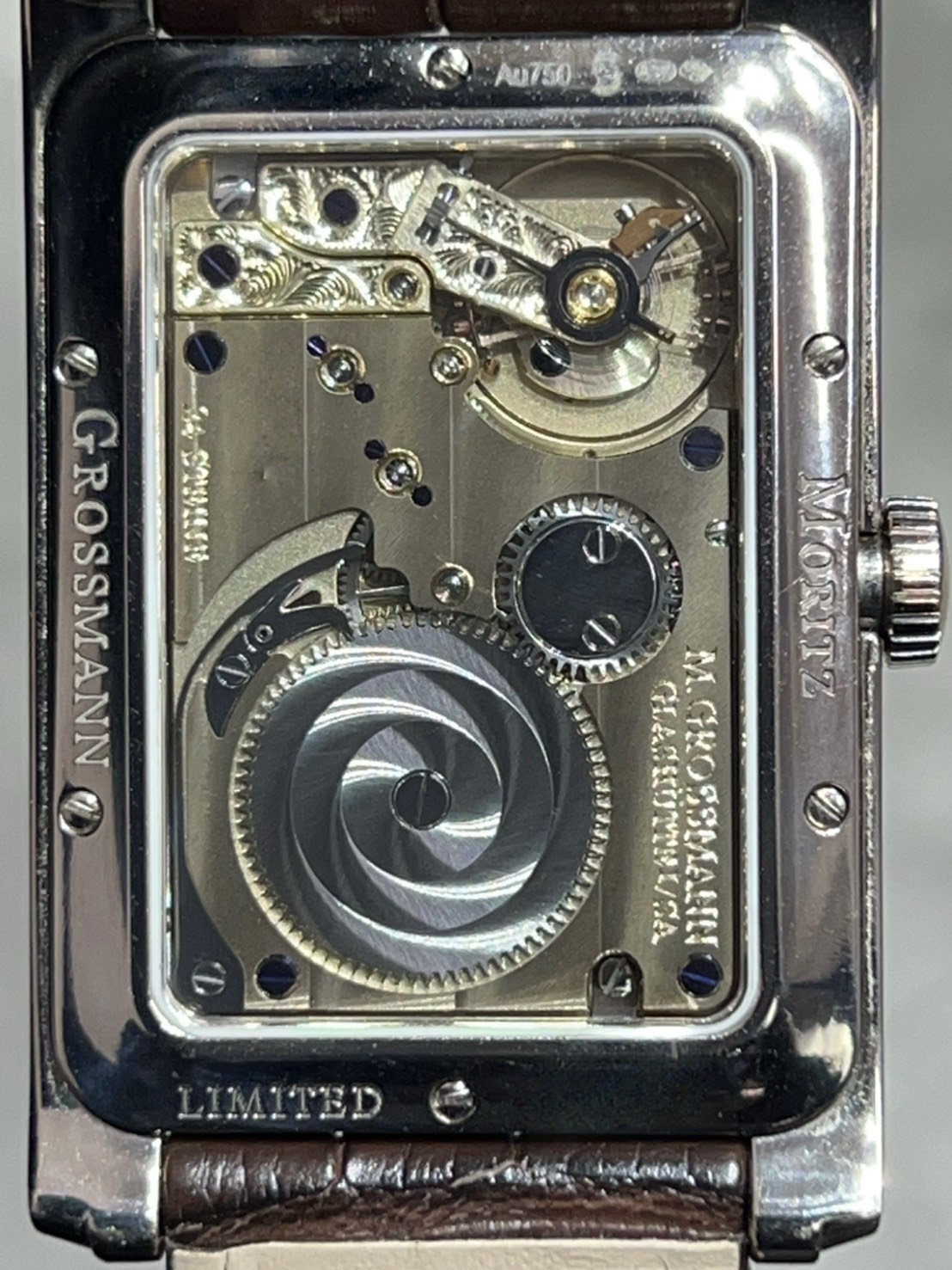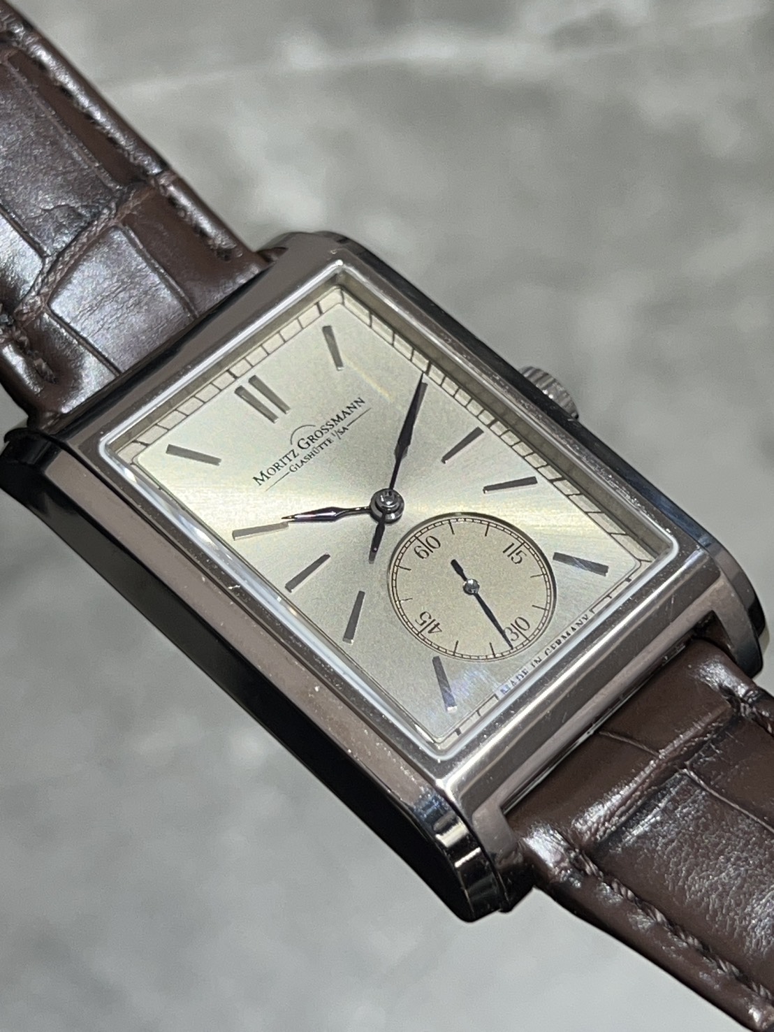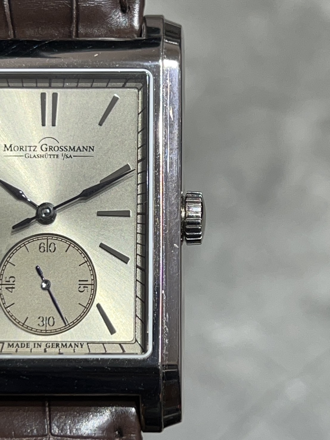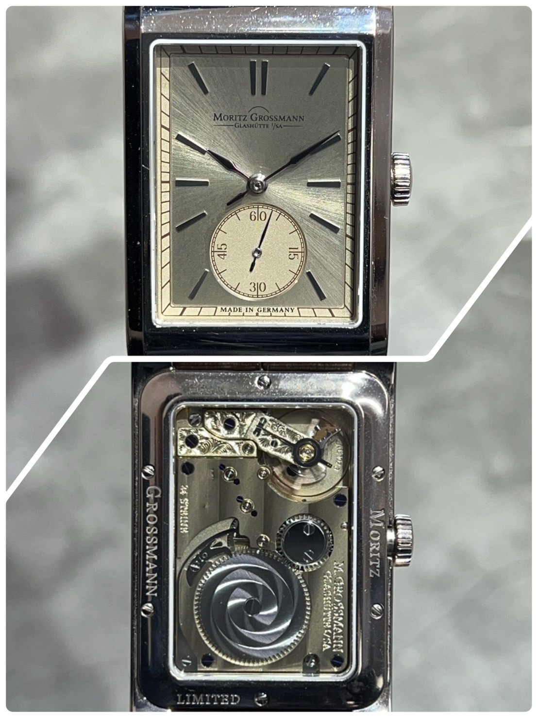 角型ムーブメントは汎用性が低いため、本格機械式ブランドでも作っているところは少なく大変希少な存在でモリッツグロスマンのこだわりが感じられるモデルでございます。