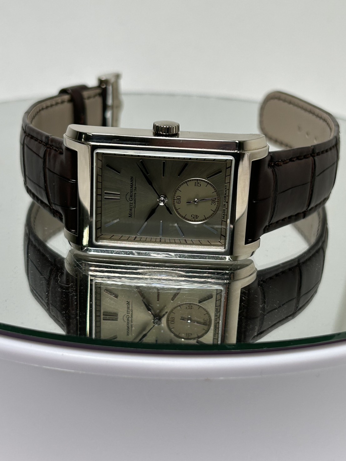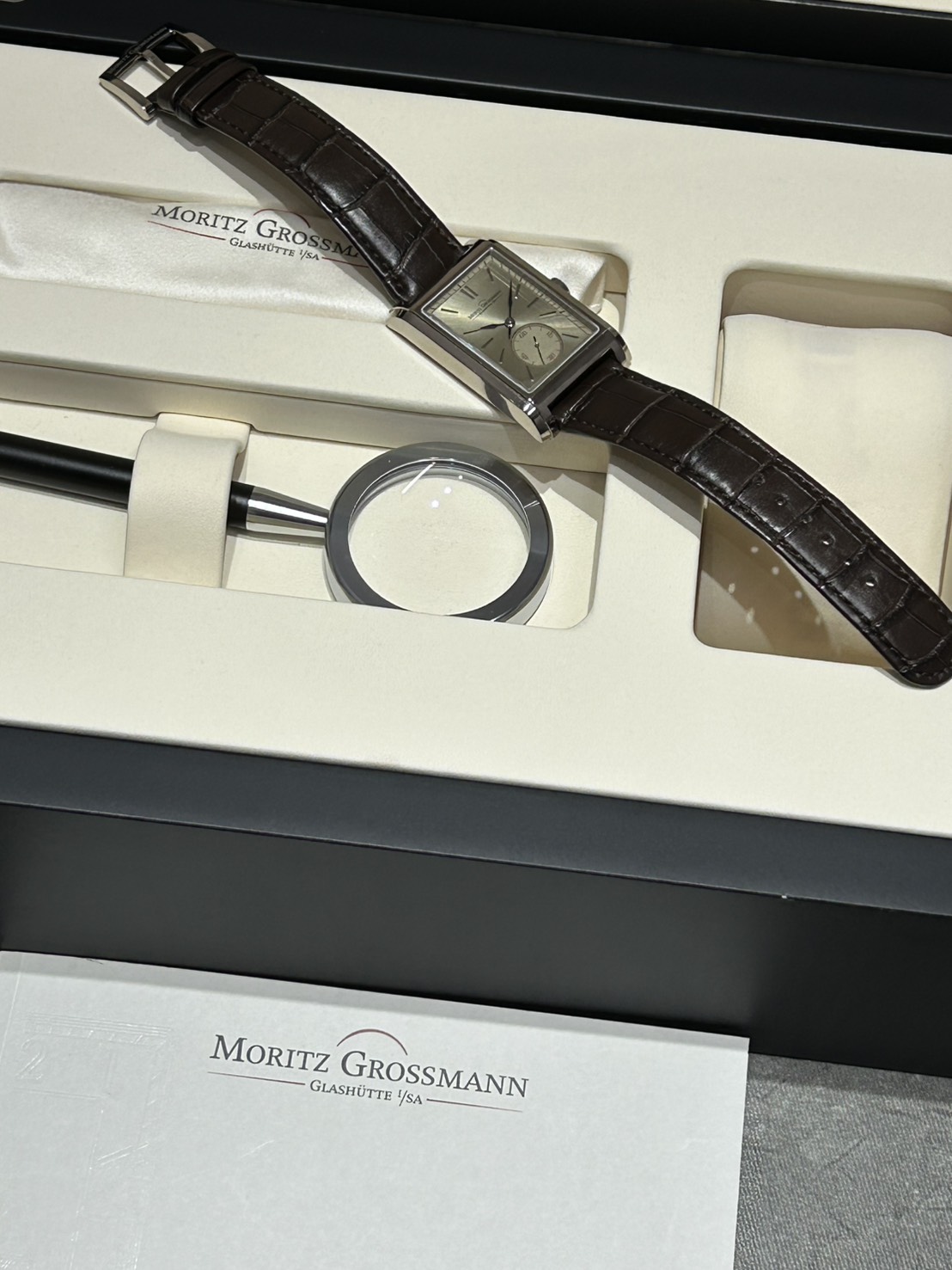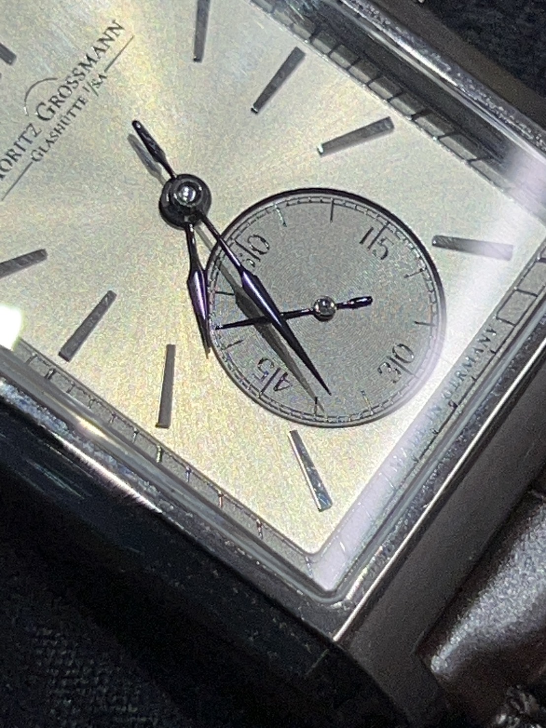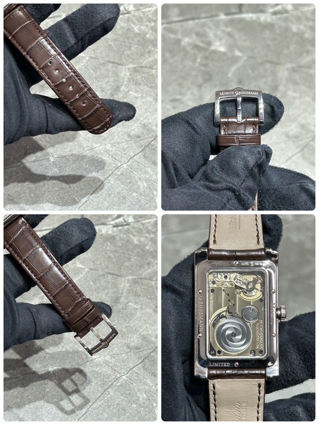 角型ムーブメントは汎用性が低いため、本格機械式ブランドでも作っているところは少なく大変希少な存在でモリッツグロスマンのこだわりが感じられるモデルでございます。