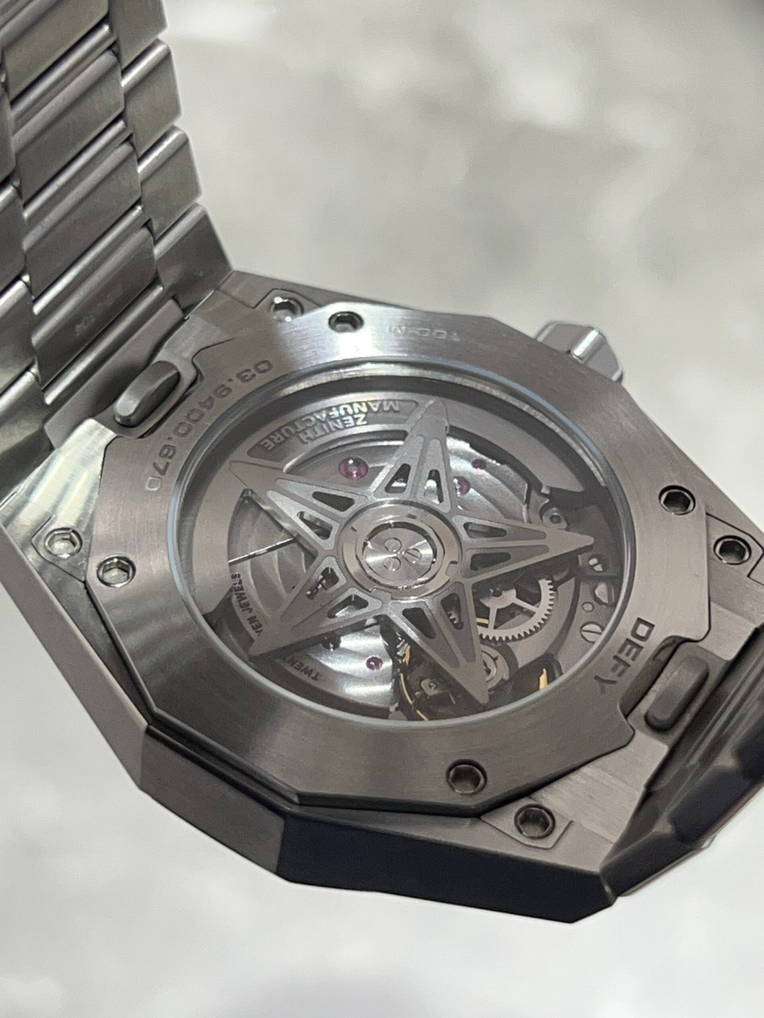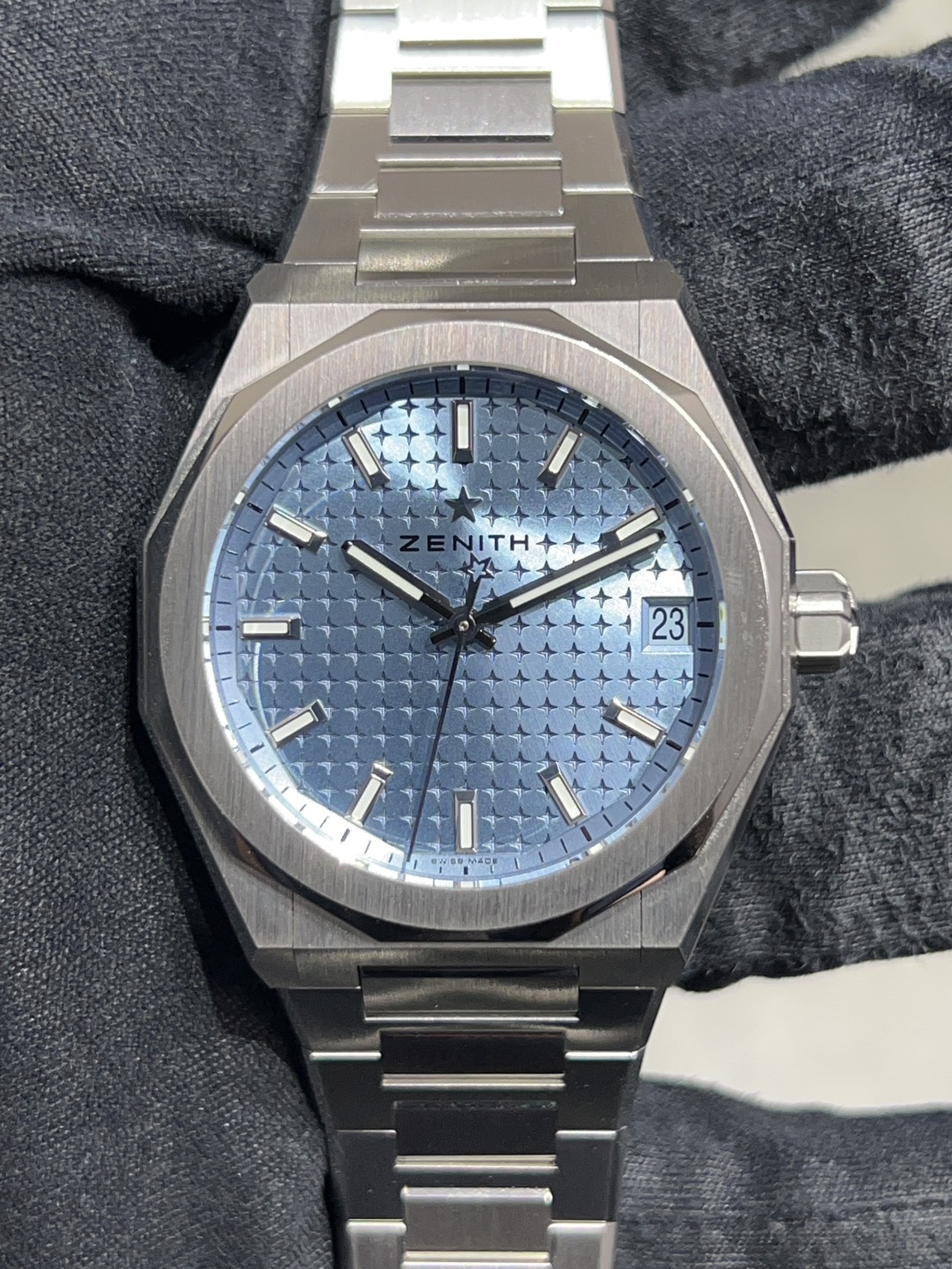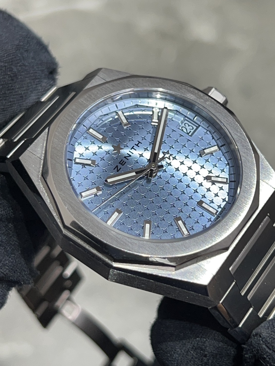 まず目につくのは大変鮮やかなアイスブルートーンのサンバースト仕上げの文字盤でございます。そして文字盤をよく見るとゼニスの象徴である星!非常に美しいです。