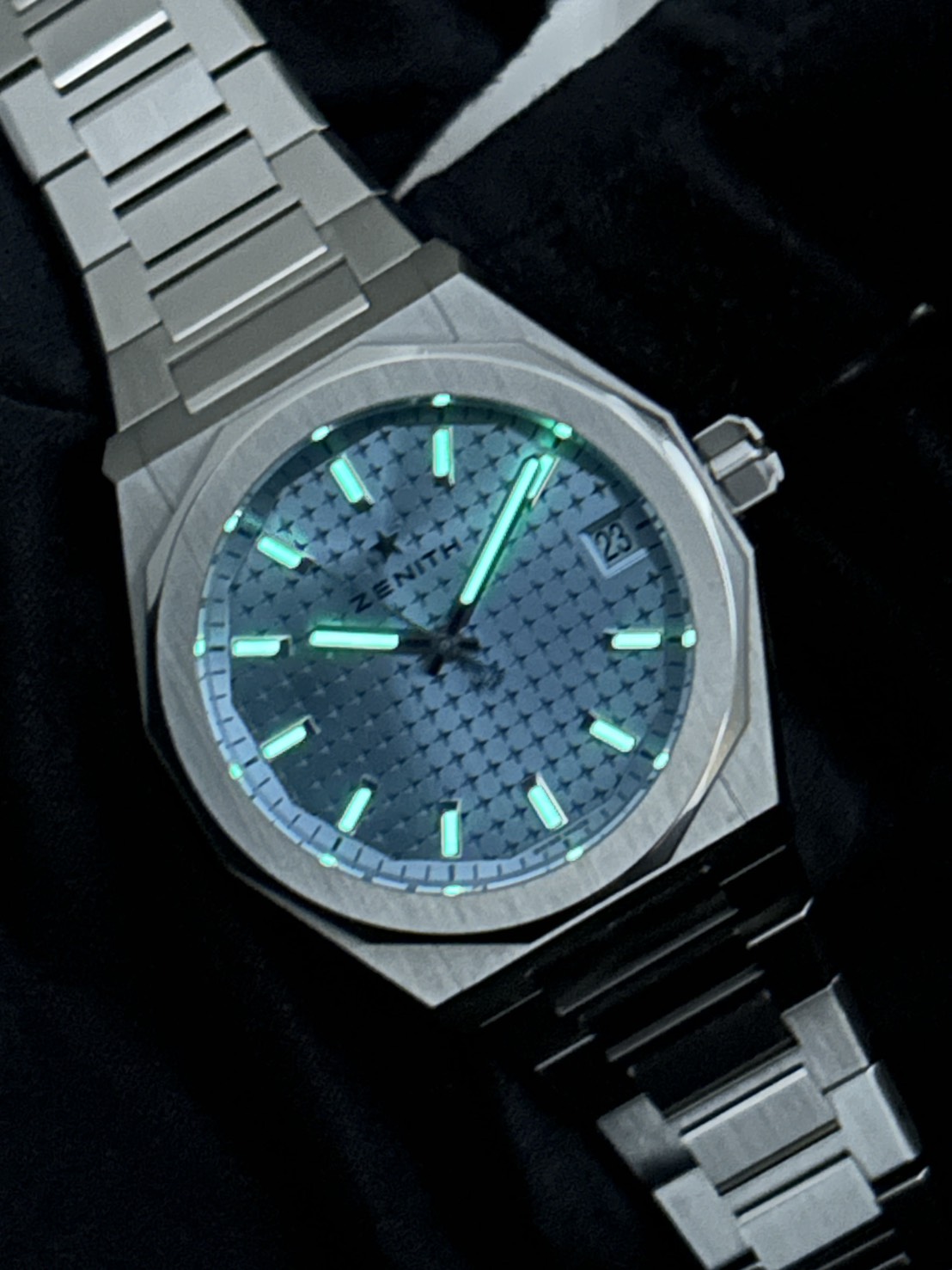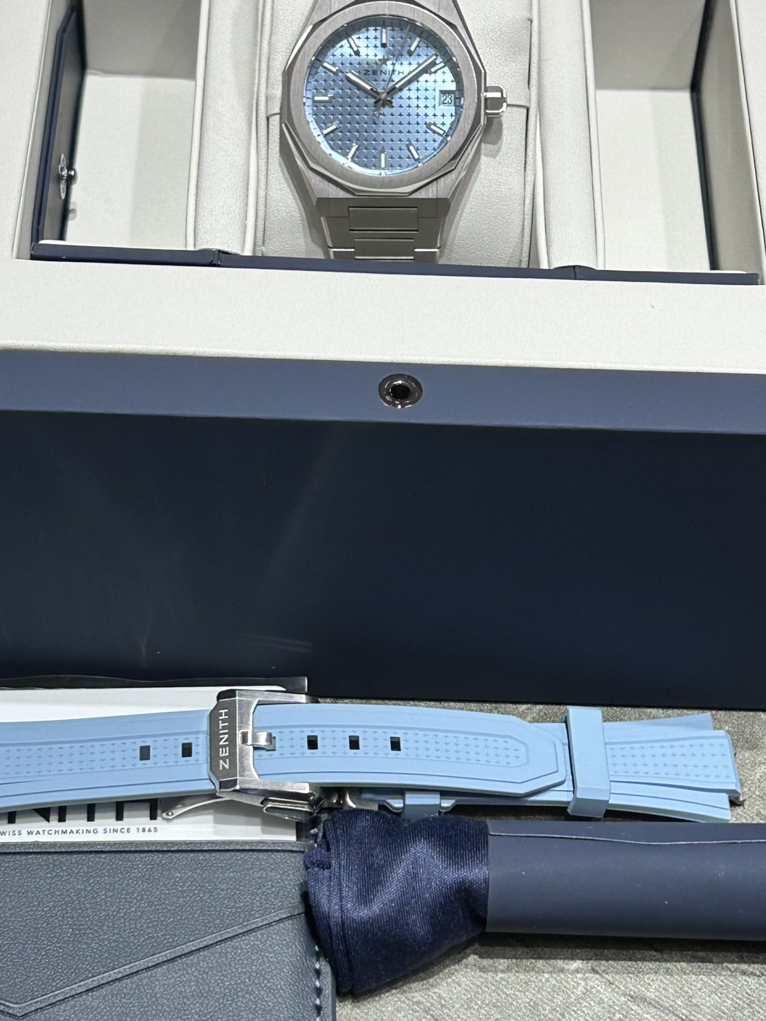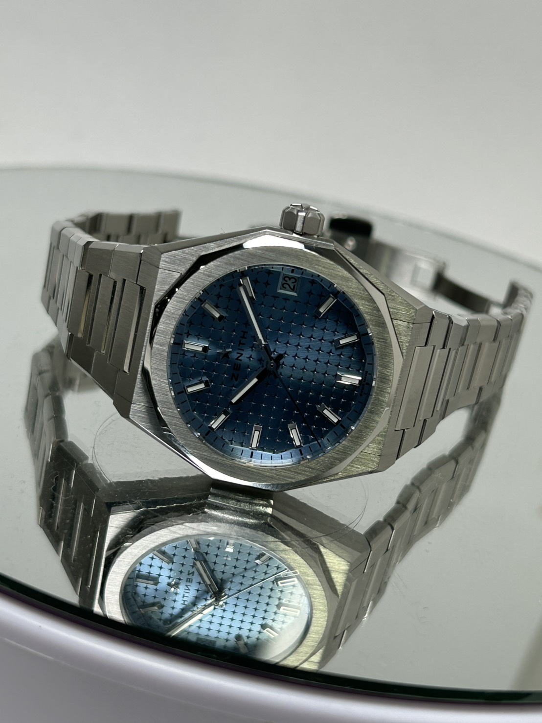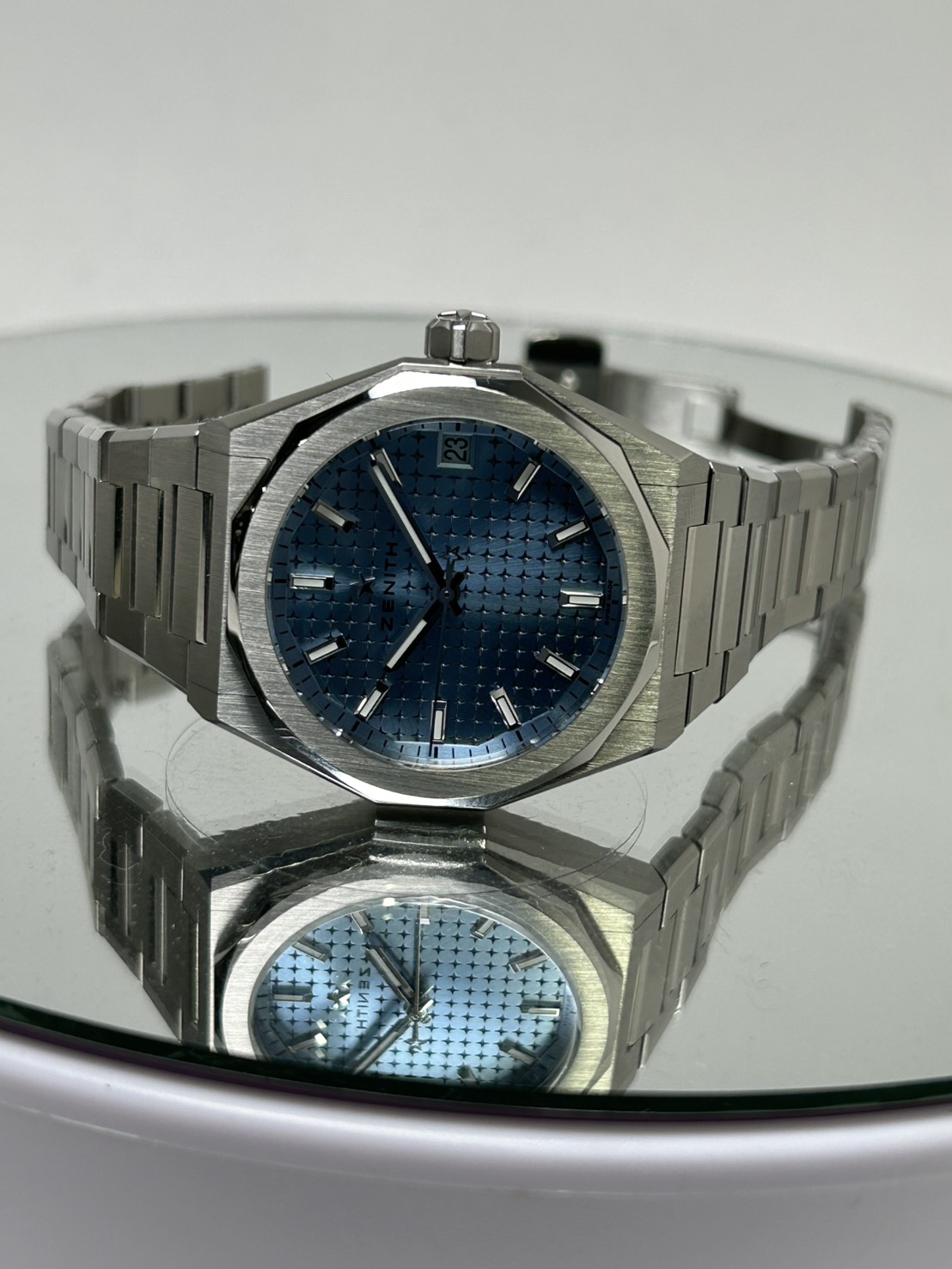 まず目につくのは大変鮮やかなアイスブルートーンのサンバースト仕上げの文字盤でございます。そして文字盤をよく見るとゼニスの象徴である星!非常に美しいです。