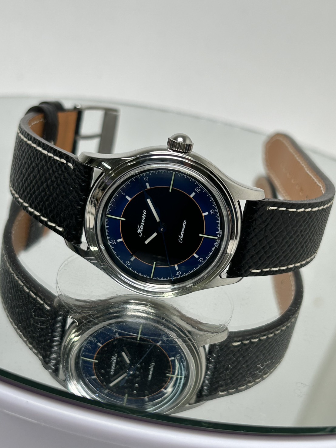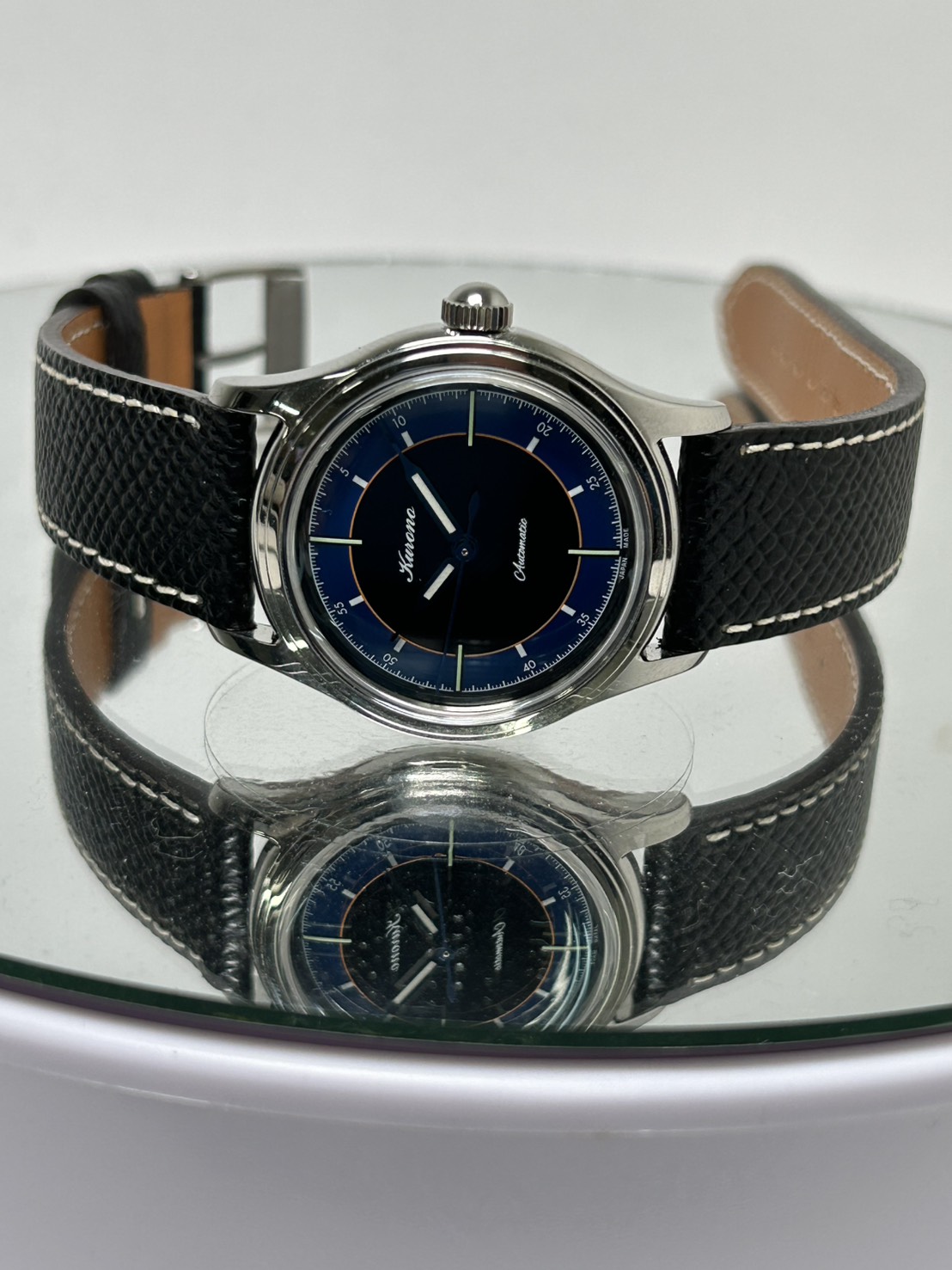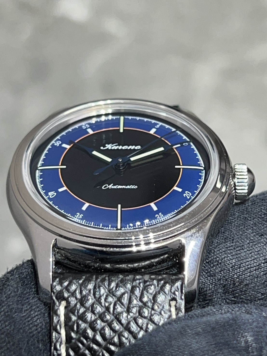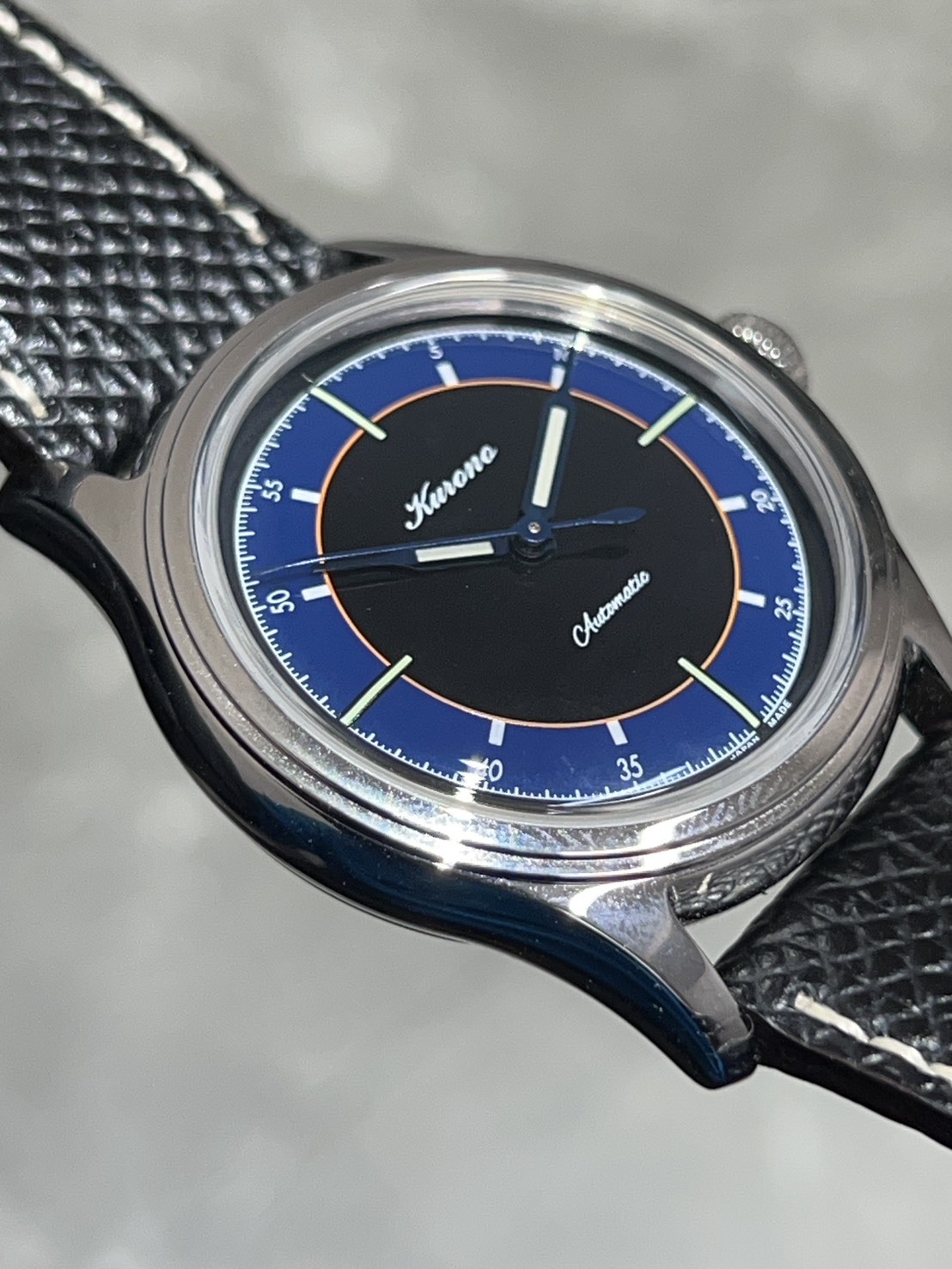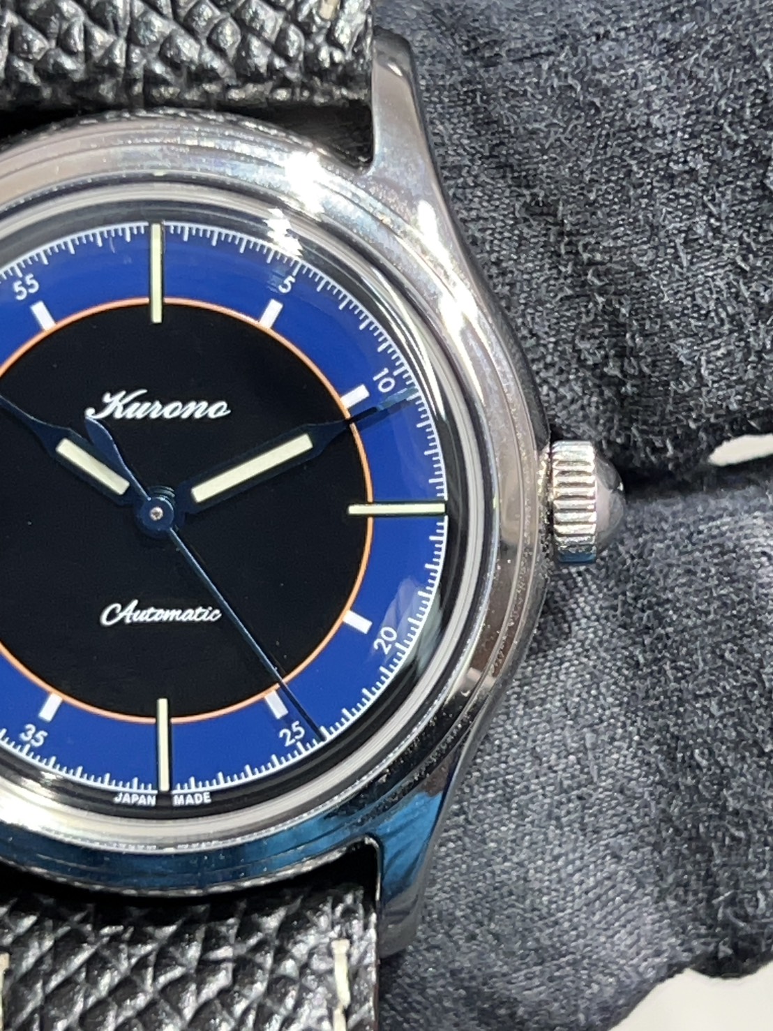 丸形のかわいらしい34.00㎜のケースにブルーとブラックのカッコイイダイヤルで引き締まった印象となっており、時分針、バーインデックスには夜光がついている美しい個体でございます。