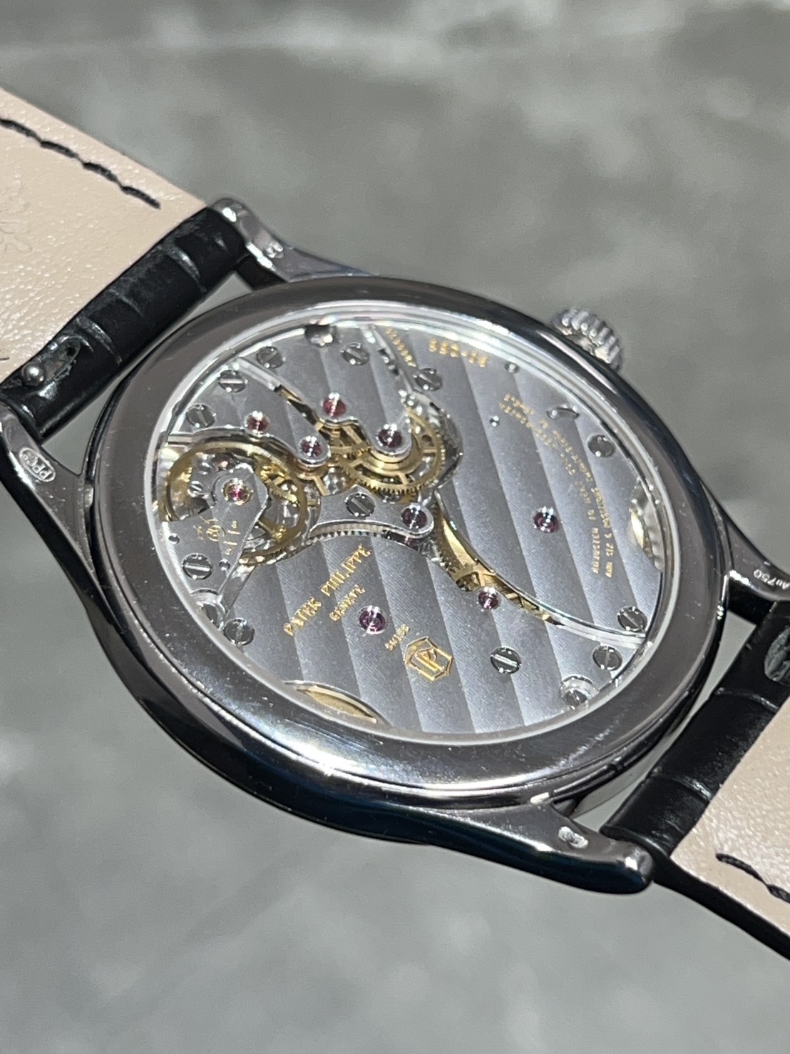 1932年に誕生し、シンプルで美しい丸型フォルムを特徴としたモデルで今回はベゼルはクルー・ド・パリ(ホブネイル・パターン)装飾が施された高貴な印象のホワイトゴールド製の6119カラトラバが入荷致しました。