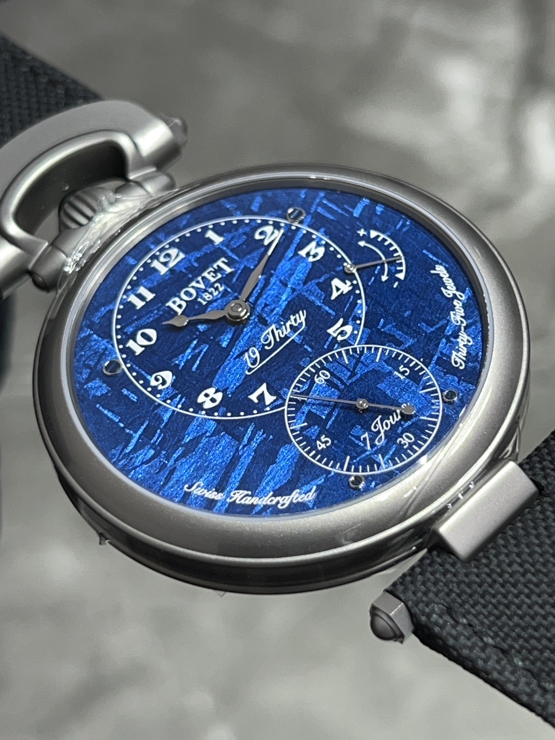文字盤は自然物故に同じ表情のが存在しえないブルーメテオライト、光の角度で反射する非常に美しく神秘的なダイヤルとなっており唯一無二の存在感を放っております。