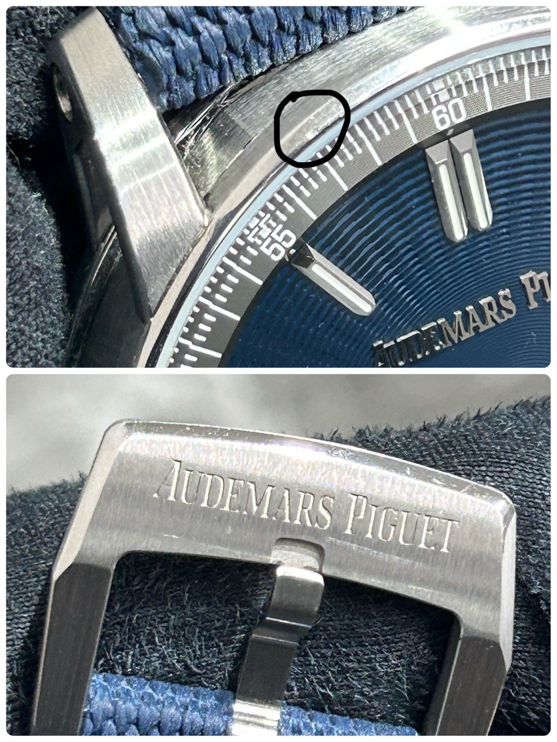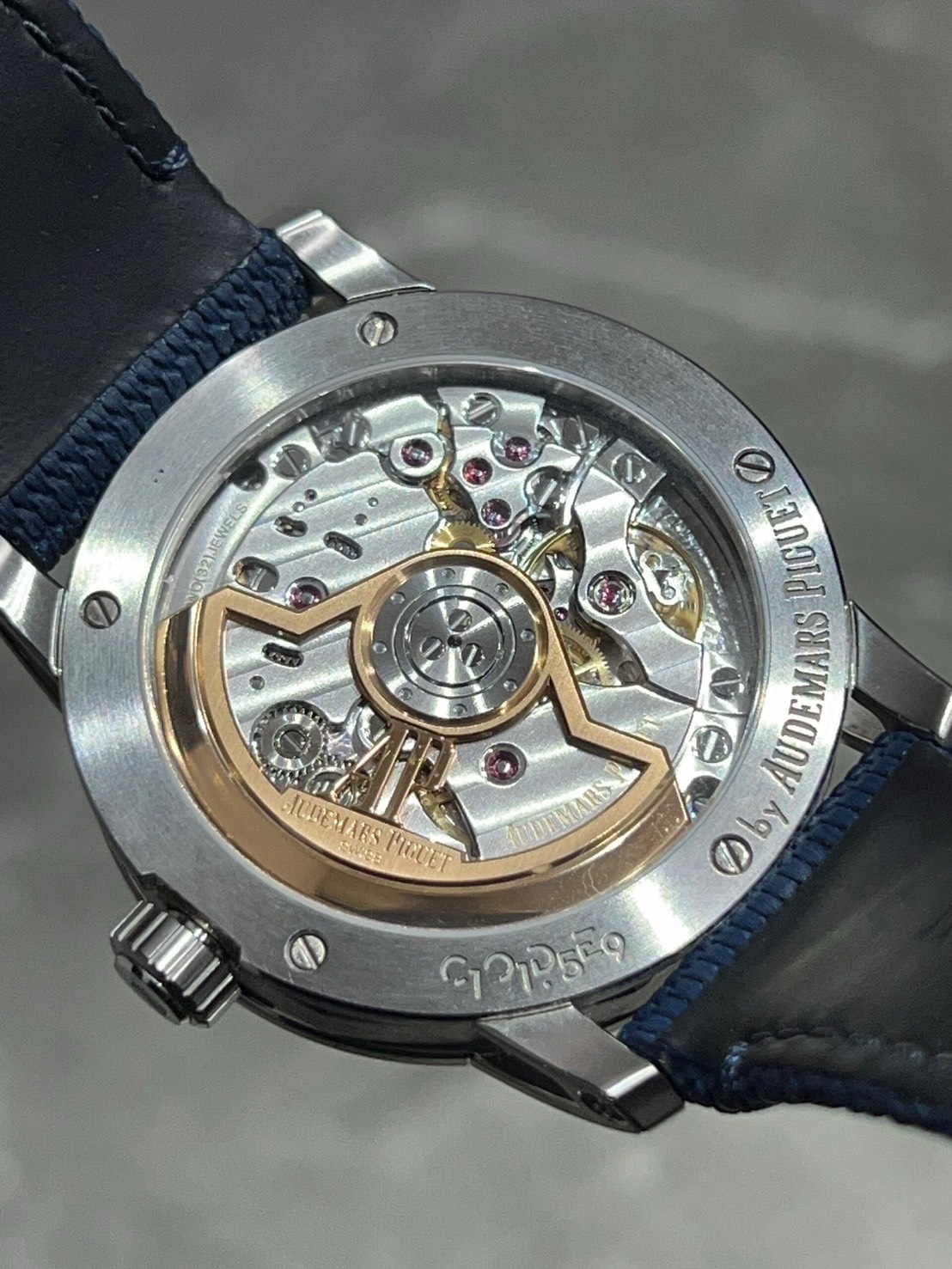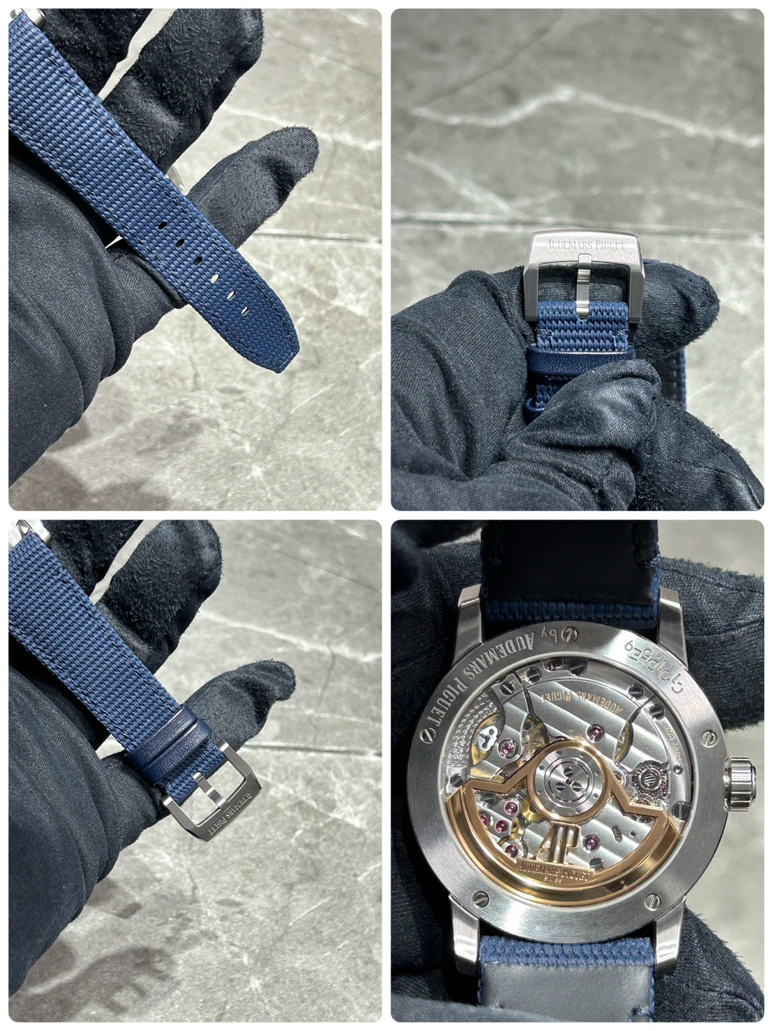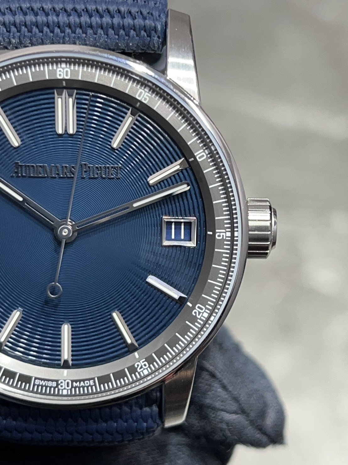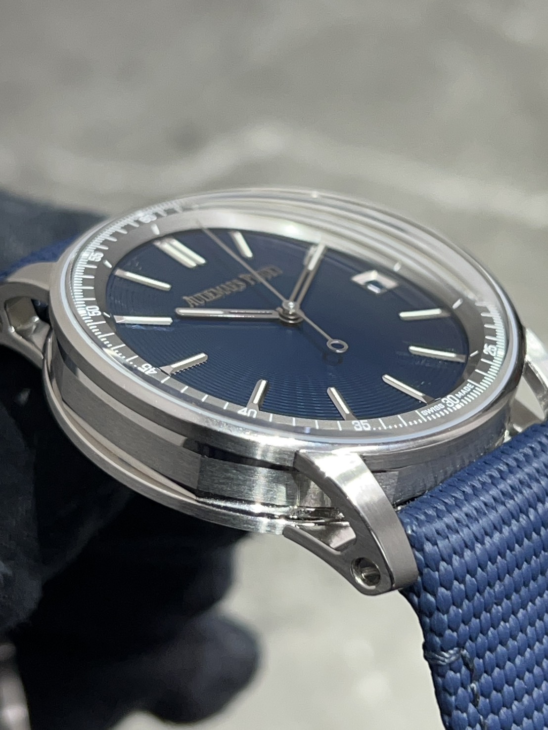 同心円状のスタンプ加工が施された今までのコード1159と違うイメージの文字盤でございましてこちらはロイヤルオーク等でおなじみのナイトブルー、クラウド50となっております。