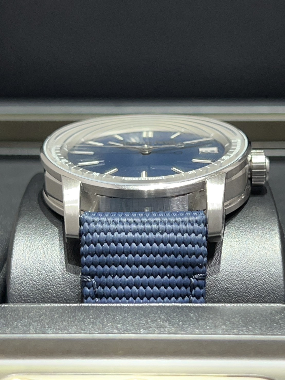 斜めの角度から文字盤を見ると湾曲したガラスが波状に見える姿は他の時計には見られない唯一無二の時計と言えるでしょう。