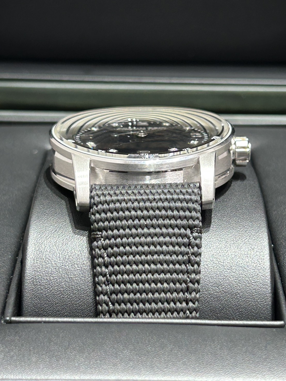 斜めの角度から文字盤を見ると湾曲したガラスが波状に見える姿は他の時計には見られない唯一無二の時計と言えるでしょう。