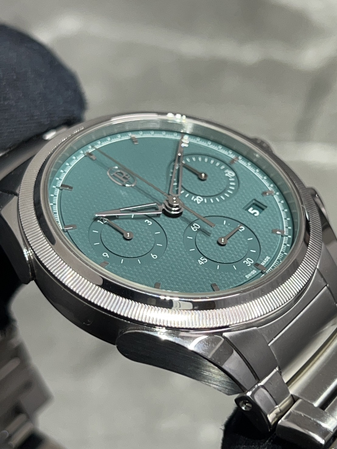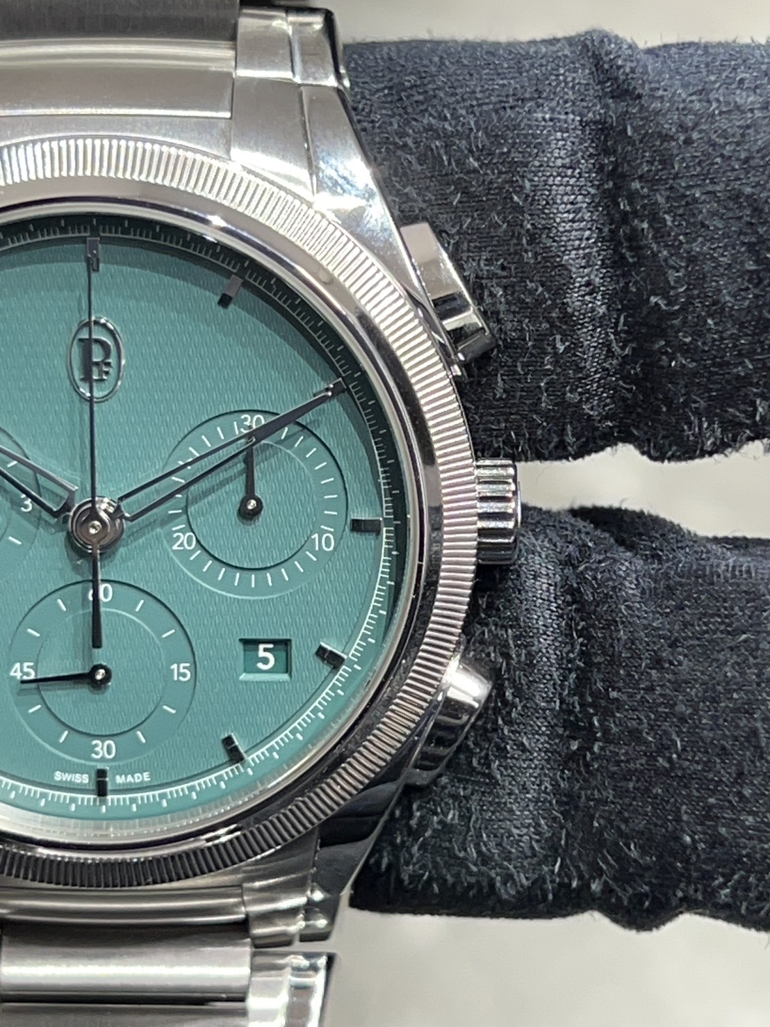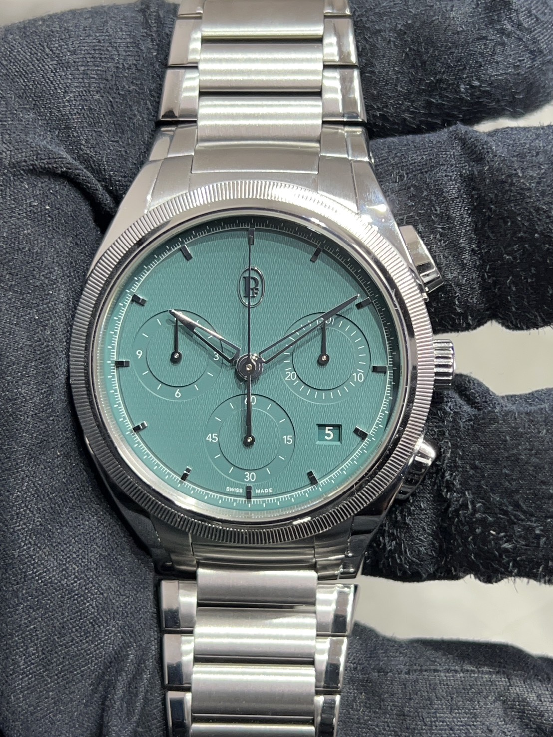 トンダPFクロノグラフ、美しいターコイズのようなグリーンに針がデルタスケルトンなっておりバーリーコーンギョーシェの文字盤を堪能できます。