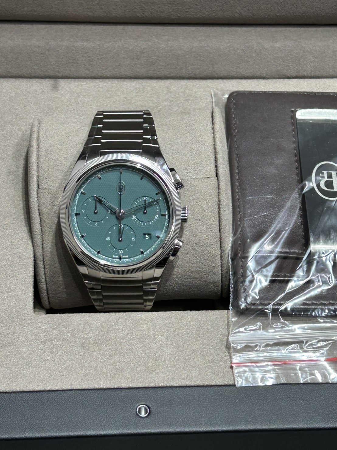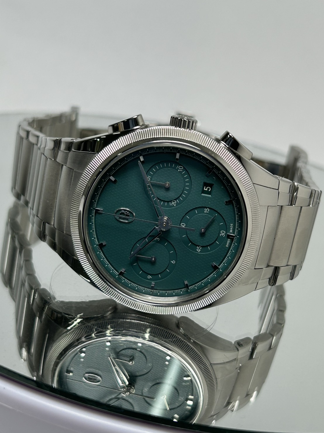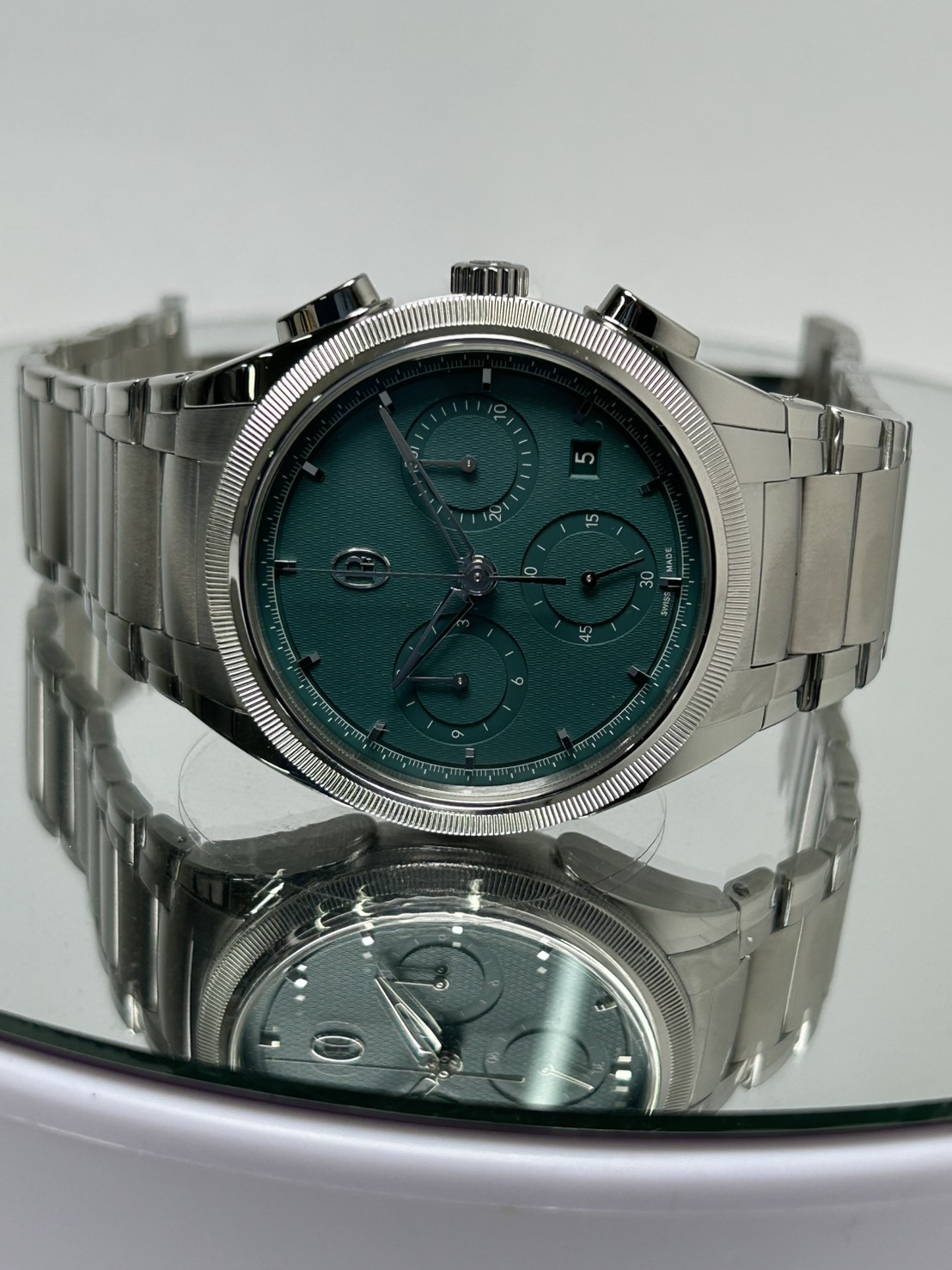 トンダPFクロノグラフ、美しいターコイズのようなグリーンに針がデルタスケルトンなっておりバーリーコーンギョーシェの文字盤を堪能できます。
