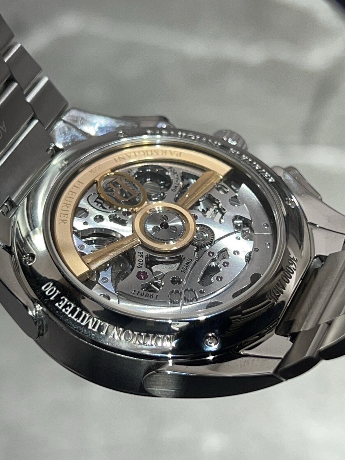 パルミジャーニフルリエの美しい造形が好きな方も多いと思いますがケースサイドから見ても立体感がある装飾で裏蓋からは毎時36,000のハイビートのムーブメントが確認でき機能性も高いです。