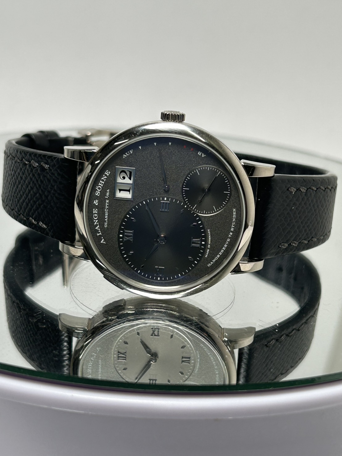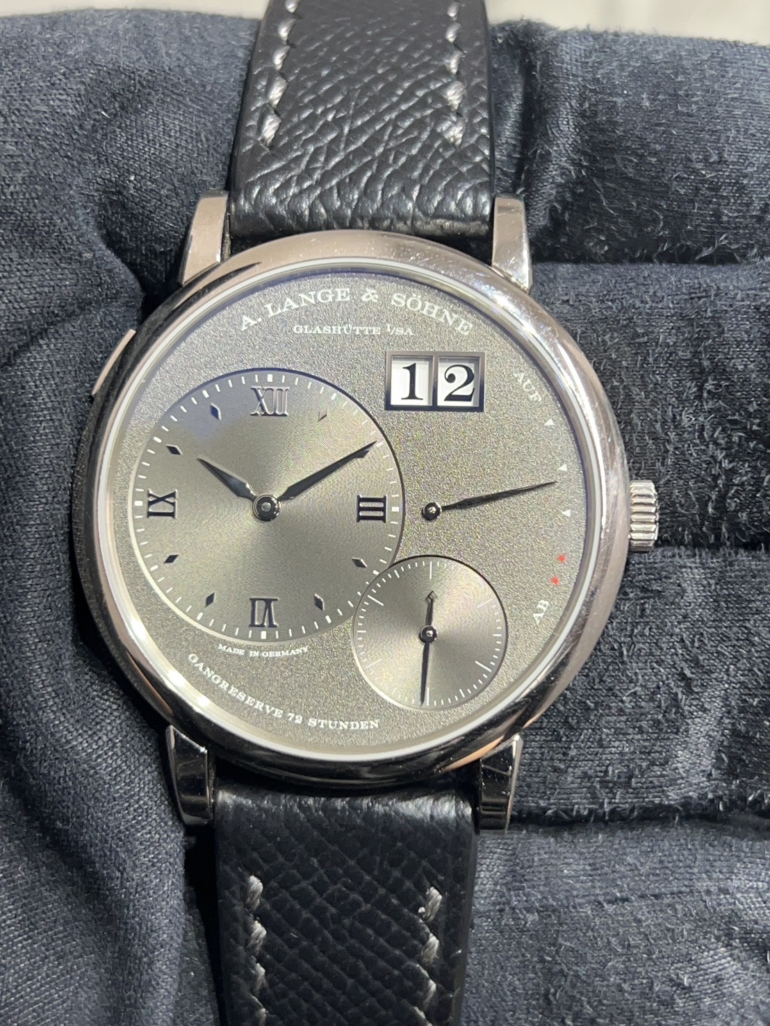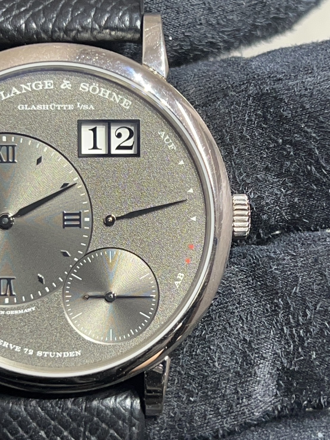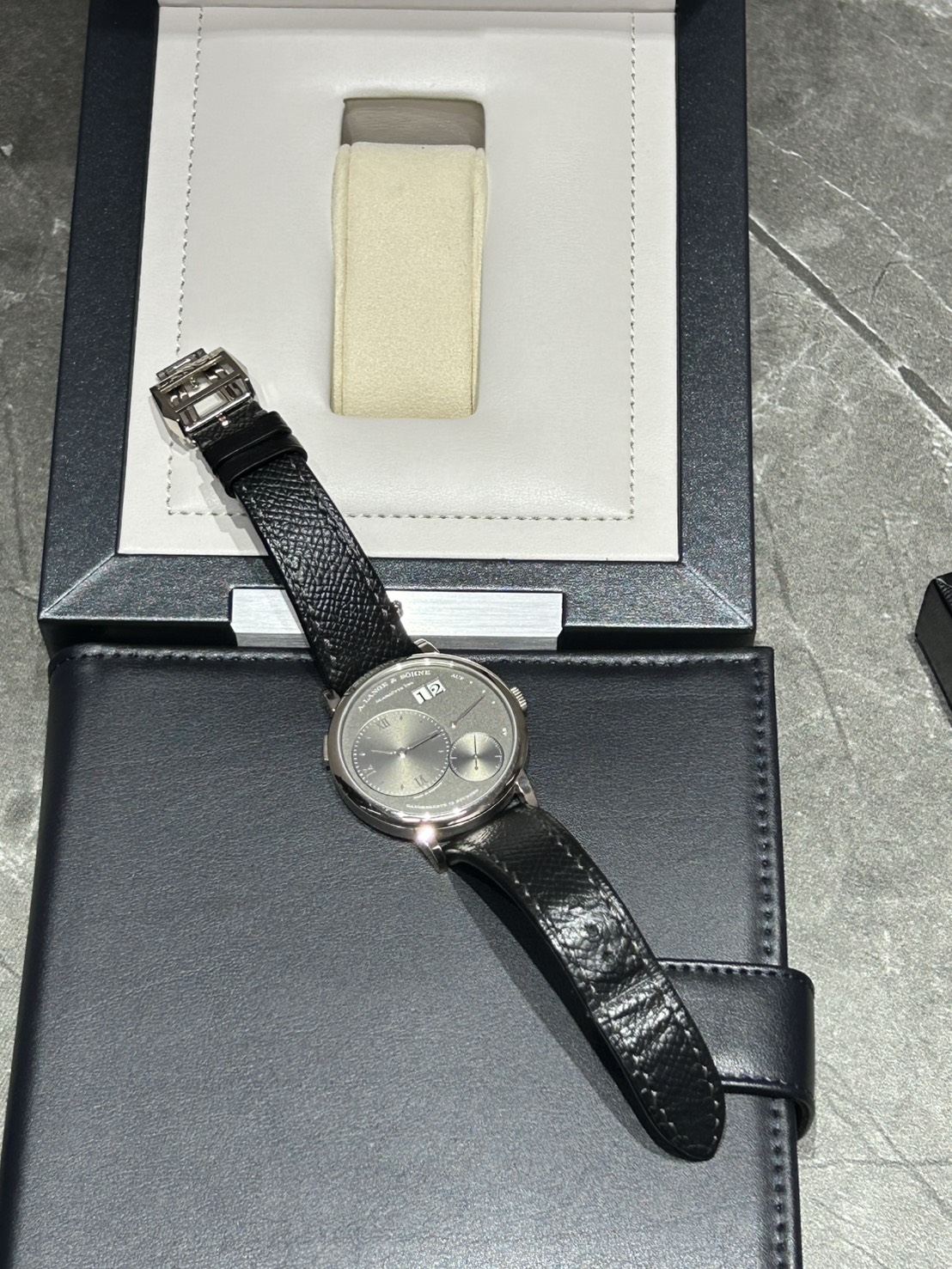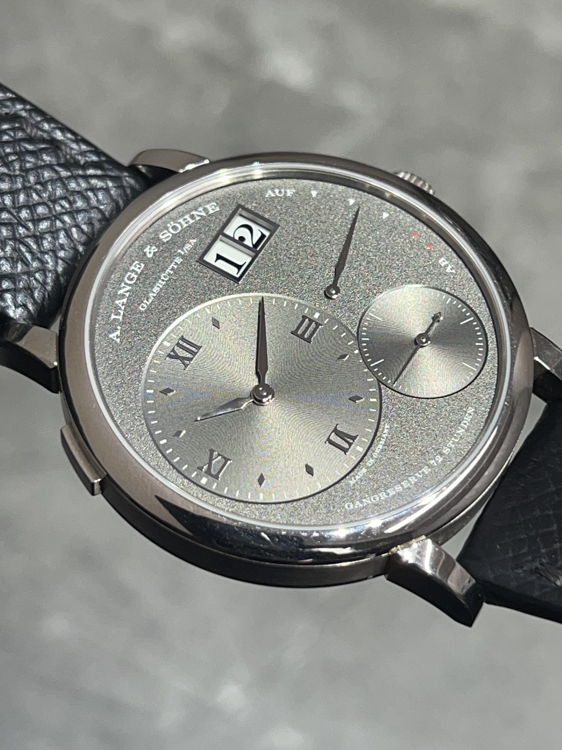 ケースには 18Kホワイトゴールド を採用し、直径41㎜の堂々たるケースサイズは手元で確かな存在感を放ち、文字盤はシルバー無垢のグレーダイヤルに、ランゲならではのアウトサイズデイトやパワーリザーブインジケーターを備えております。