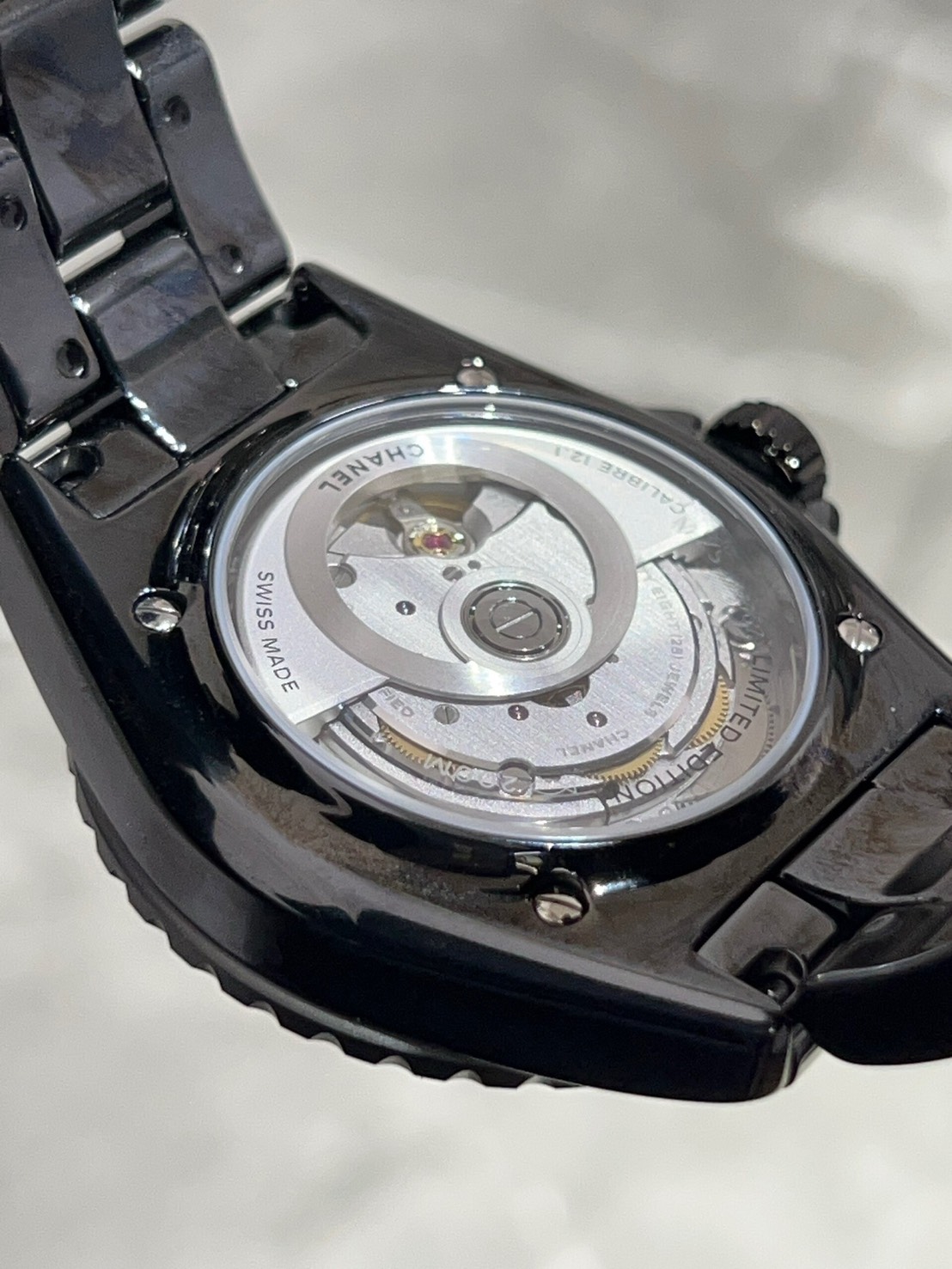 裏蓋からはキャリバー 12.1を鑑賞する事ができ、70時間パワーリザーブ、200m防水と実用性に優れたスペックになっておりますのでこの機会に是非ご検討宜しくお願いします。