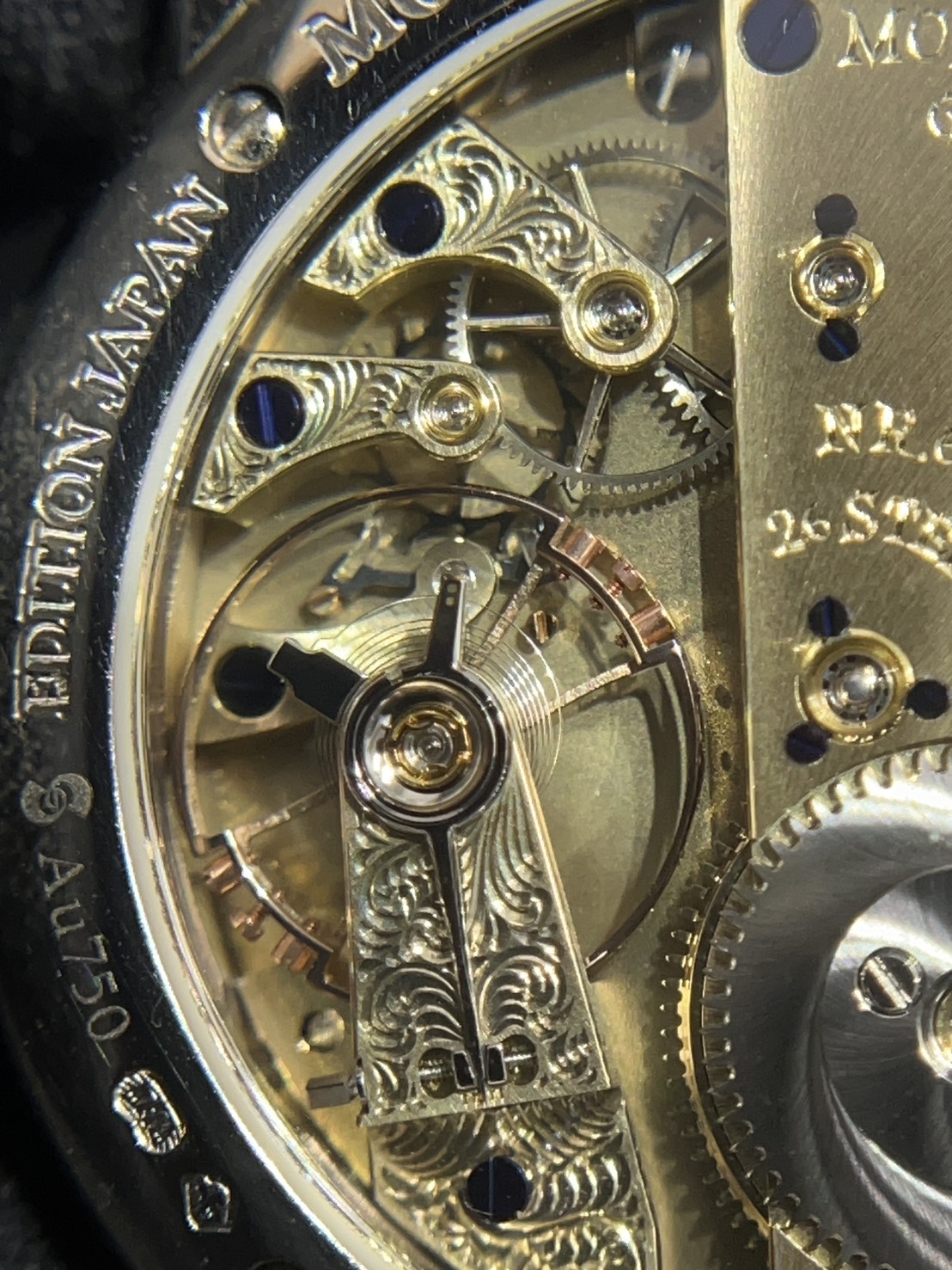 裏蓋からはキャリバー102.0 を鑑賞する事ができ美しいエングレービング加工などがご覧頂けます。