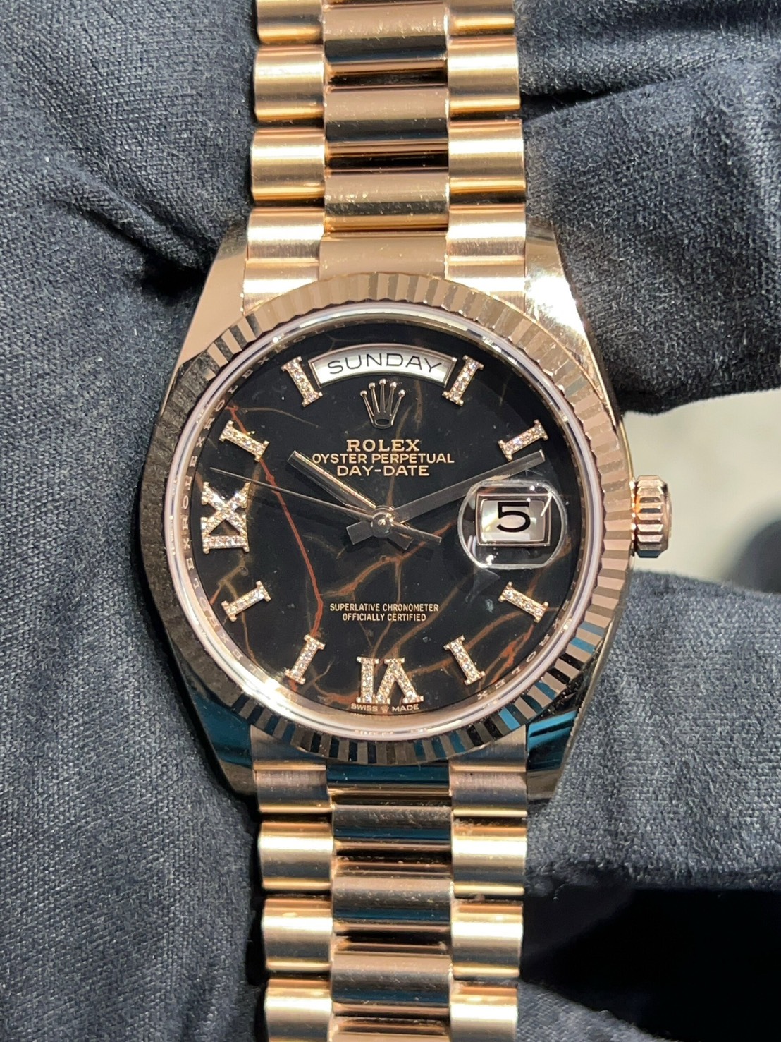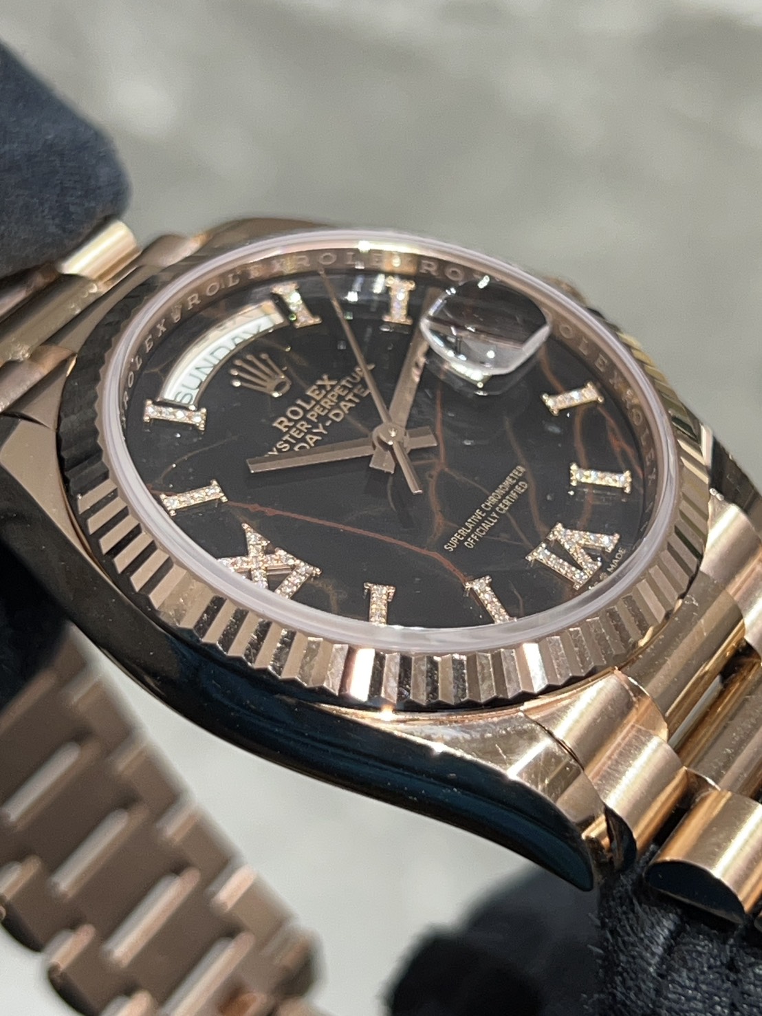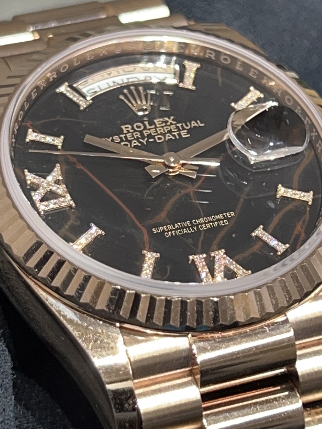日付に加えてフルスペルの曜日も表示するロレックスのデイデイト、大統領の時計とも呼ばれ成功を象徴するモデルと言われております。