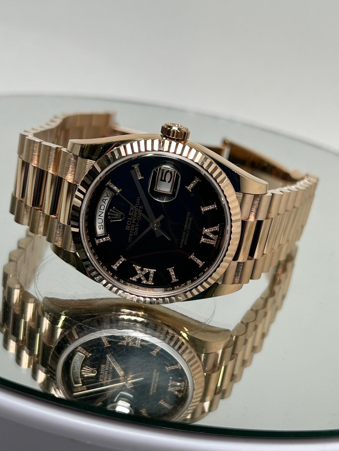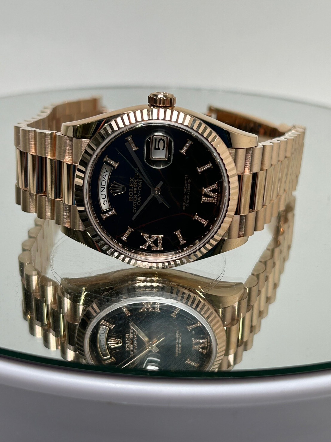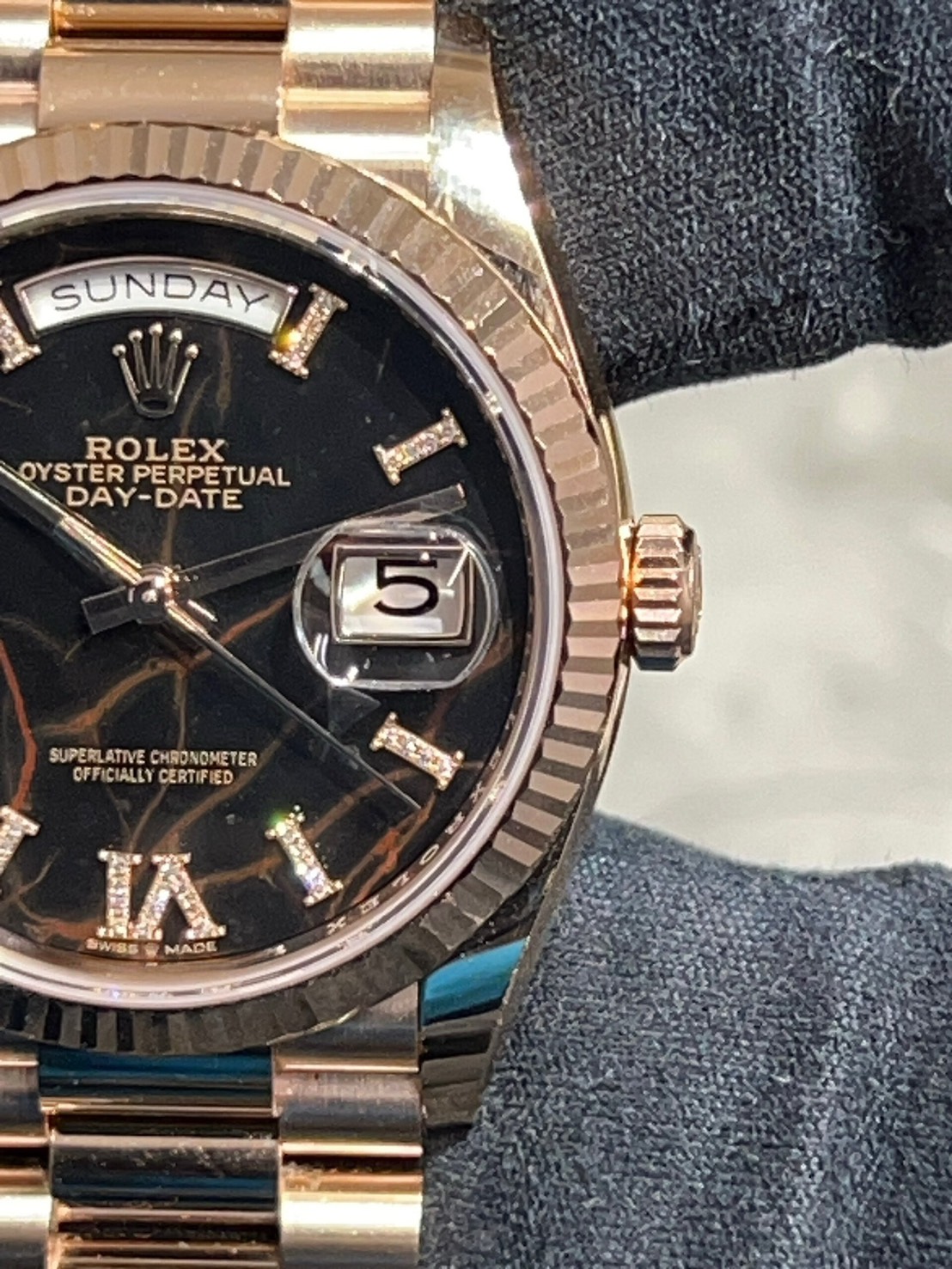 日付に加えてフルスペルの曜日も表示するロレックスのデイデイト、大統領の時計とも呼ばれ成功を象徴するモデルと言われております。