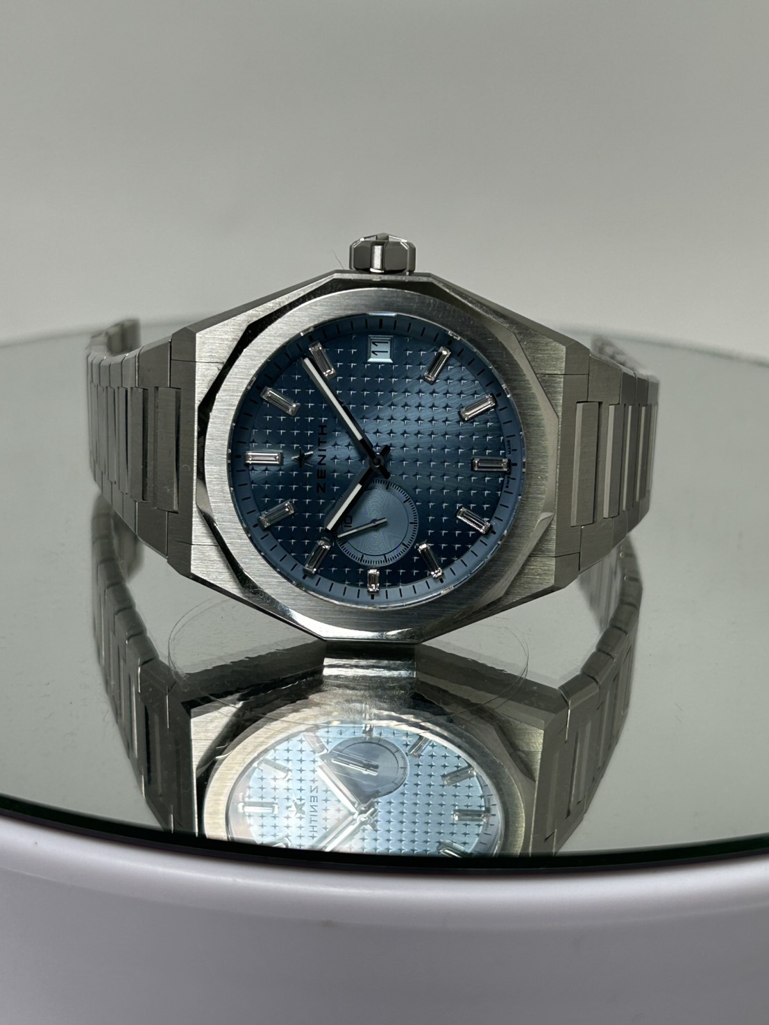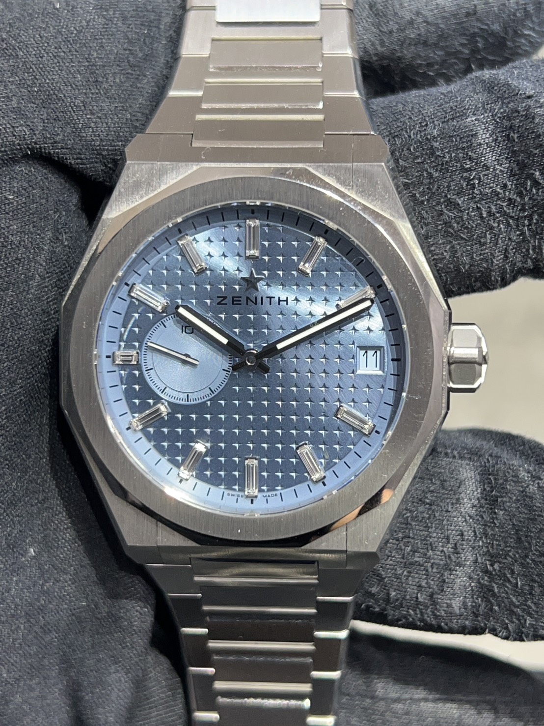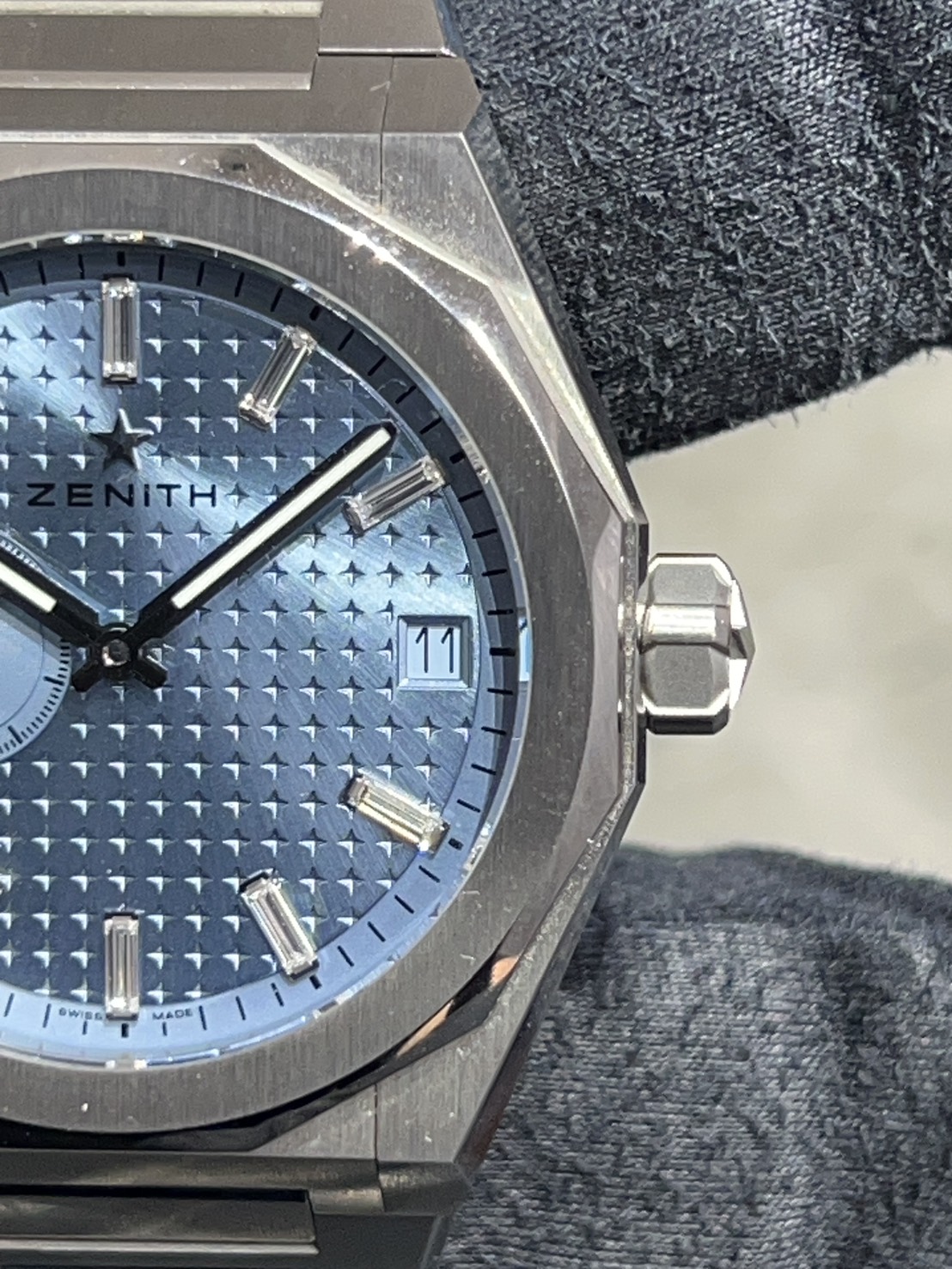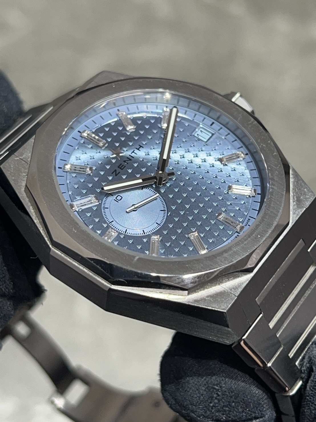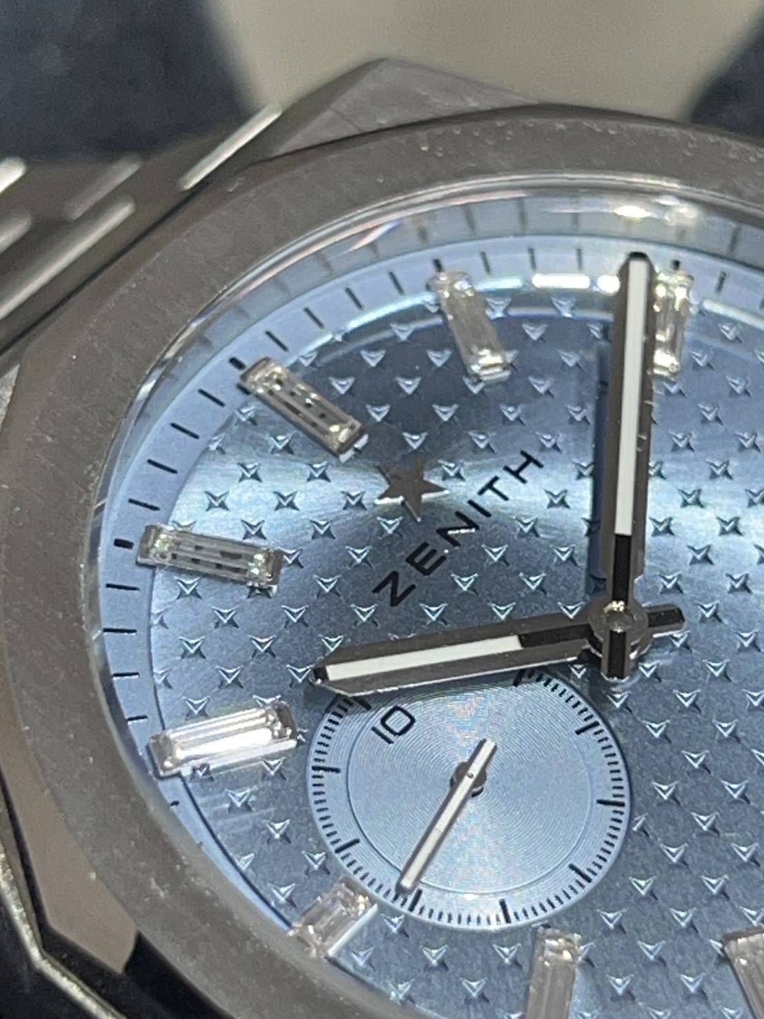 まず目につくのは大変鮮やかなアイスブルートーンのサンバースト仕上げの文字盤でございます。そして文字盤をよく見るとゼニスの象徴である星!非常に美しいです。