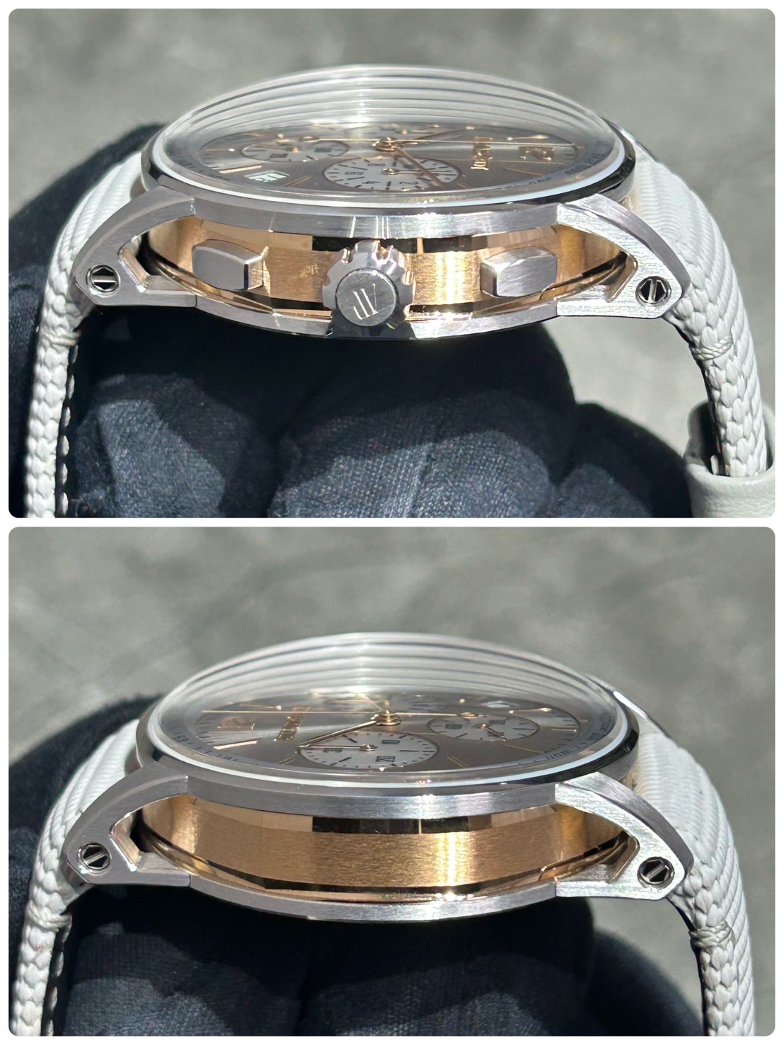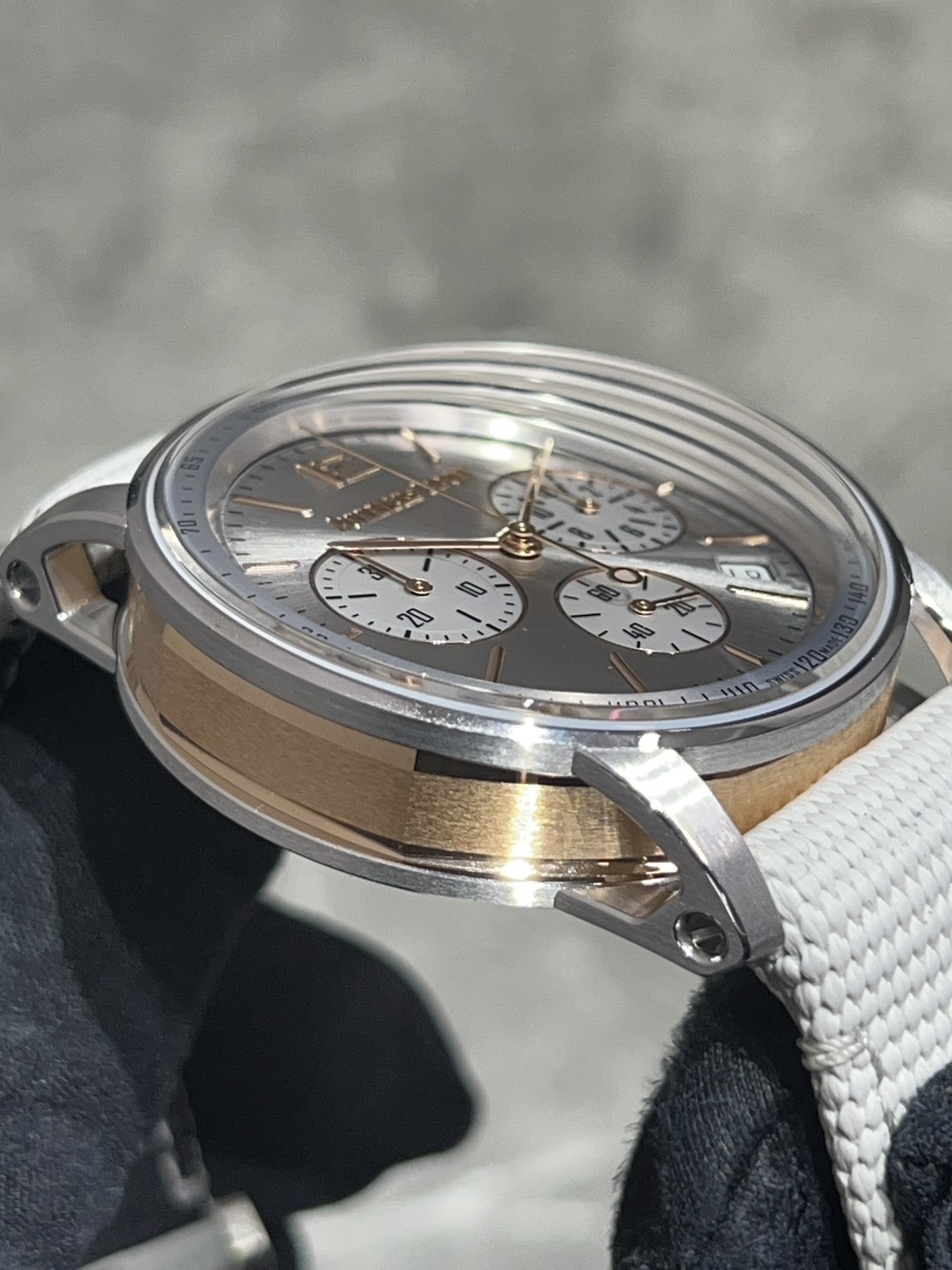 こちらのモデルは18Kホワイトゴールドとピンクゴールドのツートーンケースに、サンバーストのグレーラッカーダイヤル。ピンクゴールドのインデックスと光が混じり色気のある輝きを放ちます。