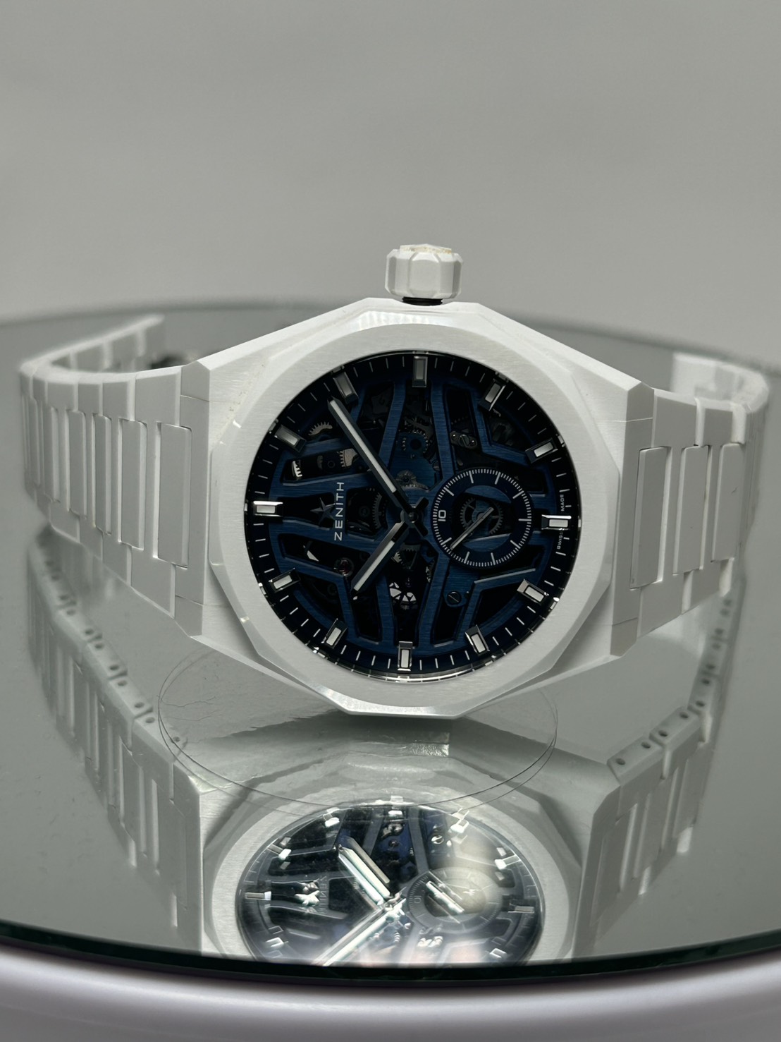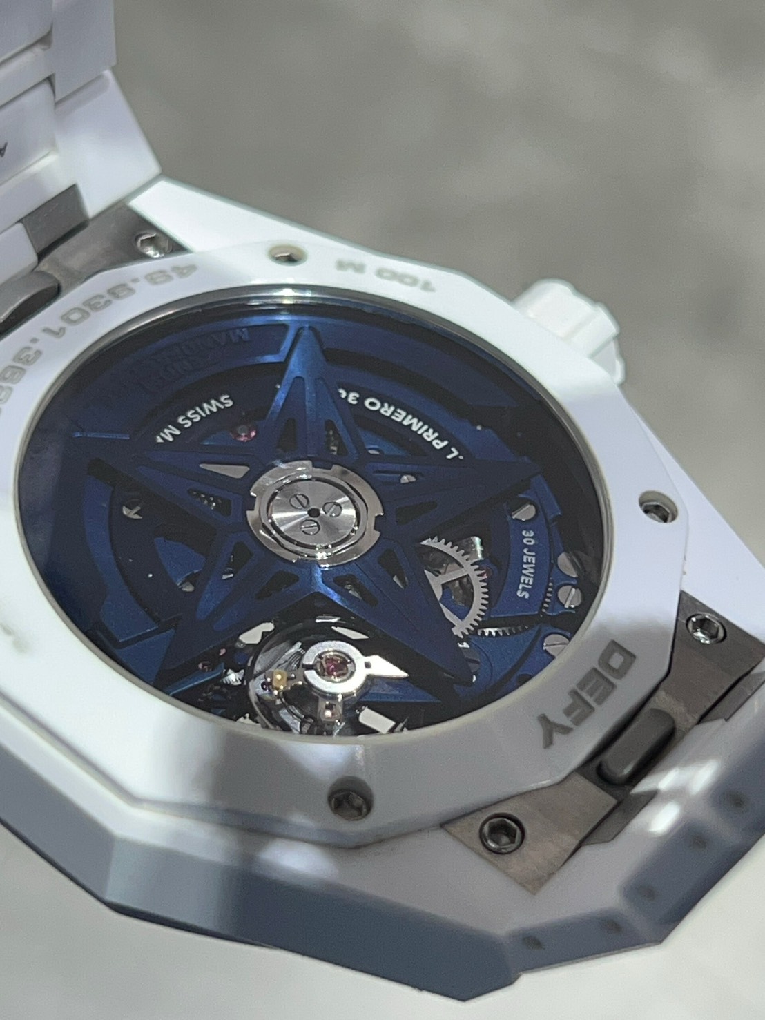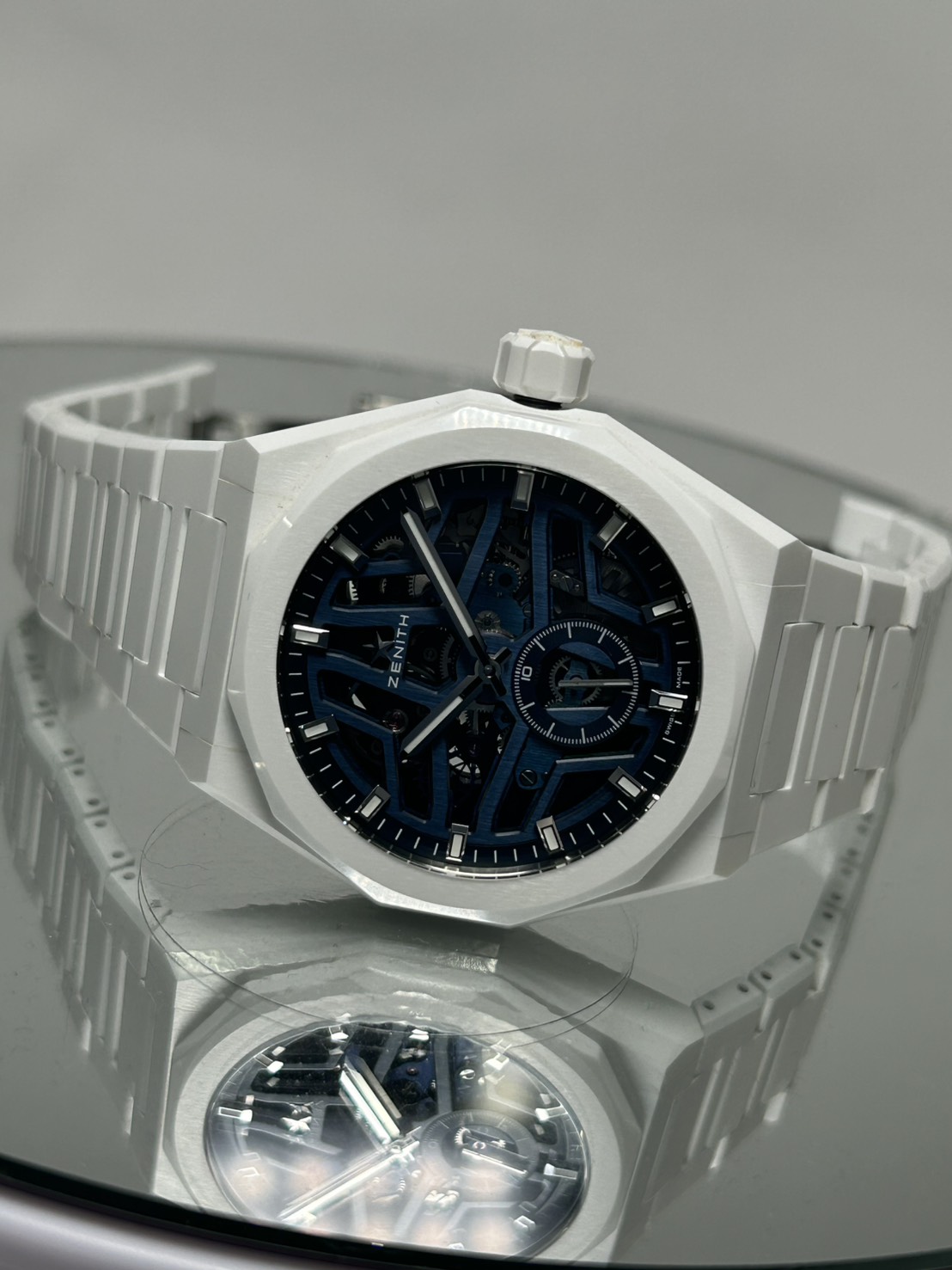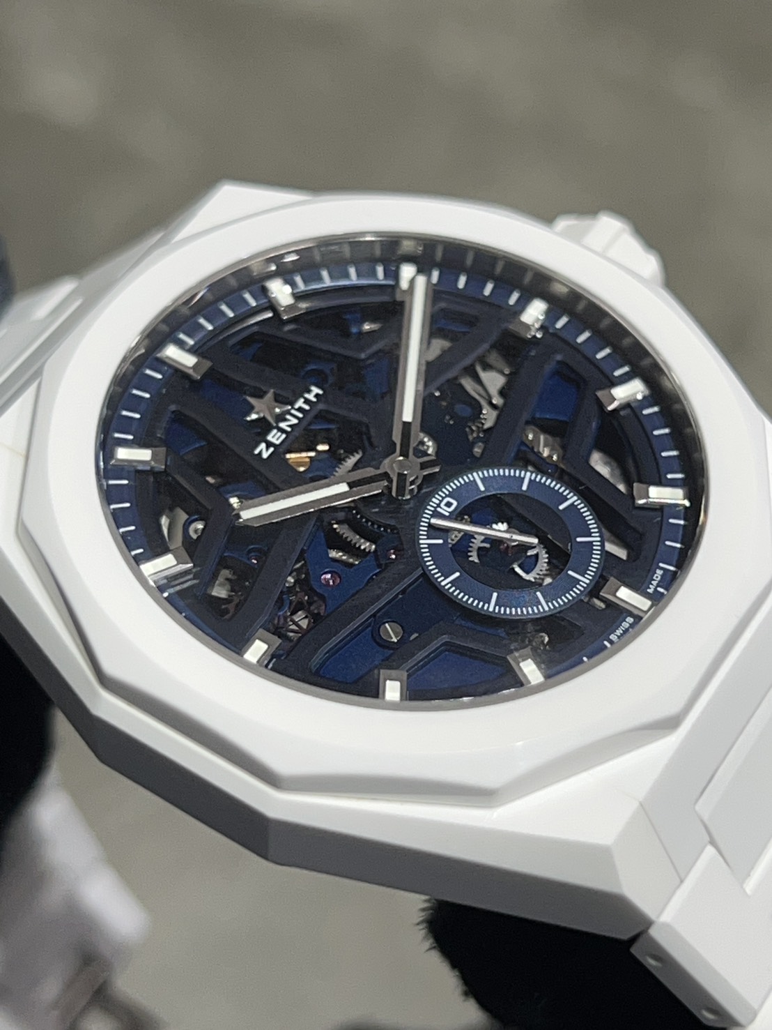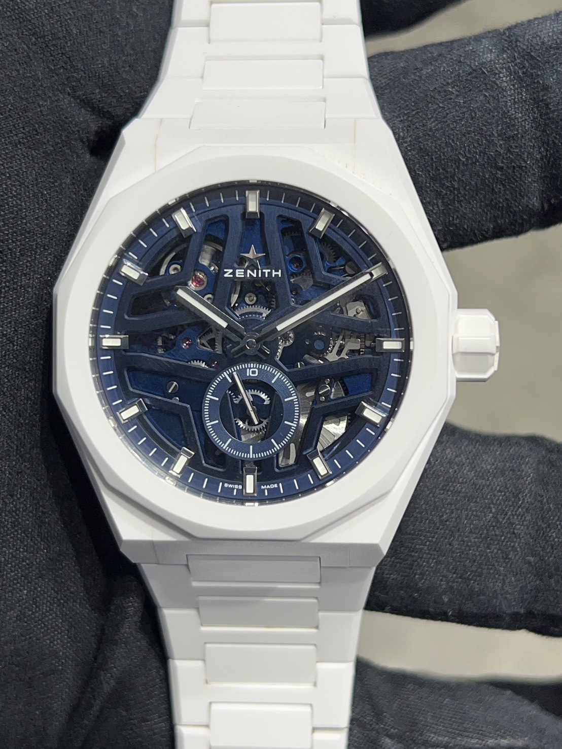 ホワイトセラミックとブルーのスケルトン文字盤で凄まじいインパクトのデファイスカイラインが入荷致しました。
