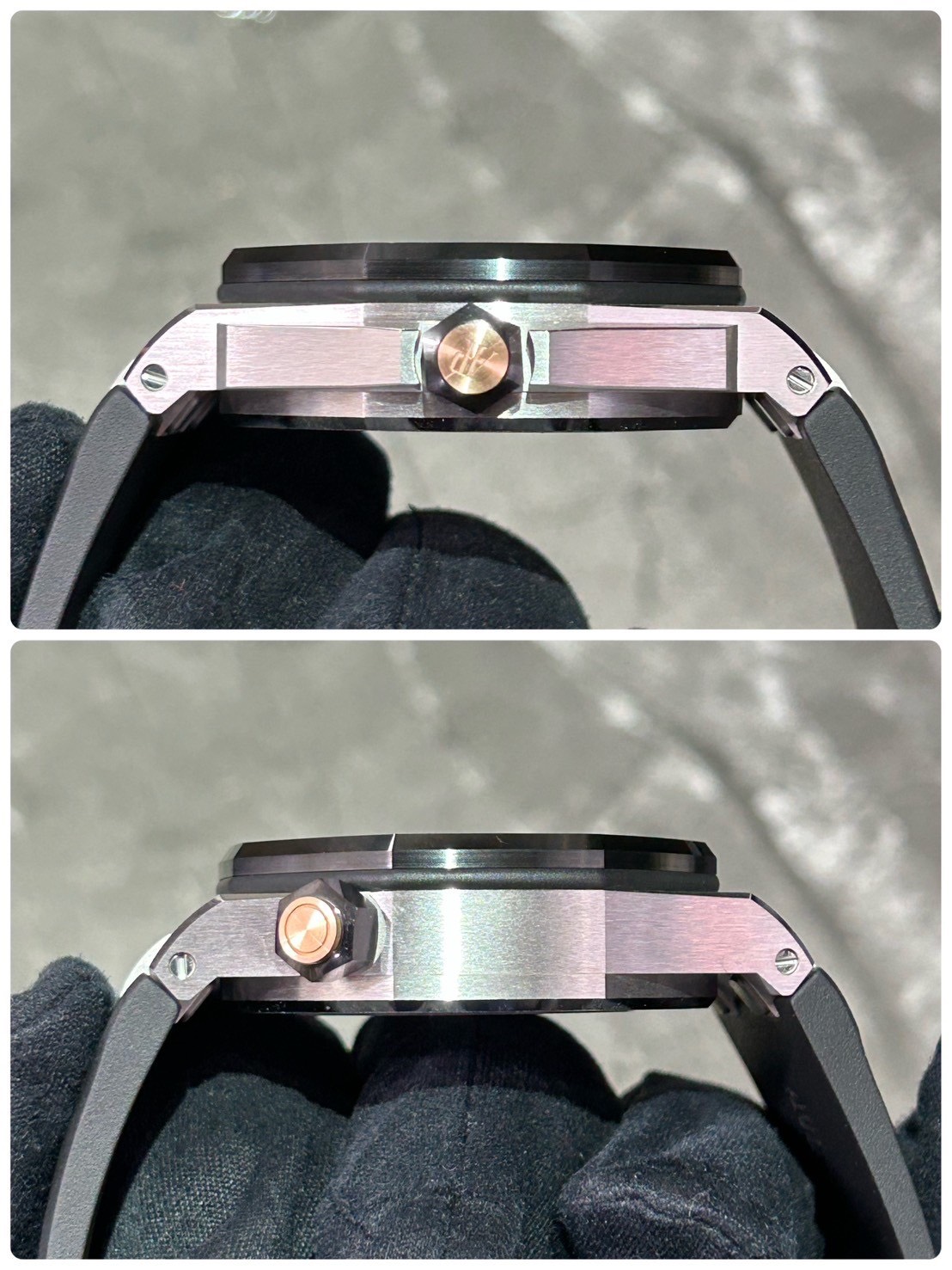 ケースはホワイトゴールドでベゼル、リューズはブラックセラミック製となりスポーティさが増しており、リューズ先端はピンクゴールドがそなえられ高級感もしっかり感じる事ができるモデルとなっております。