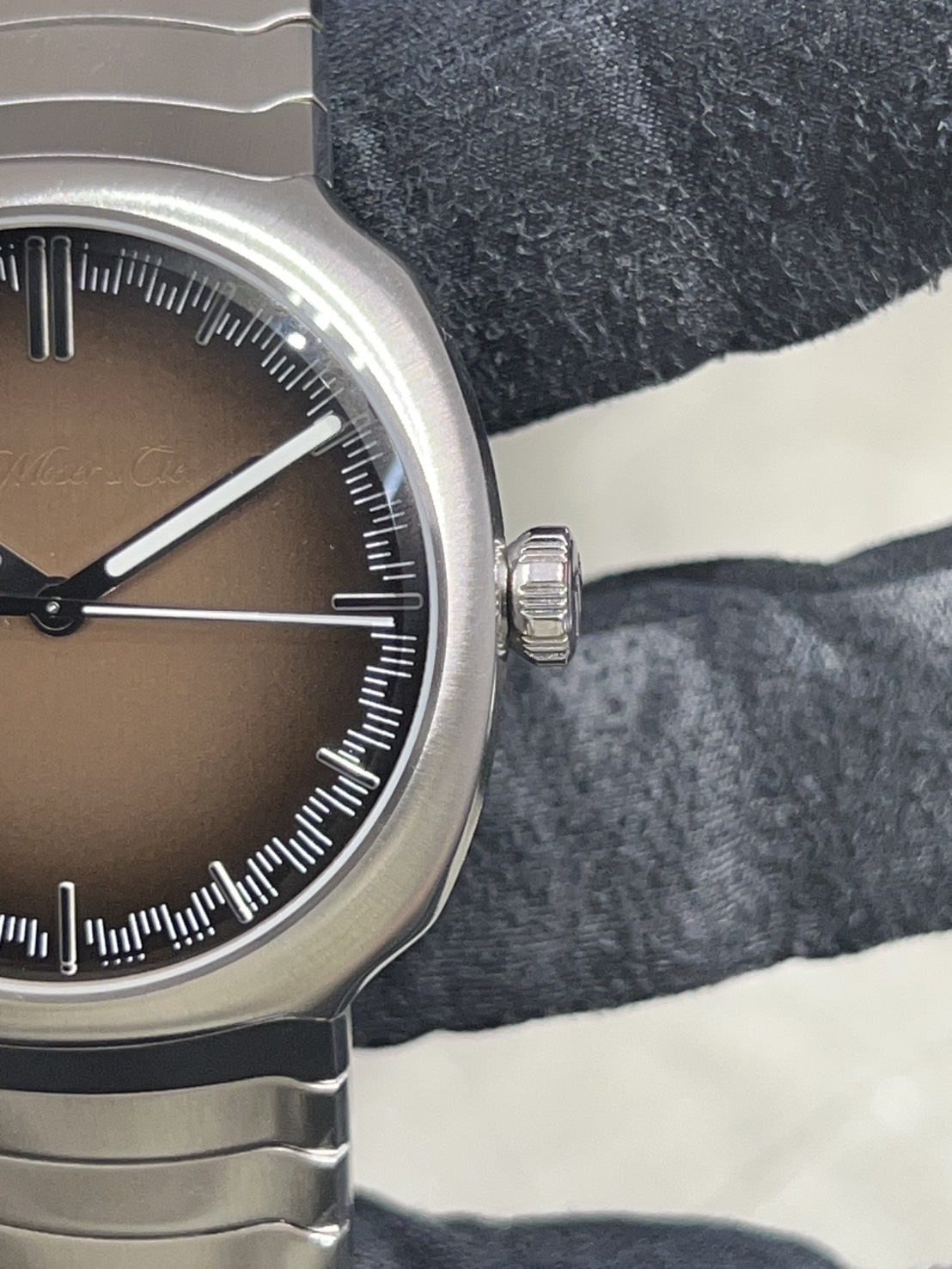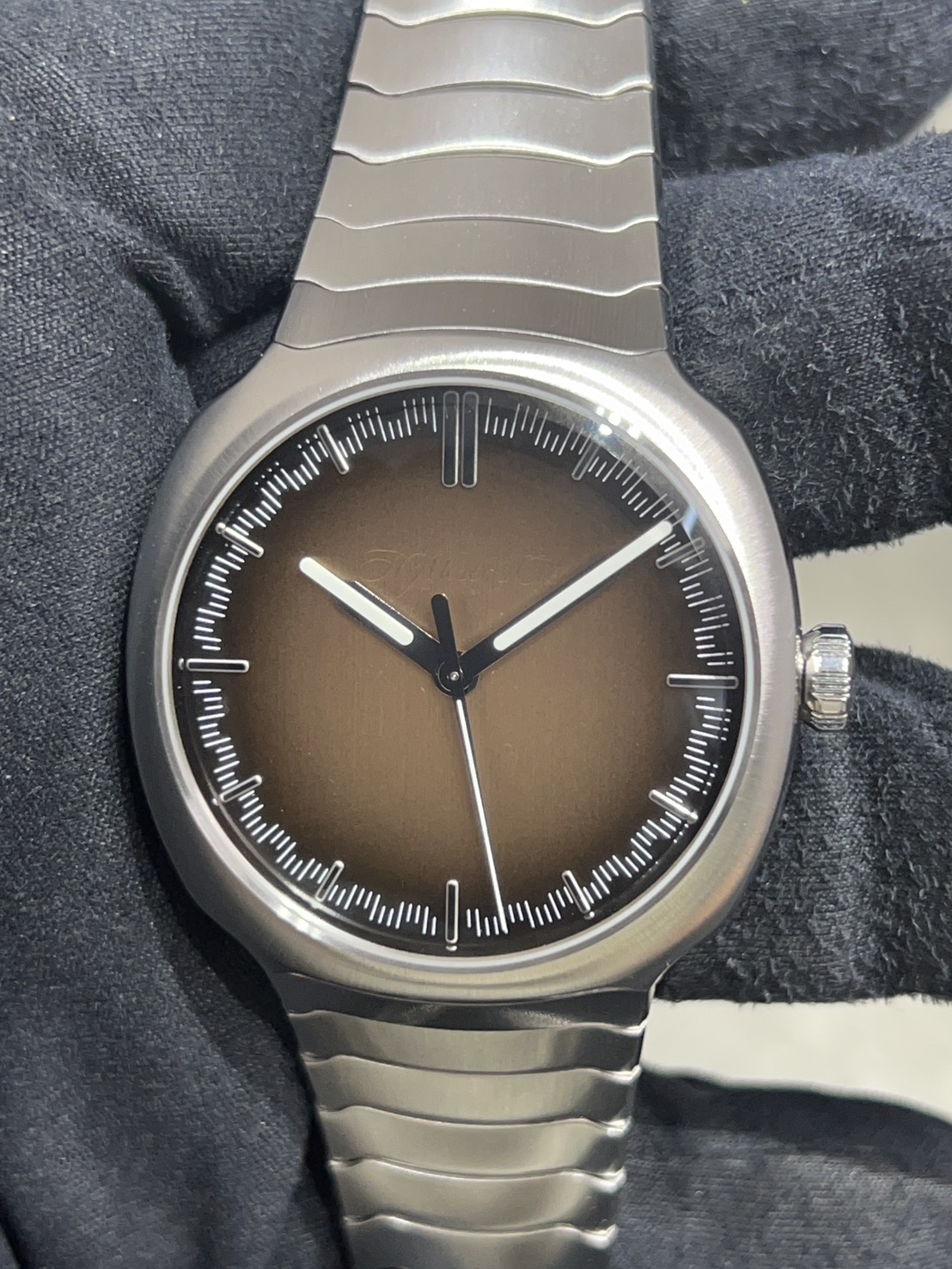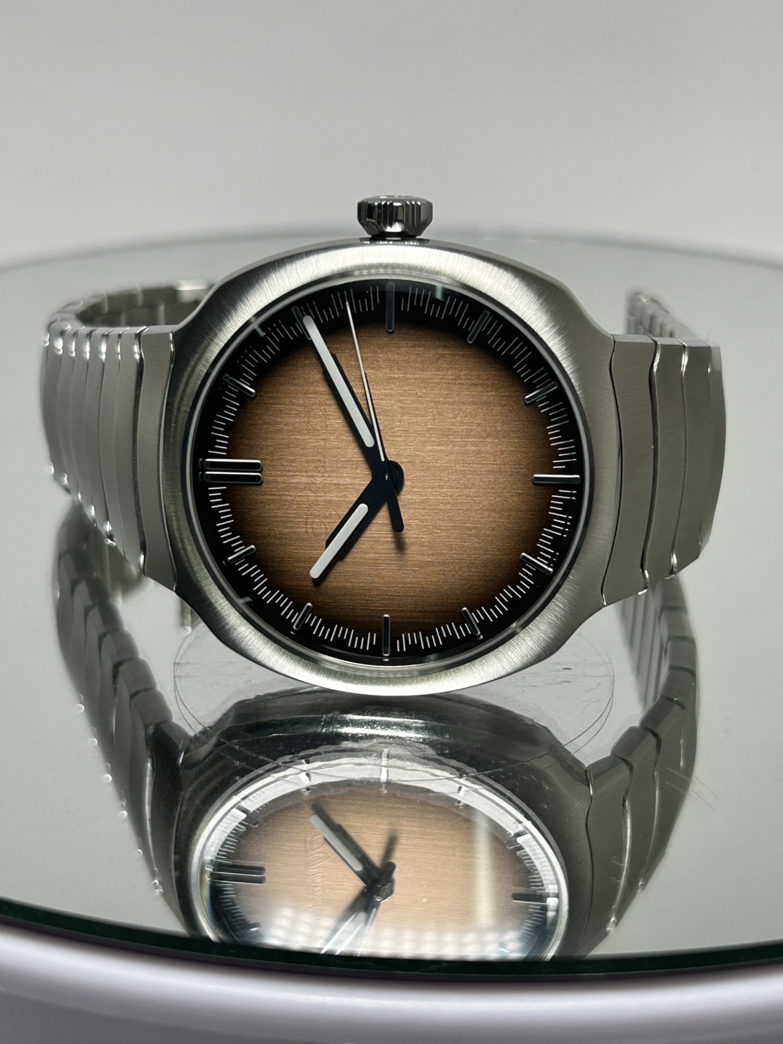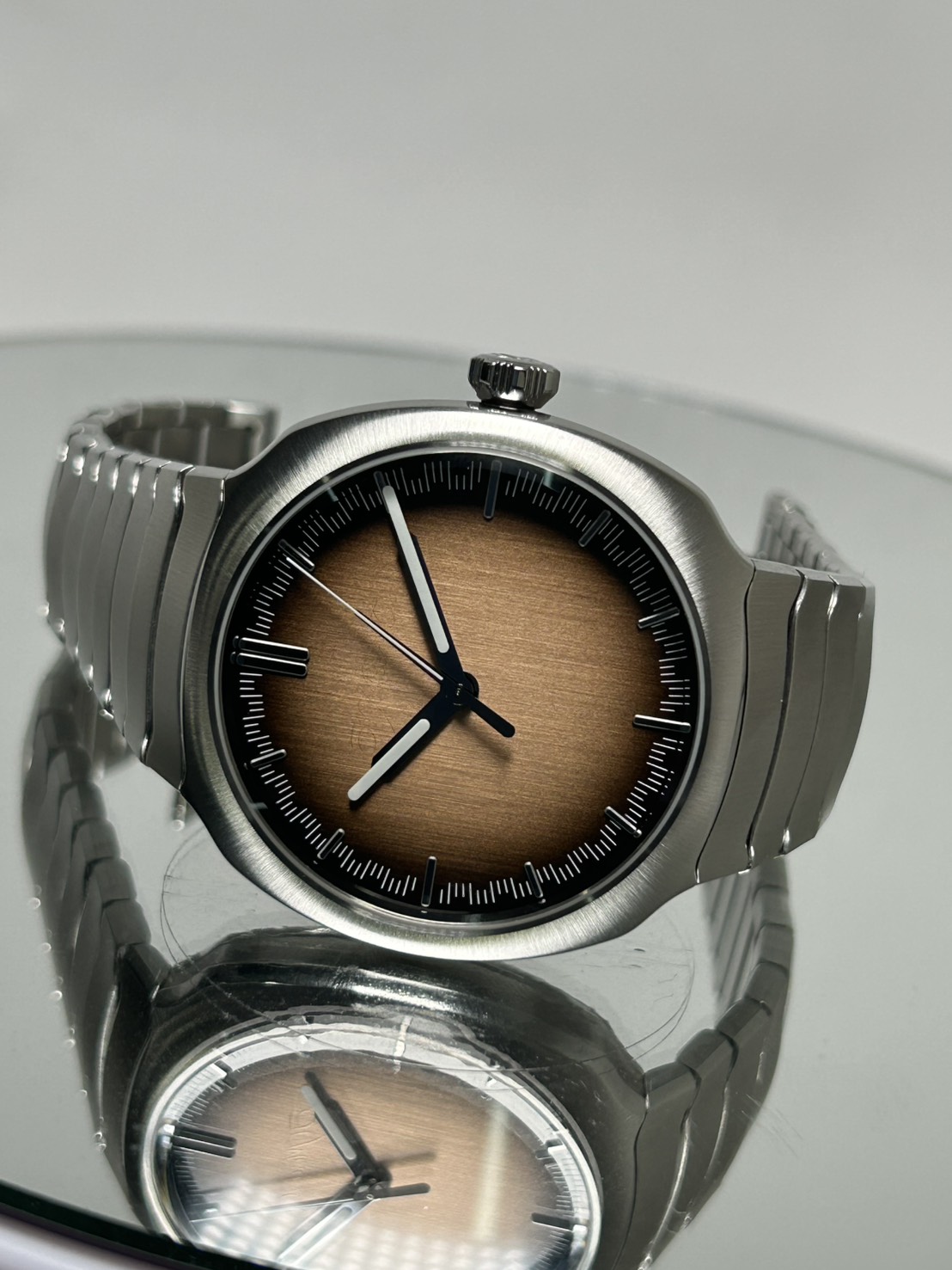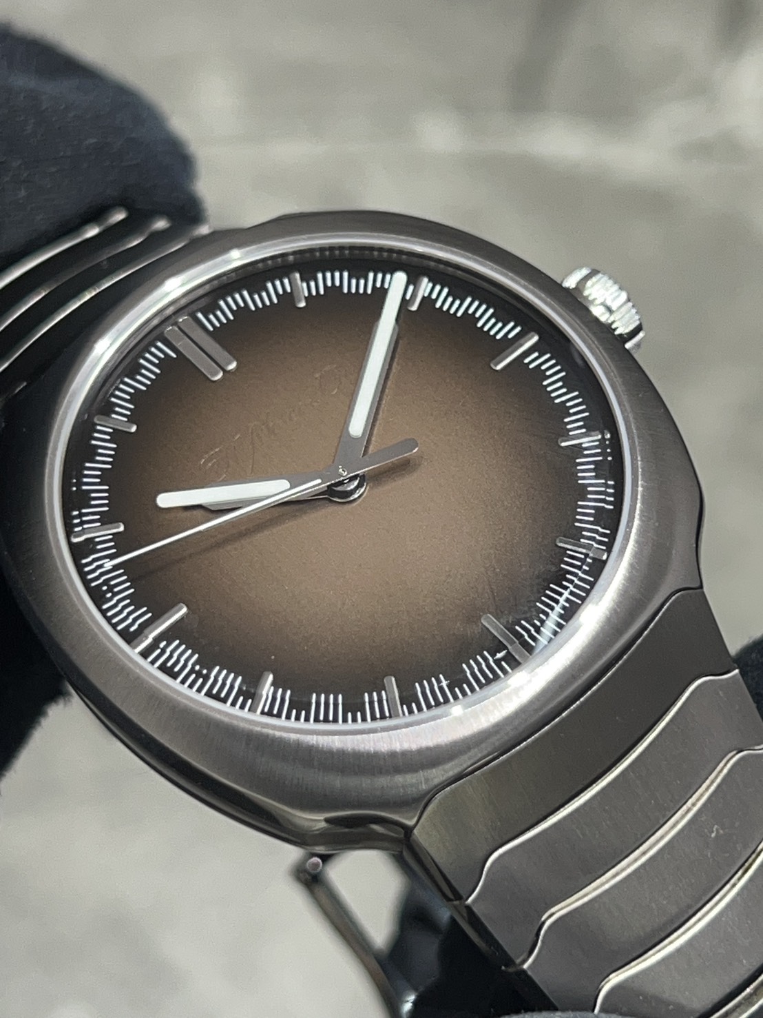 光の当て方でブラック、ダークチョコレート、ゴールドに見えるダイヤルは非常に独創的で美しく特別感ある仕上げとなっております。