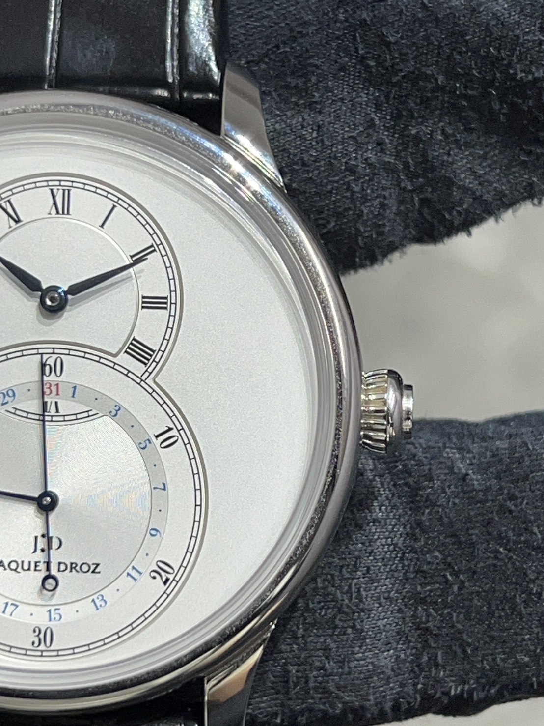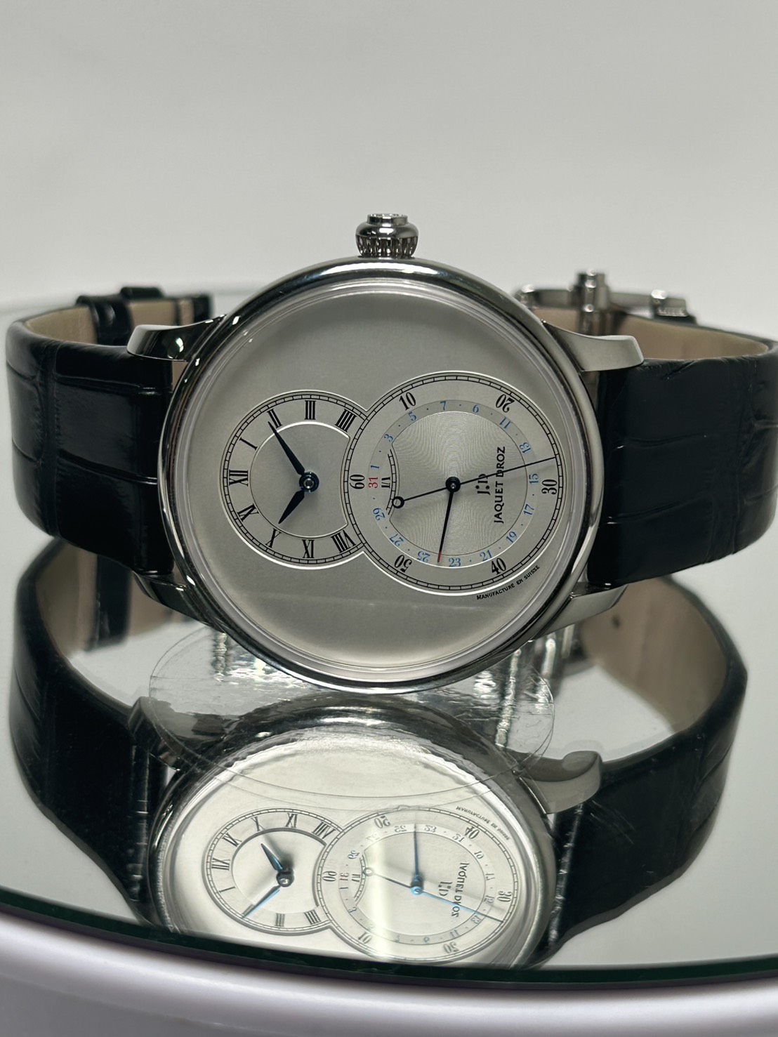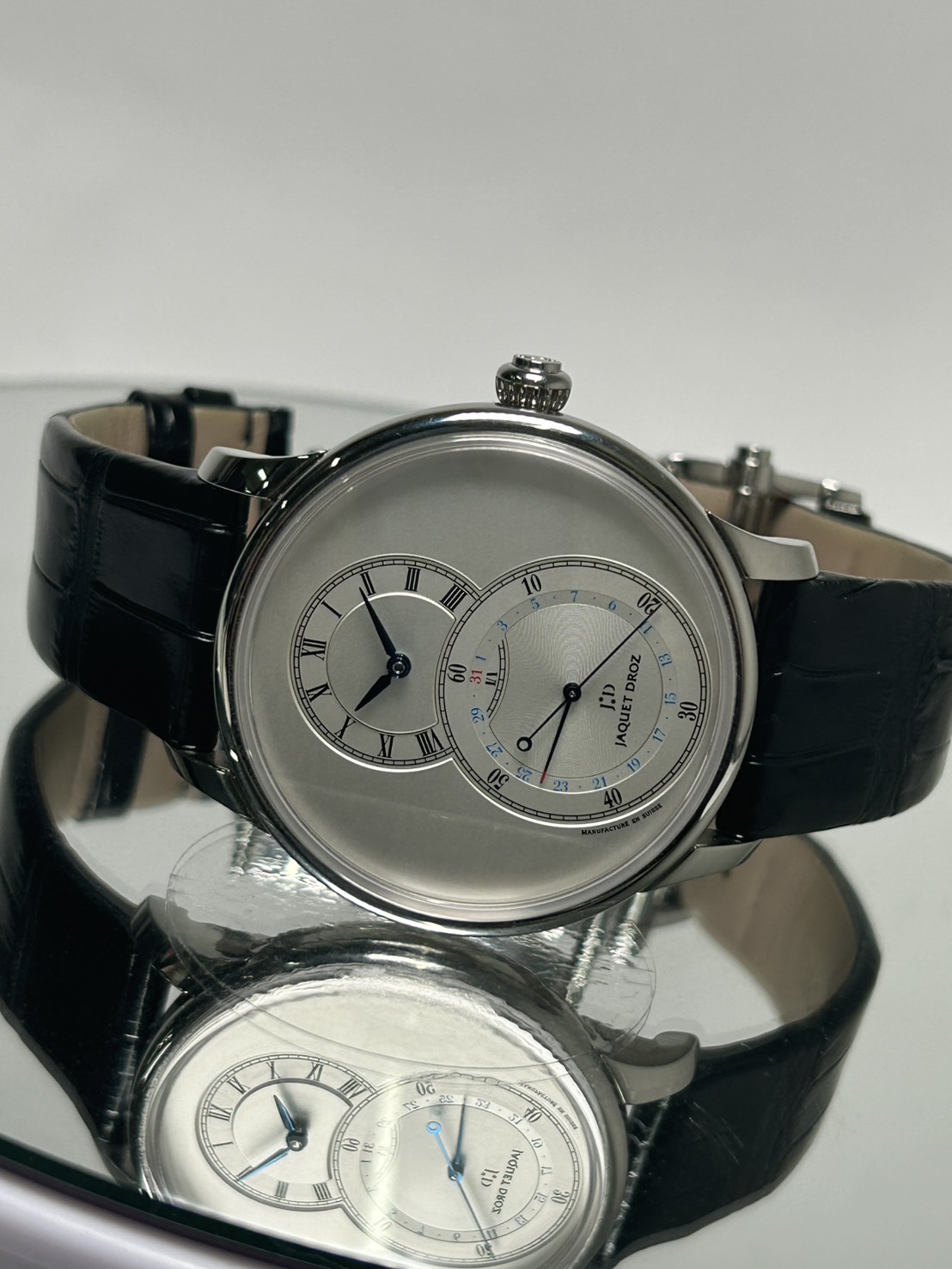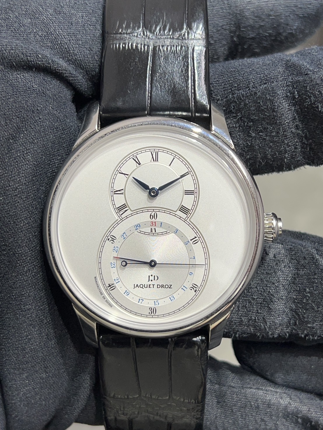 こちらのモデルはブランドの原点とも言える18世紀の懐中時計の思想を象徴した一本になっており、大きな秒表示と時分表示が重なり合う独自の「グラン・セコンド」レイアウトはジャケドローを語る上で欠かせないデザインコードになります。