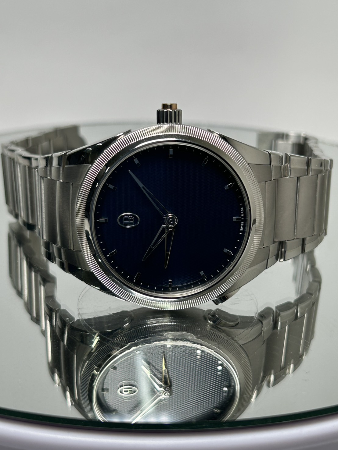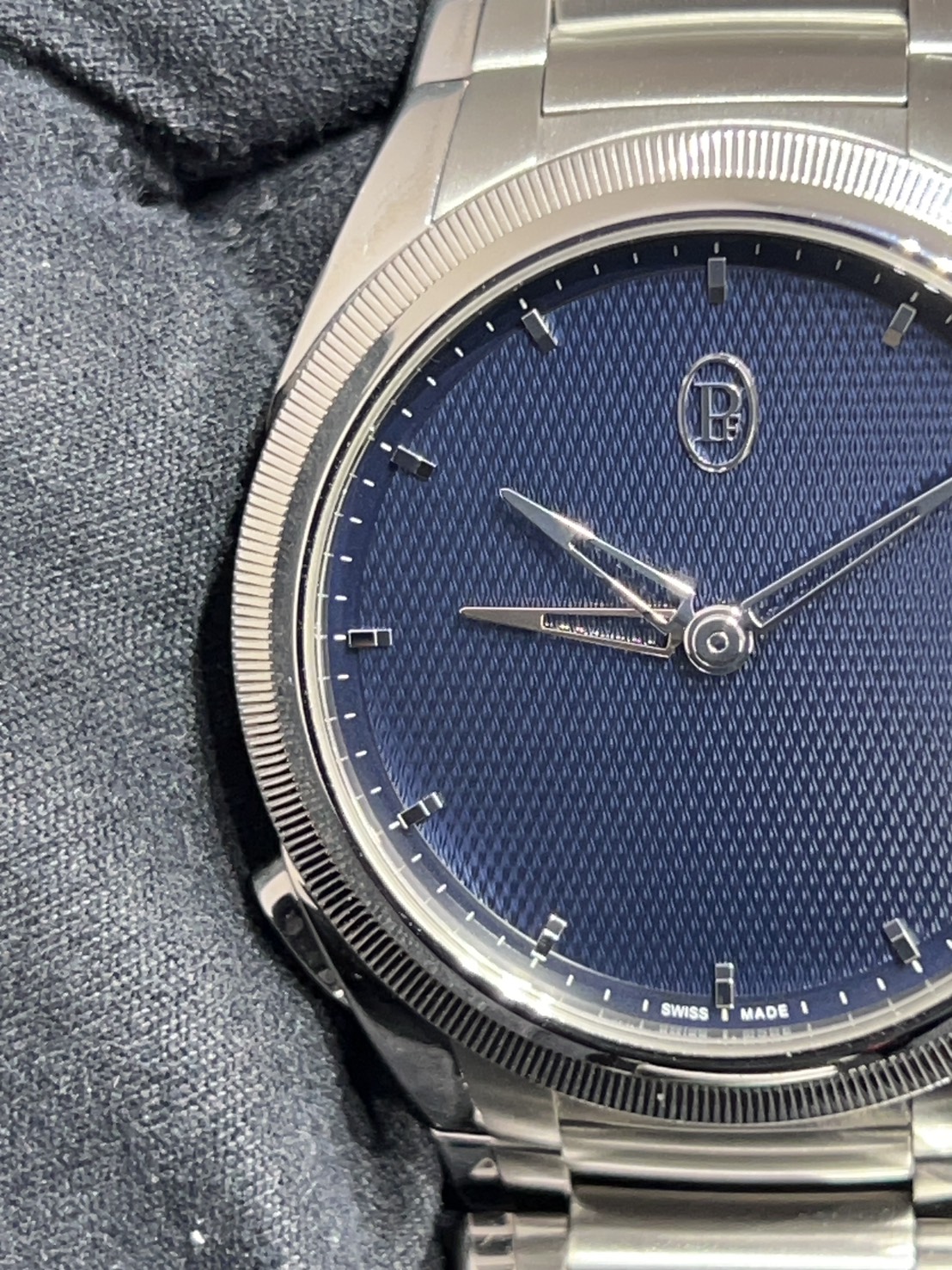 バーリーコーン(麦の穂)パターンのギョーシェにミラノブルーの深い青が非常に美しく角度によって色々な表情を見せてくれてデイトも省かれたシンプルな文字盤は爽やかなミラノブルーの色彩を一層際立たせてくれます。