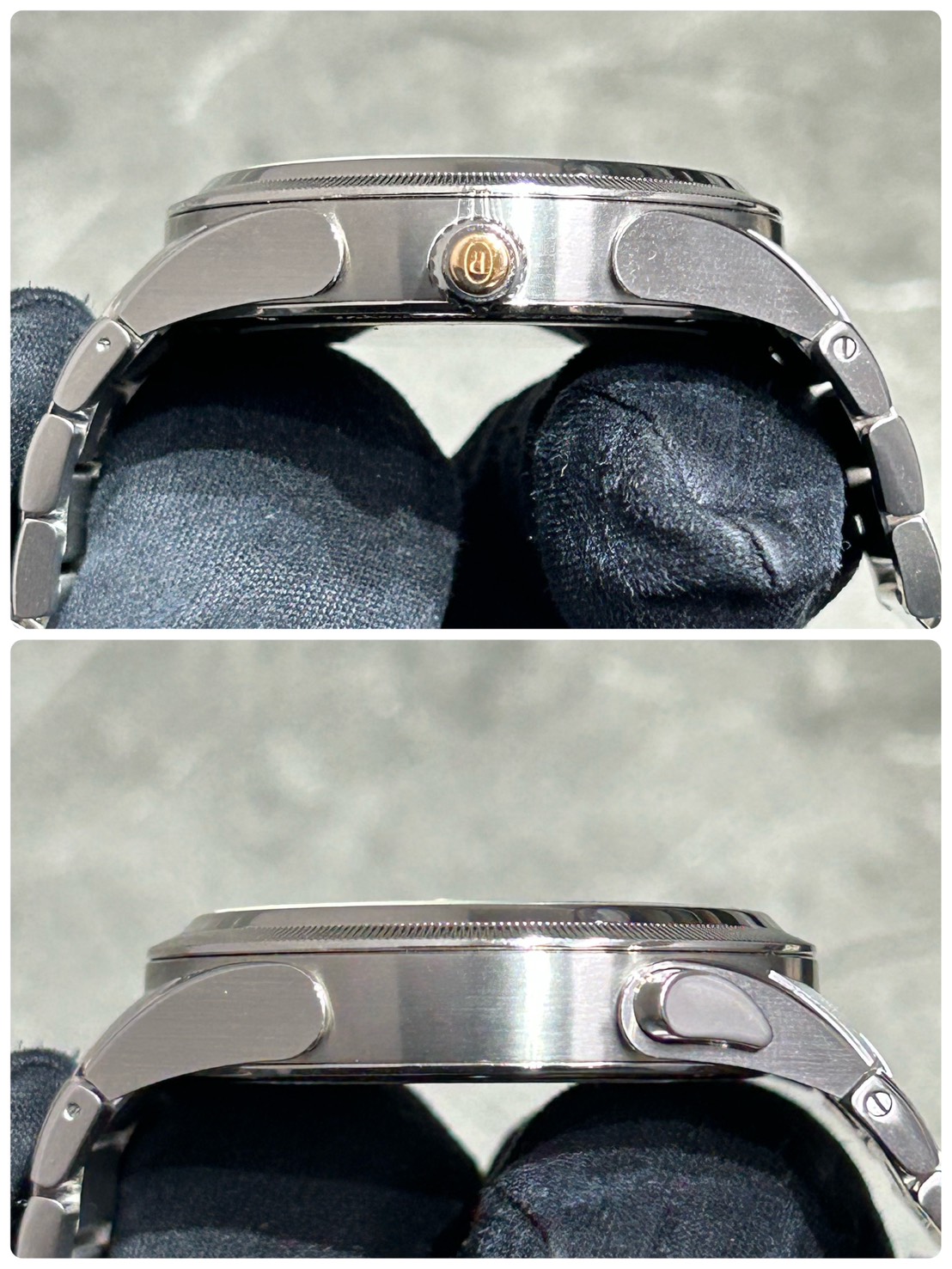 使い方は8時位置のプッシュボタンを押すと、ロジウムめっきゴールドのローカルタイム針が一時間進み、ローズゴールドの針が顔を出し第二時間帯が不要になったらリューズ一体のローズゴールドの針を押す事でローカルタイム針と重なります。