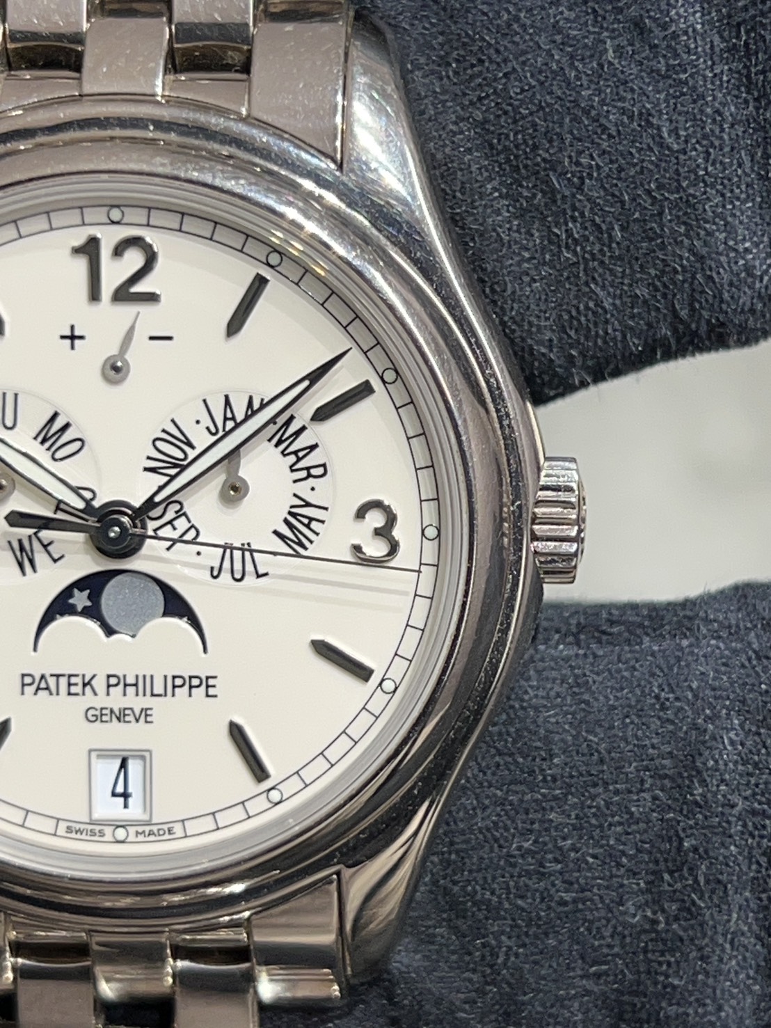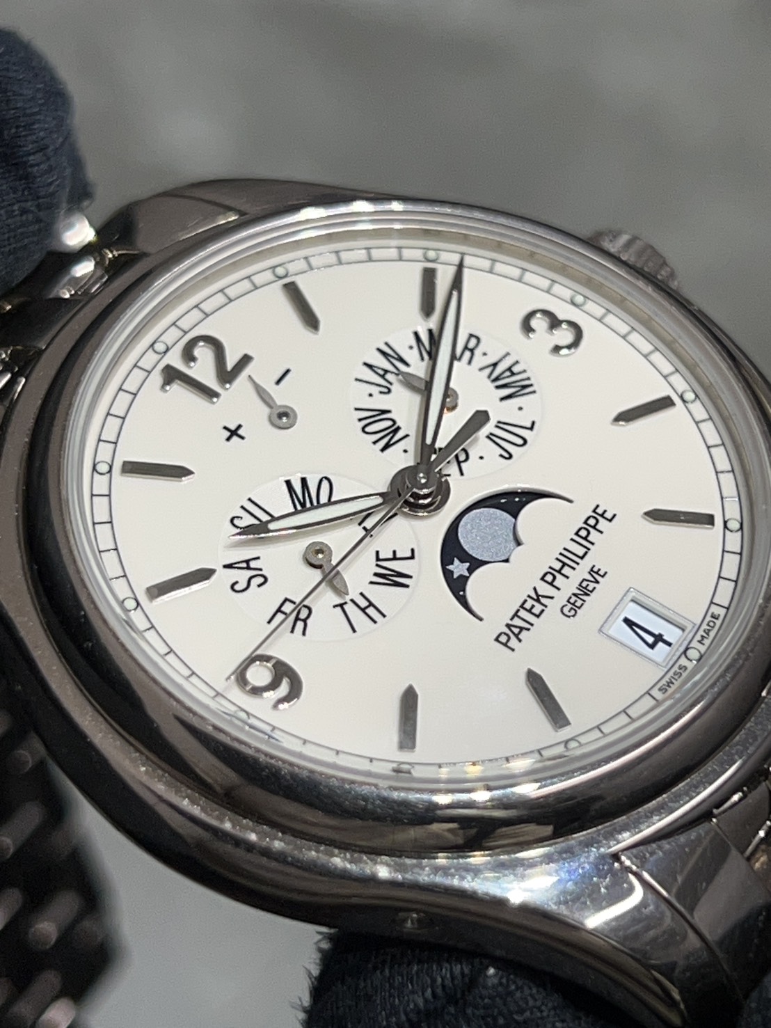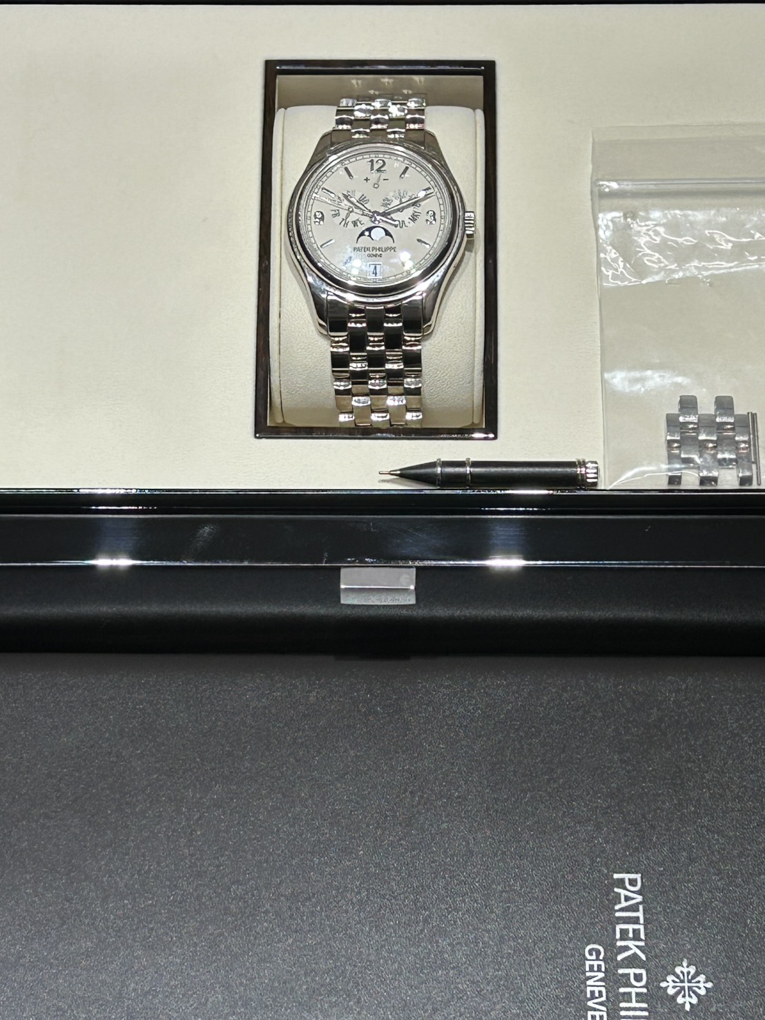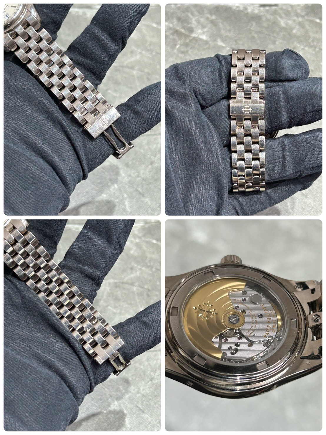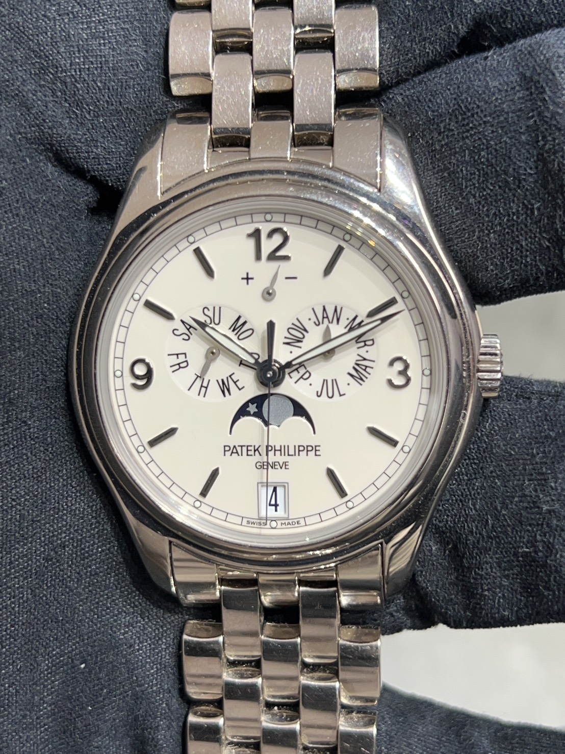 パテック・フィリップが開発した「年次カレンダー(アニュアルカレンダー)」機構を搭載したコンプリケーション(複雑機構)モデルで、ホワイトゴールドケースに5連リンクのブレスレット(ウェーブブレスレット)が特徴の、実用性と上品さを兼ね備えたモデルが入荷致しました。