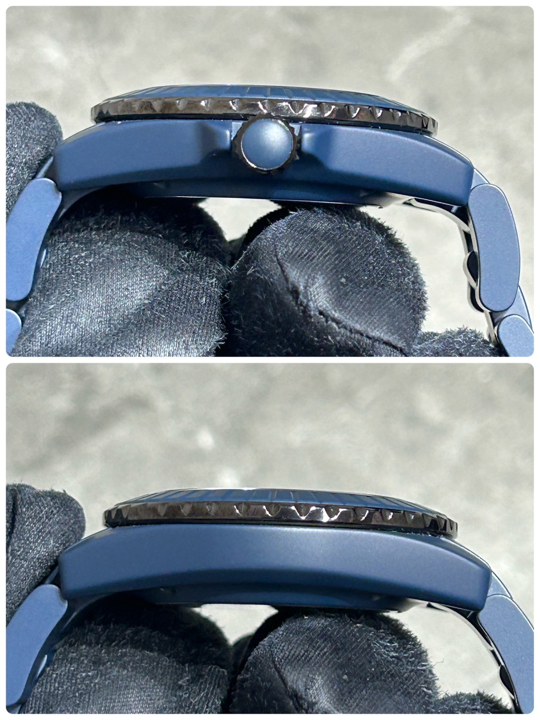ケース、ブレスは新作のマットブルーセラミックに加え、ベゼルインサートもセラミック製で一新されており華やかさが増しております。