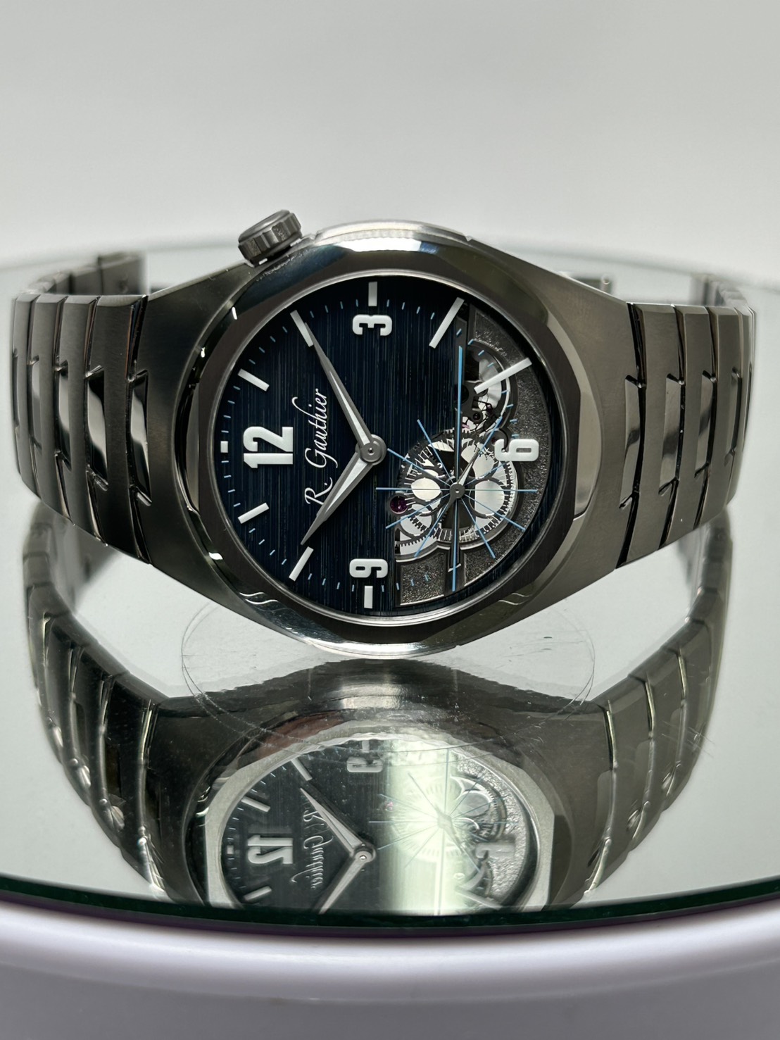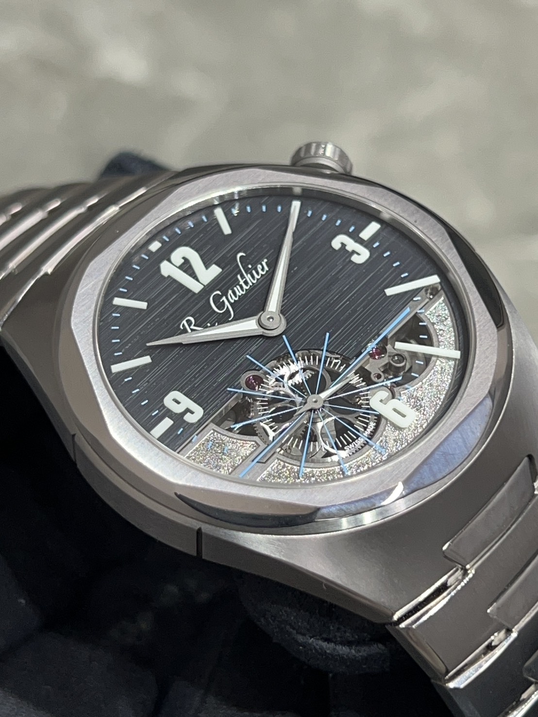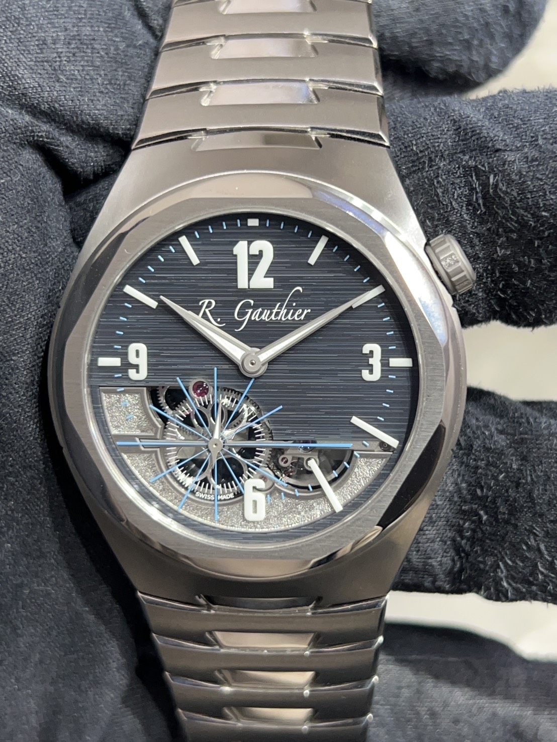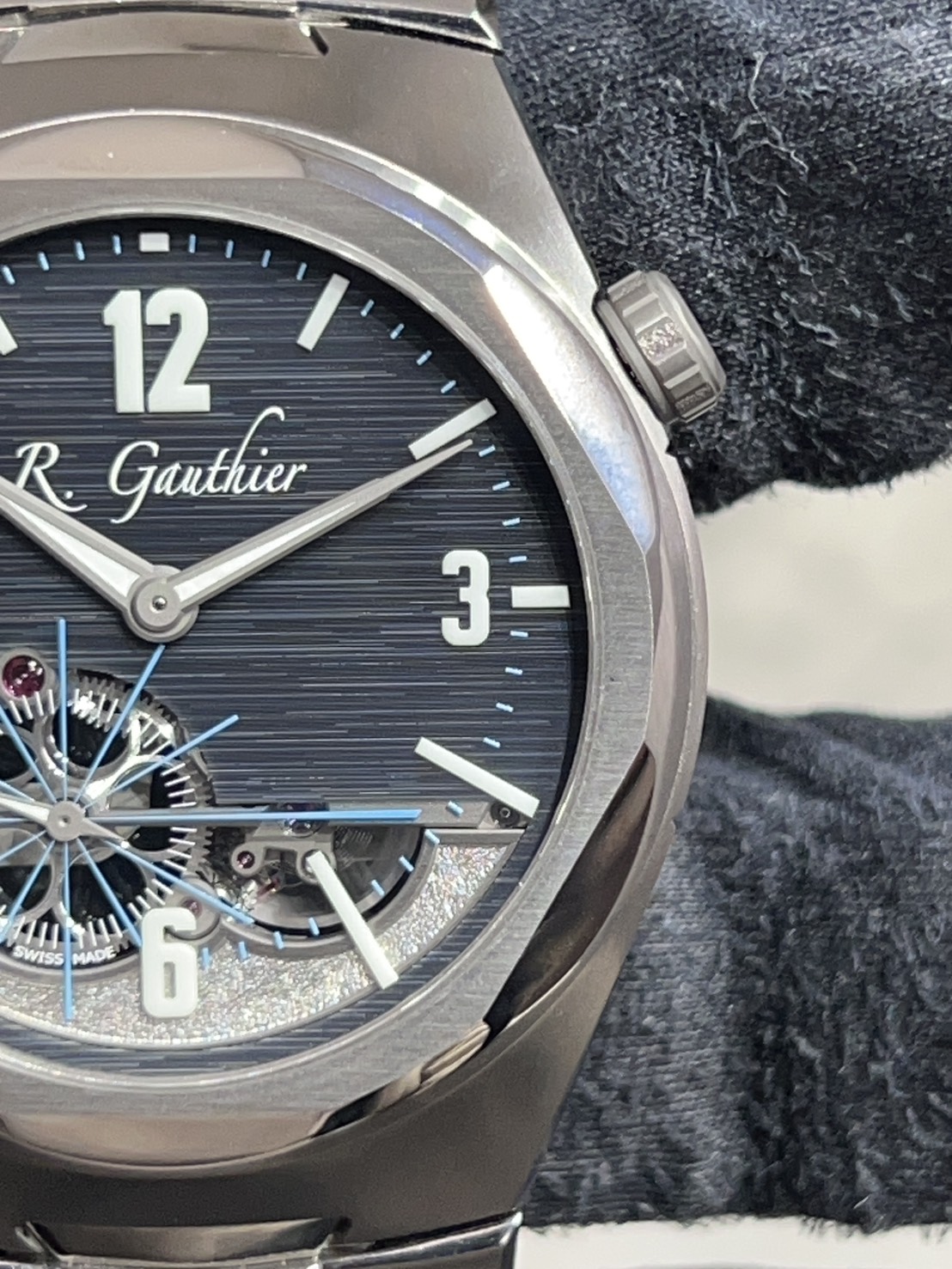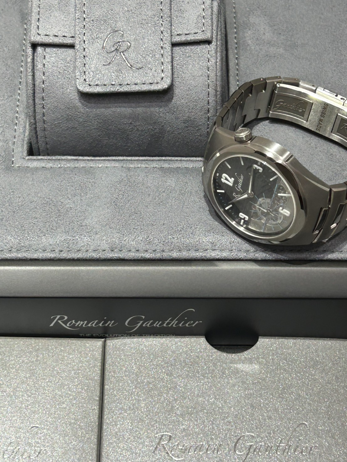 視認性に優れたオフセンターの時・分表示、7時位置のスモールセコンドに加え、細部まで行き届いた仕上げは ローマン・ゴティエならではのクラフツマンシップ を感じさせます。