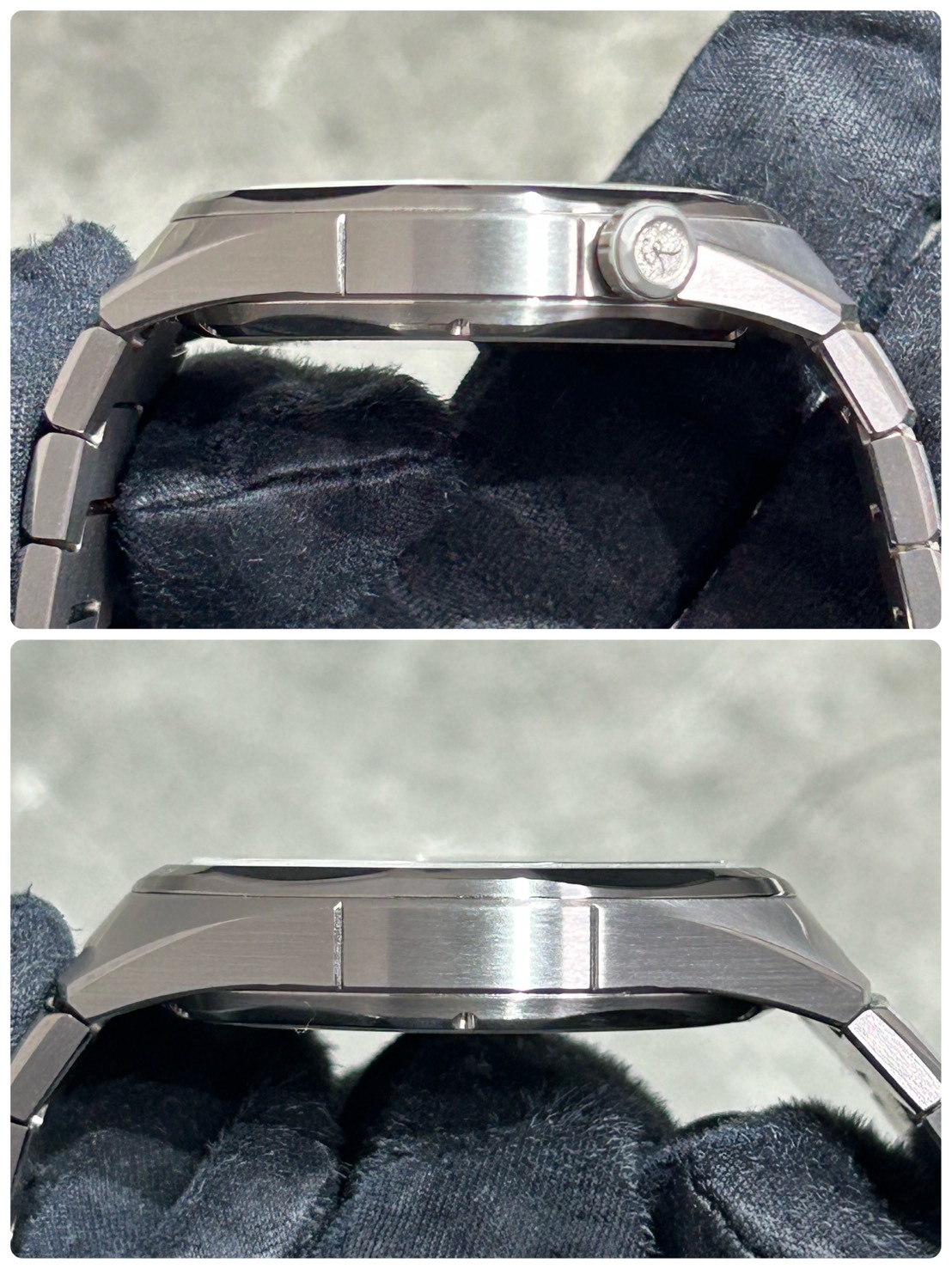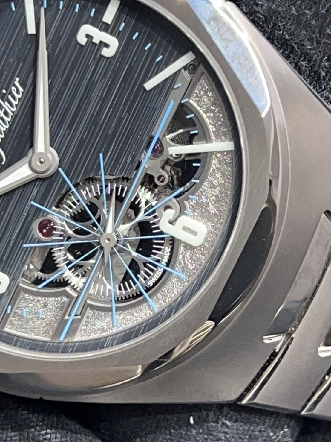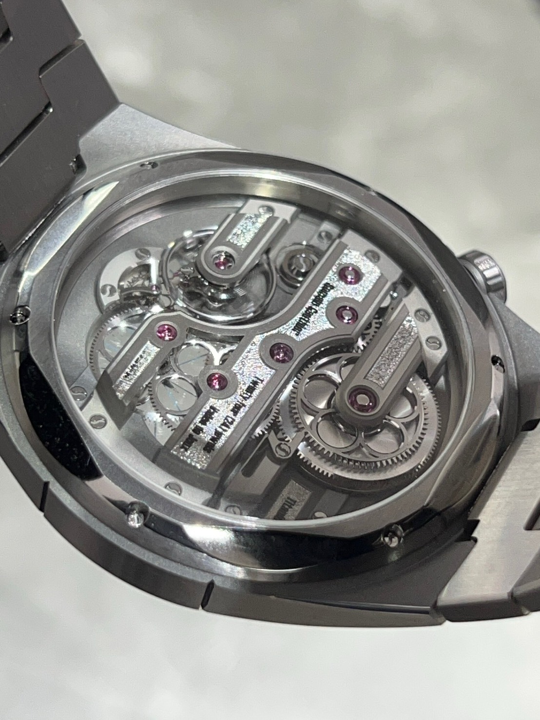 ケースは41㎜グレード5ナチュラルチタン製となり厚みは10㎜以下と使い勝手が非常に良く、文字盤はオープンワーク構造により手巻きムーブメントの精巧な機構を間近に鑑賞できる設計になっております。