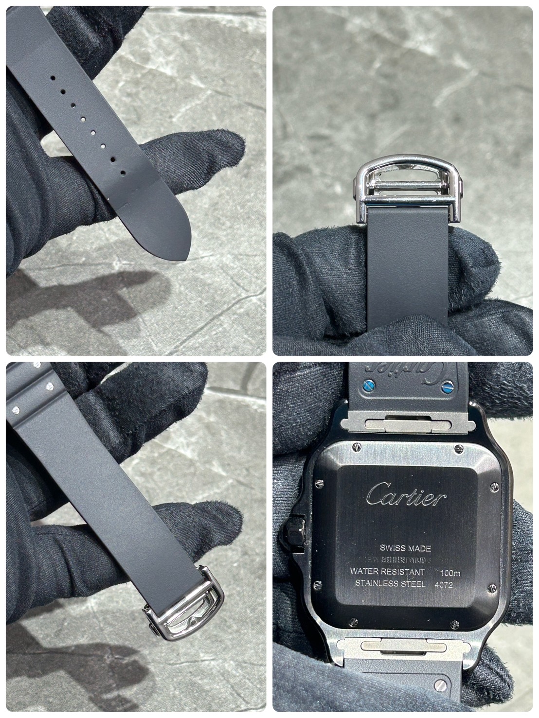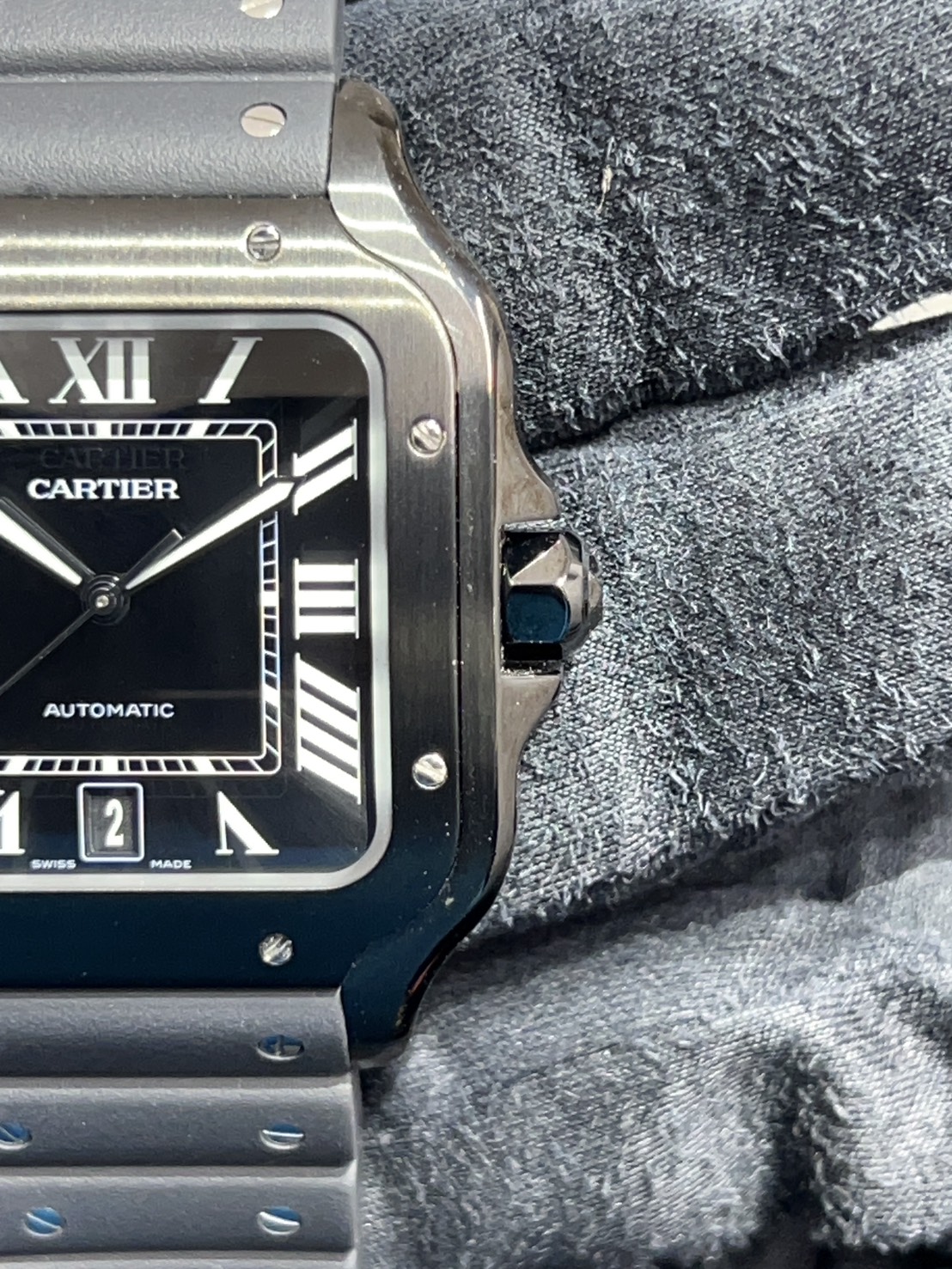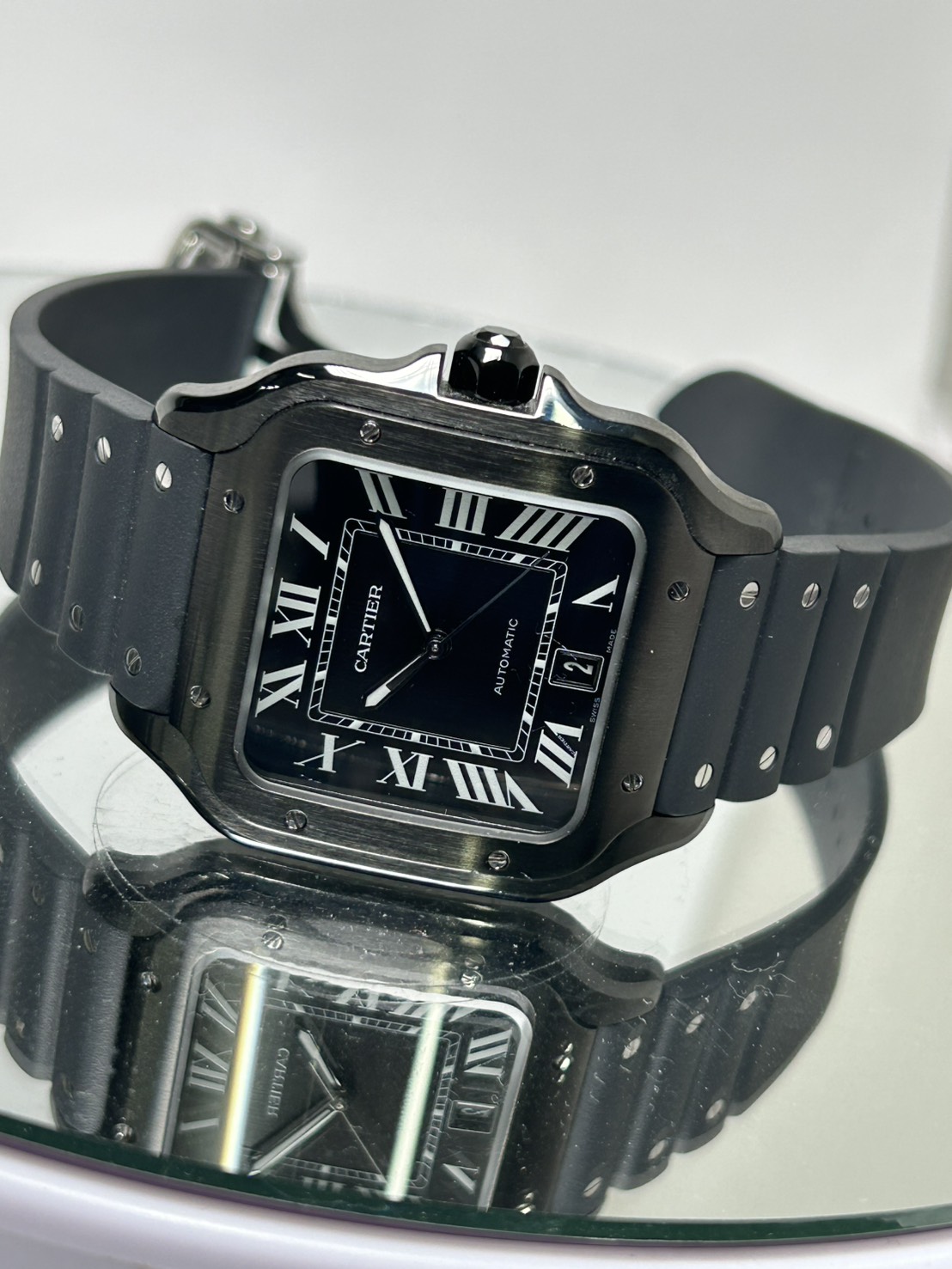 パリの街並みからヒントを得た四角い形をしているサントス ドゥ カルティエ、こちらはADLC加工が施されたブラックのステンレスケースでスポーティなモデルになります。