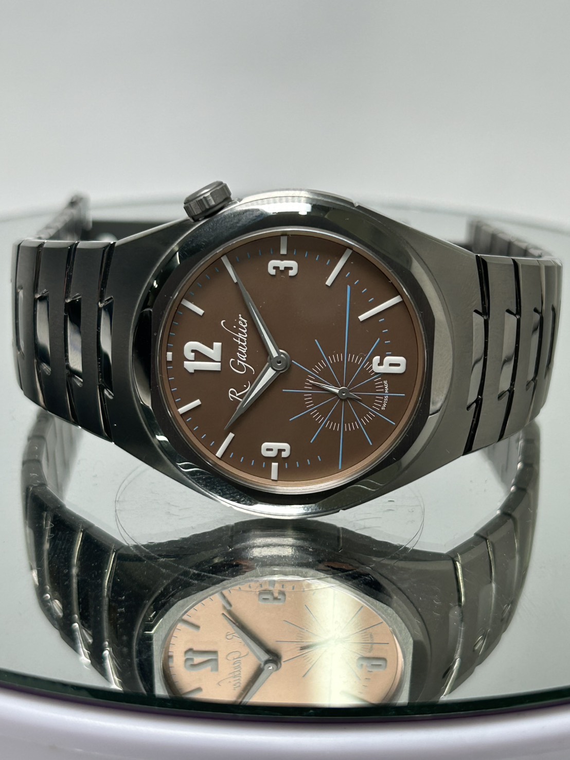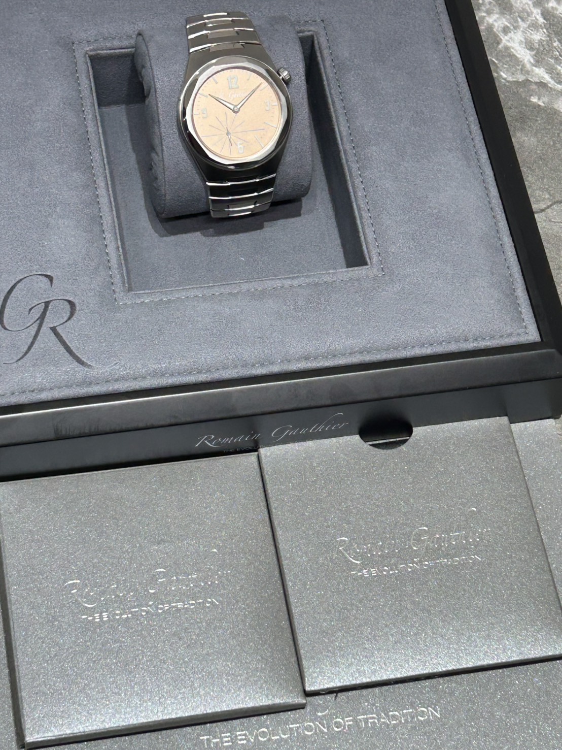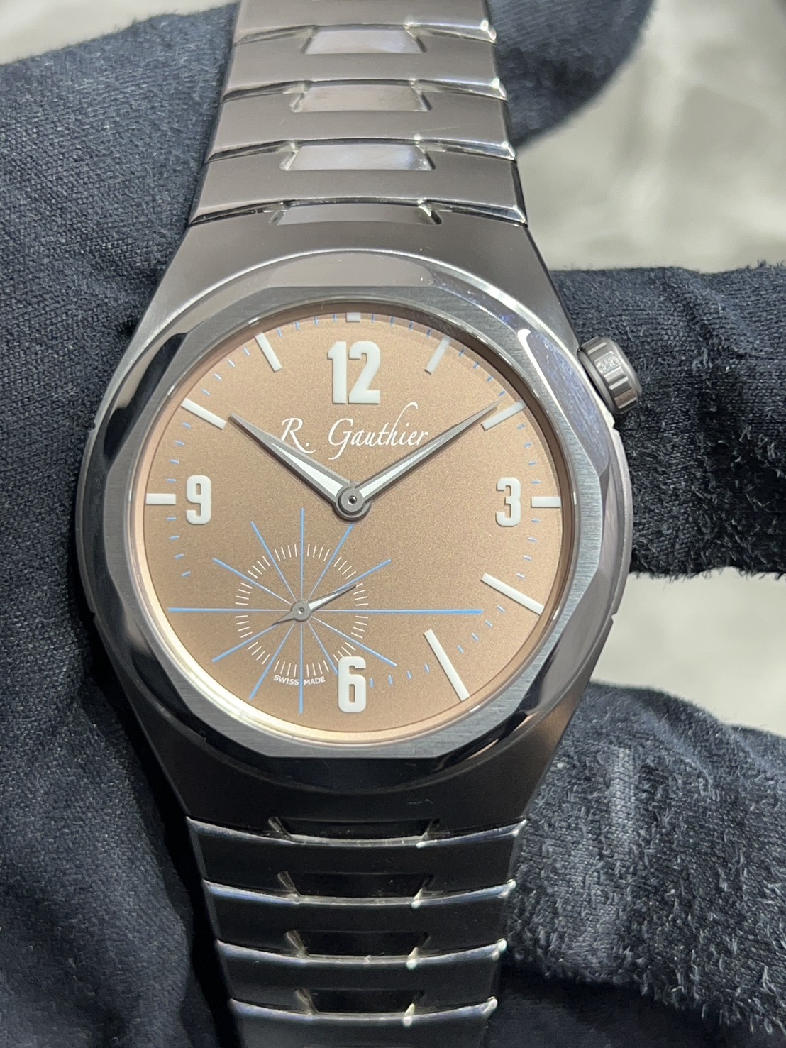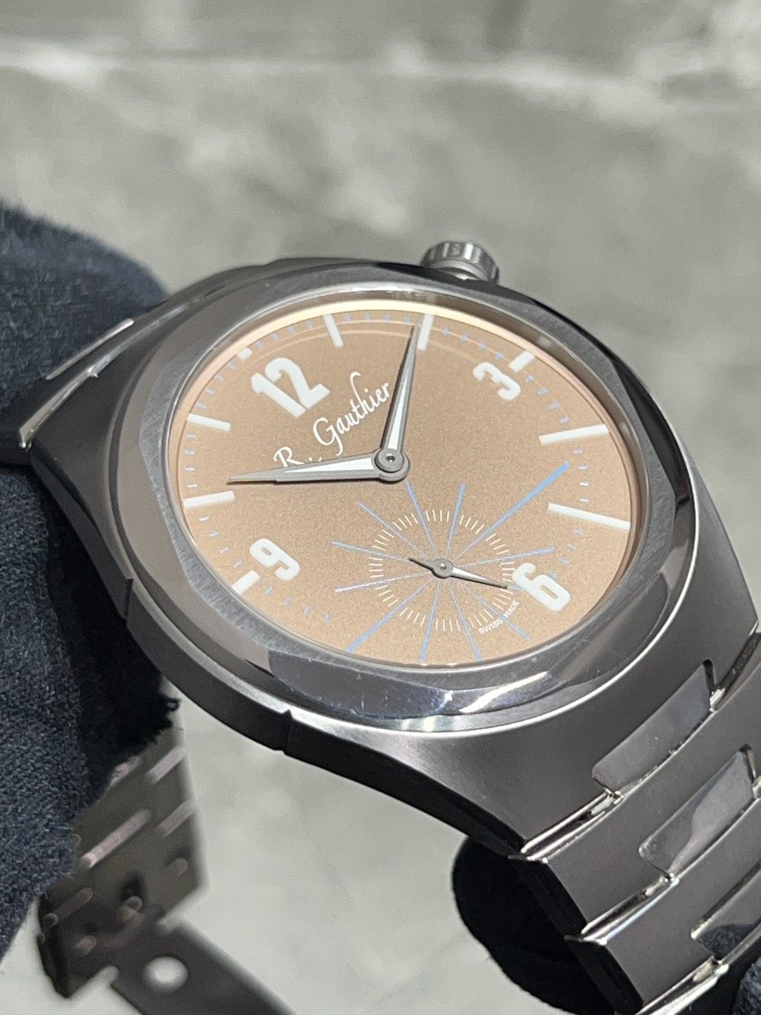 ローマン・ゴティエ、2005年創業のスイスの高級時計メーカーでその中で今回はユニークなレイアウトで6つのファセットを備えた、幾何学的なベゼルがセットされるコンティニュアム チタンブレスレットが入荷致しました。