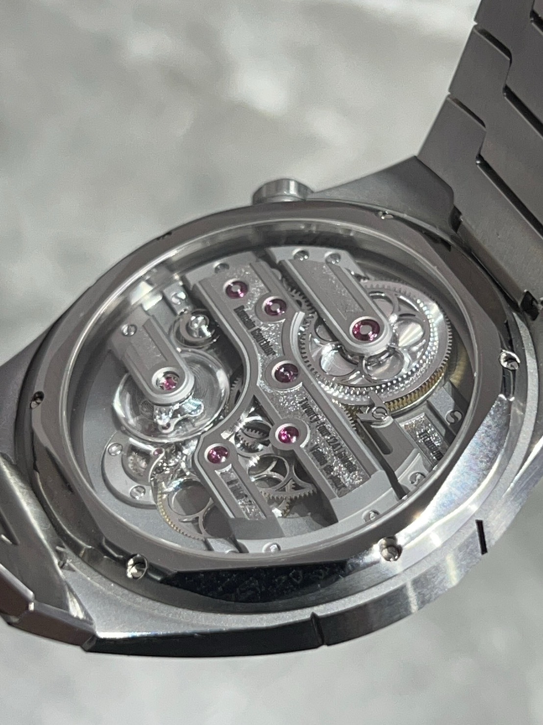 文字盤は上方向へオフセットされており独特の雰囲気で18金ホワイトゴールドの針は先端が他の針に接触しないよう加工され、ギリギリを通る様セットされております。