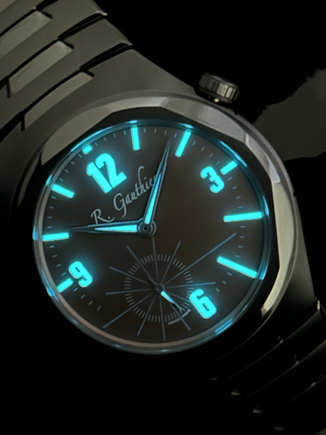 チタンの造形には目を奪われるものがあり、傾斜が付いたラグの光の移動はうっとりするほどでベゼルにも6か所の傾斜を付け袖口に引っ掛かりづらく総重量約85gというのも相まって装着感も抜群でございます。